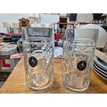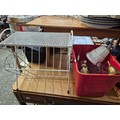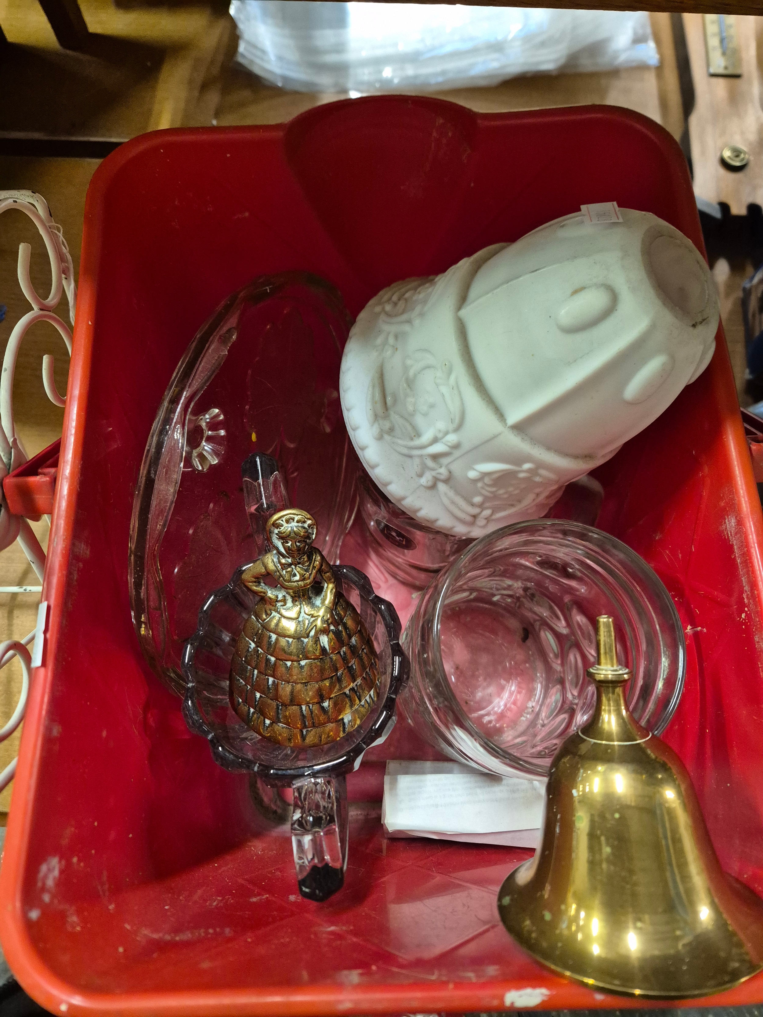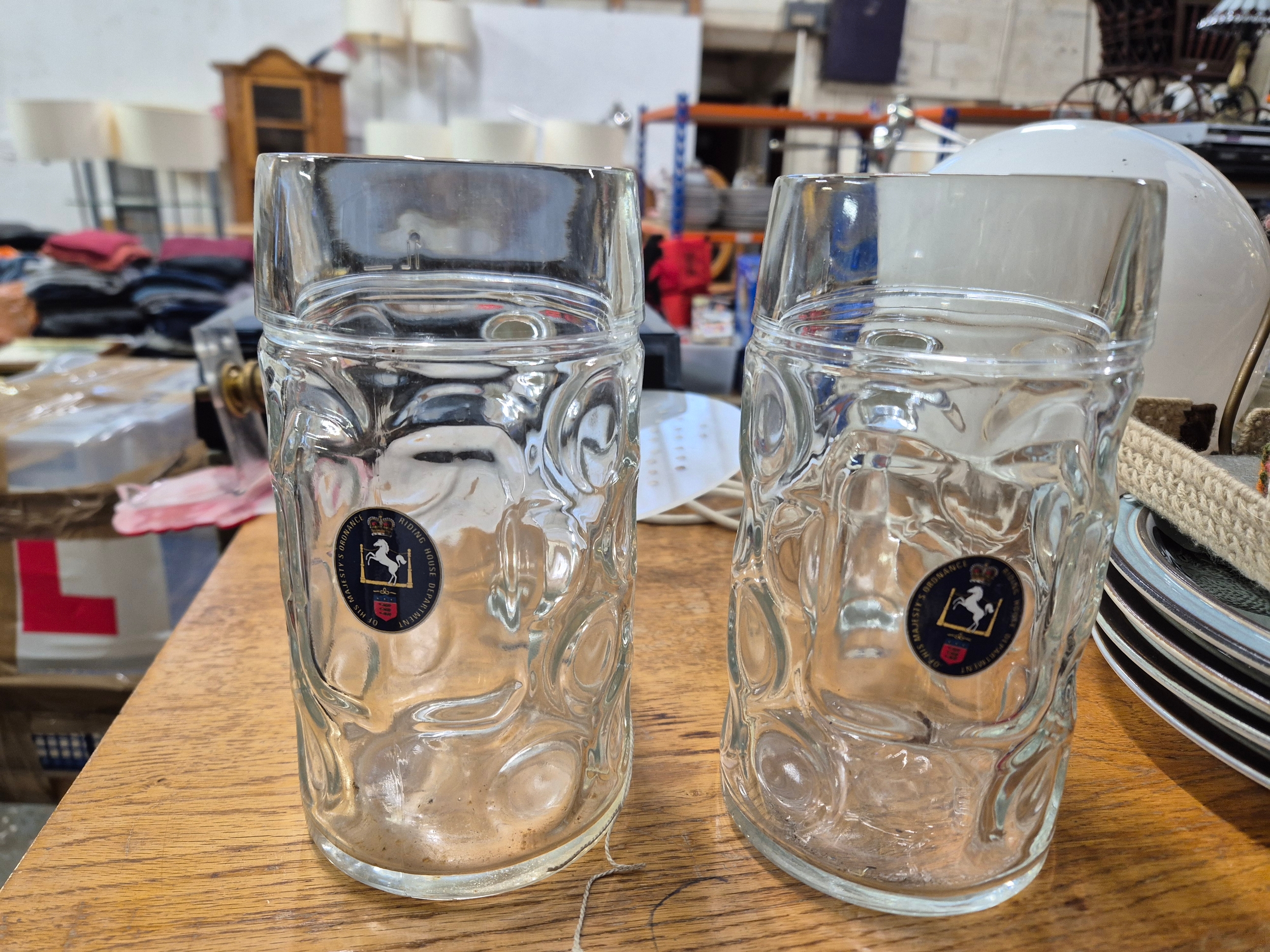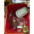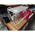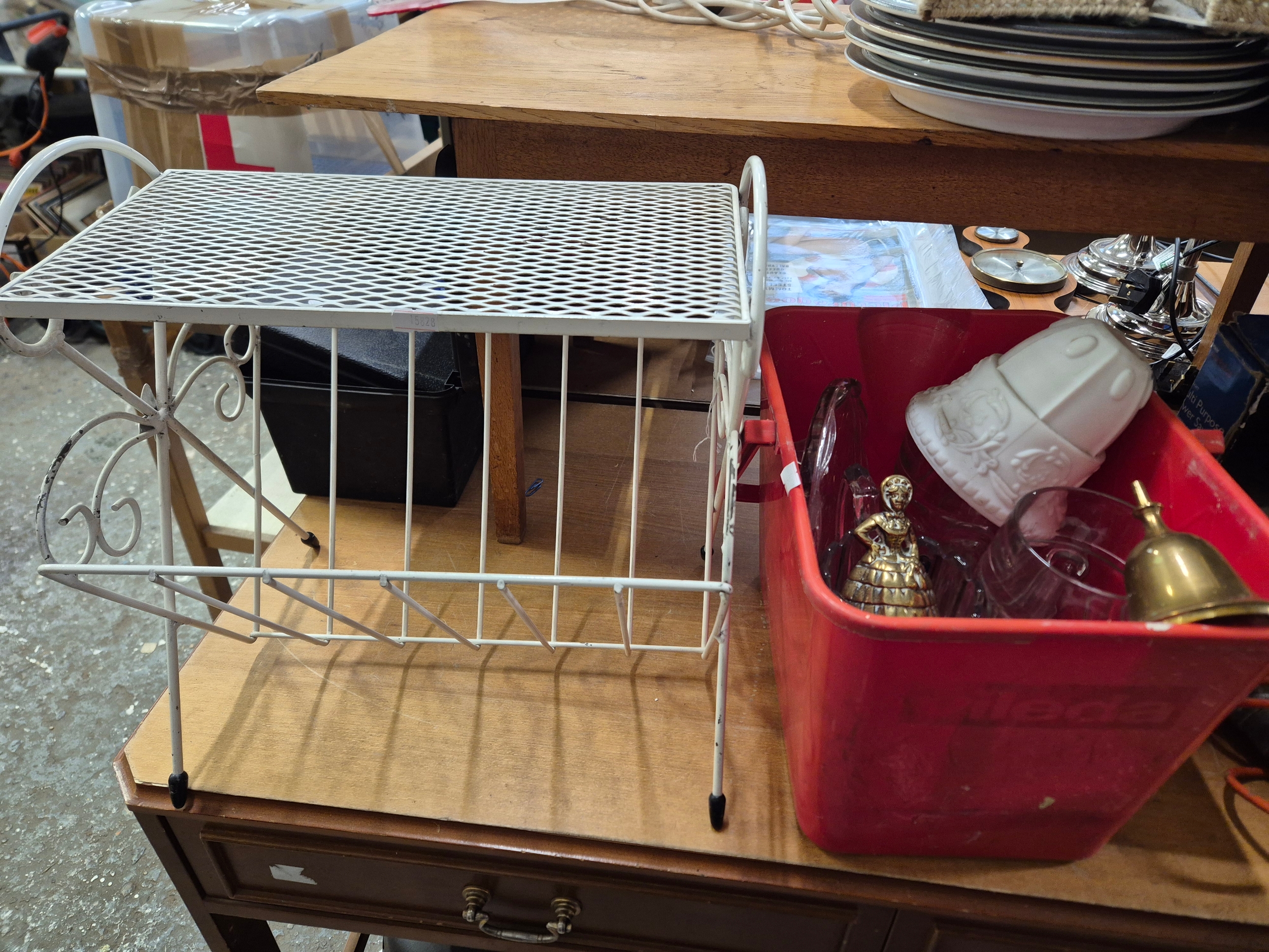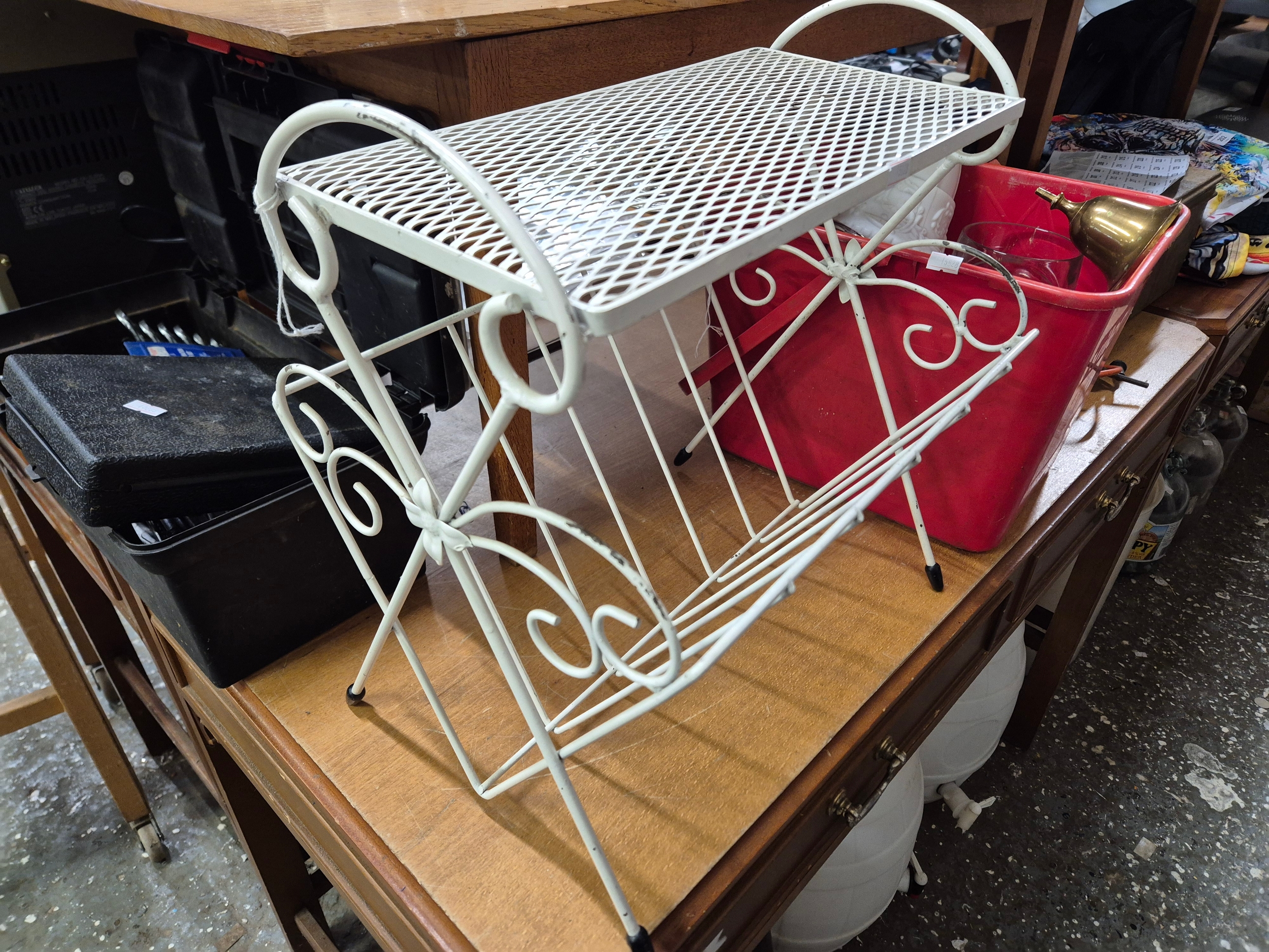 Metal magazine rack side table and a box of mostly glass tankards etc plus some brass
