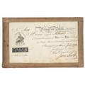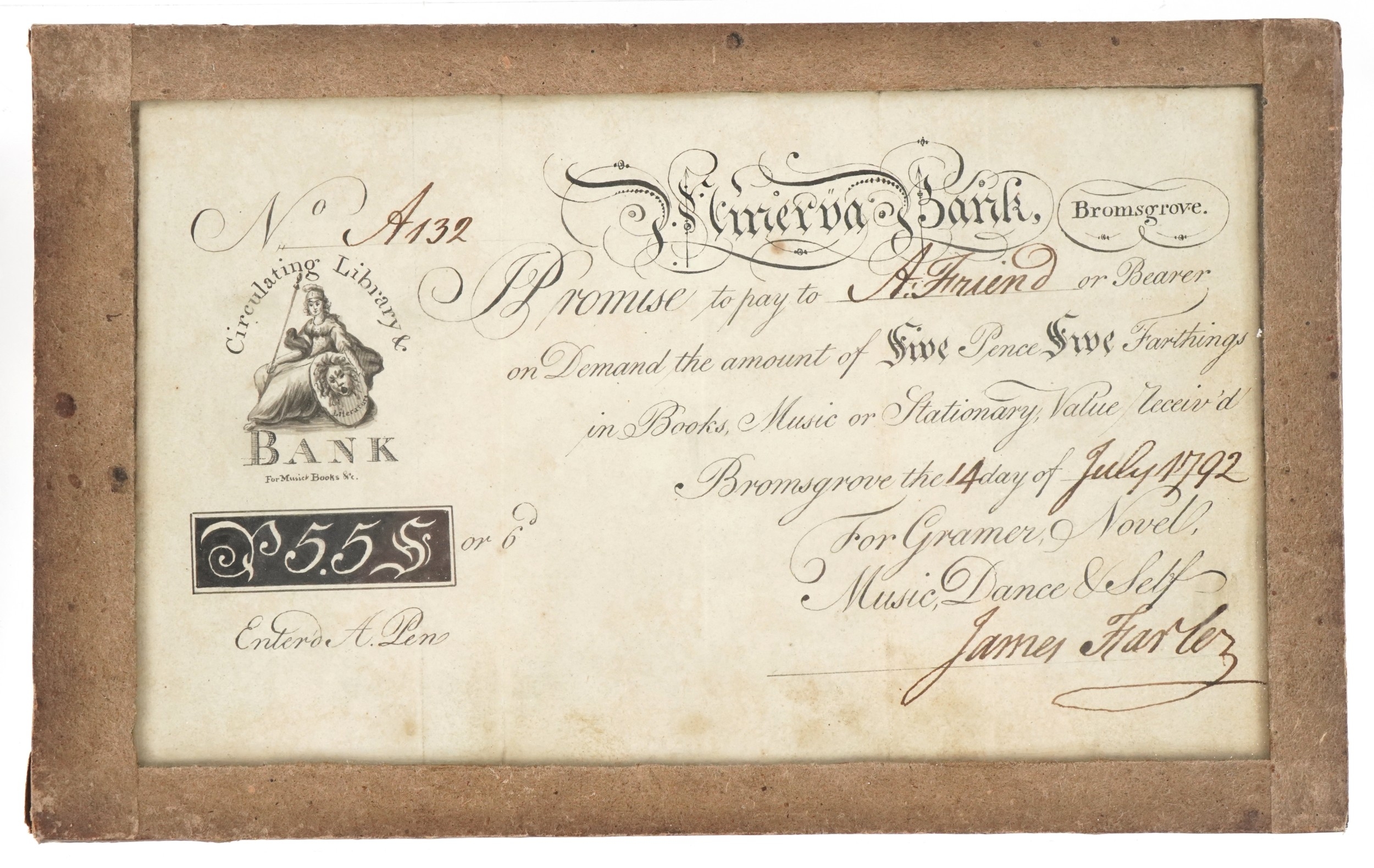 An 18th century Circulating Library and Bank in Bromsgrove manuscript bill of sale promising to pay the bearer five pence and five farthings for books, music or stationery, dated 14th day of July 1792, signed by James Harley.