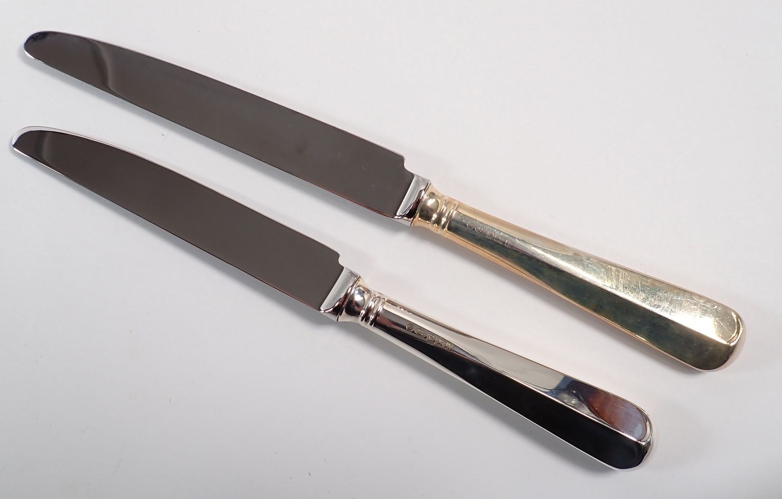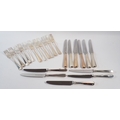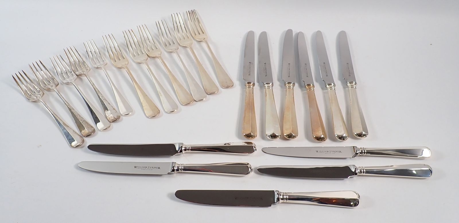 A silver cutlery set by William Turner comprising six silver handled dinner knives, five silver handled dessert knives, six silver dinner forks and five silver dessert forks, weighable silver 707g