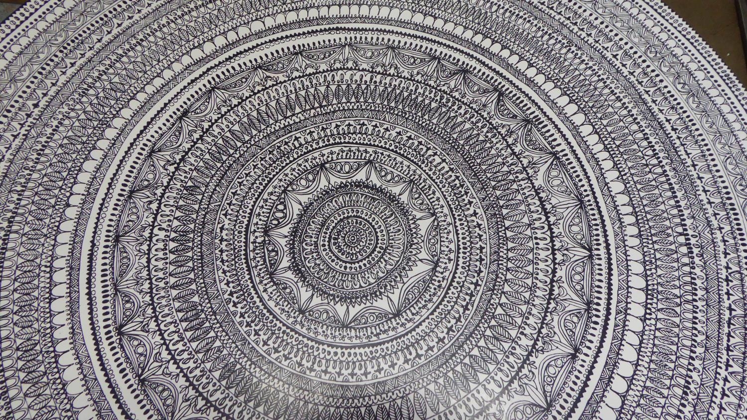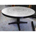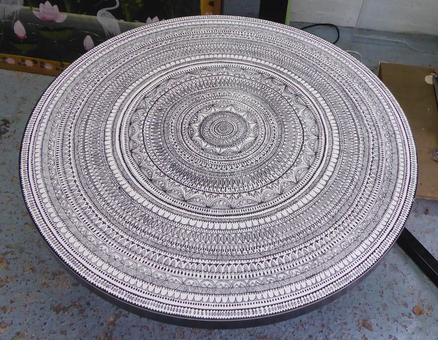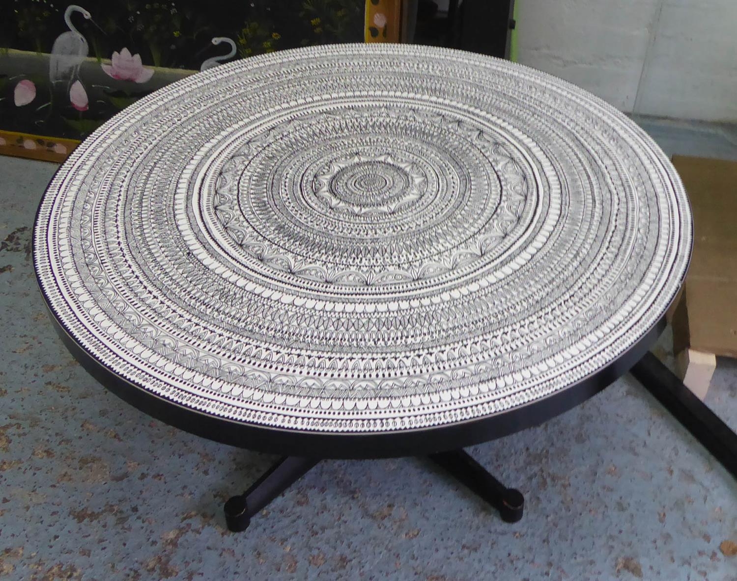 LOW TABLE, with a circular black and white Spirograph top, 91.5cm diam x 50cm H.
