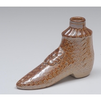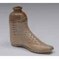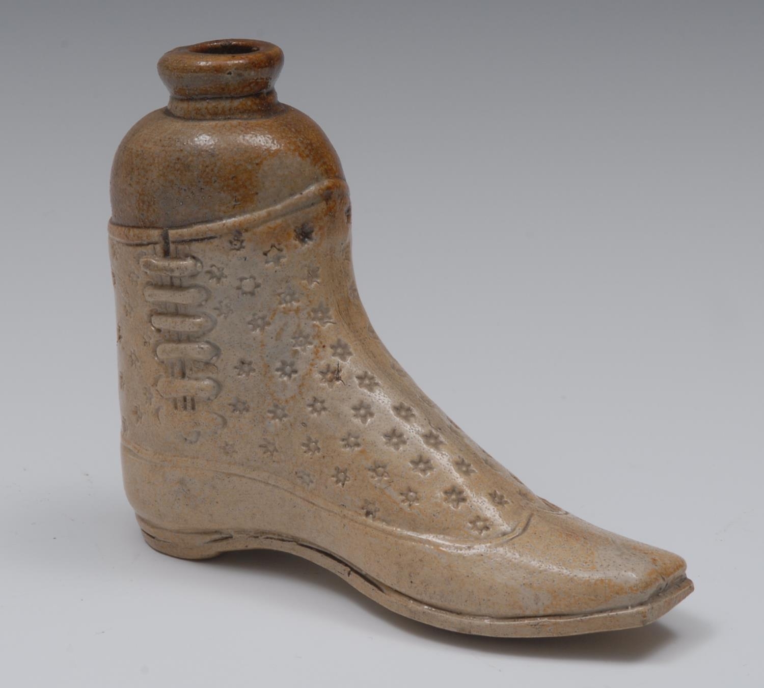 A 19th century brown salt glazed stoneware gin flask, in the form of a boot, impressed with stars, 21cm long, impressed 188 Bishopsgate, Sowerby, c.1840