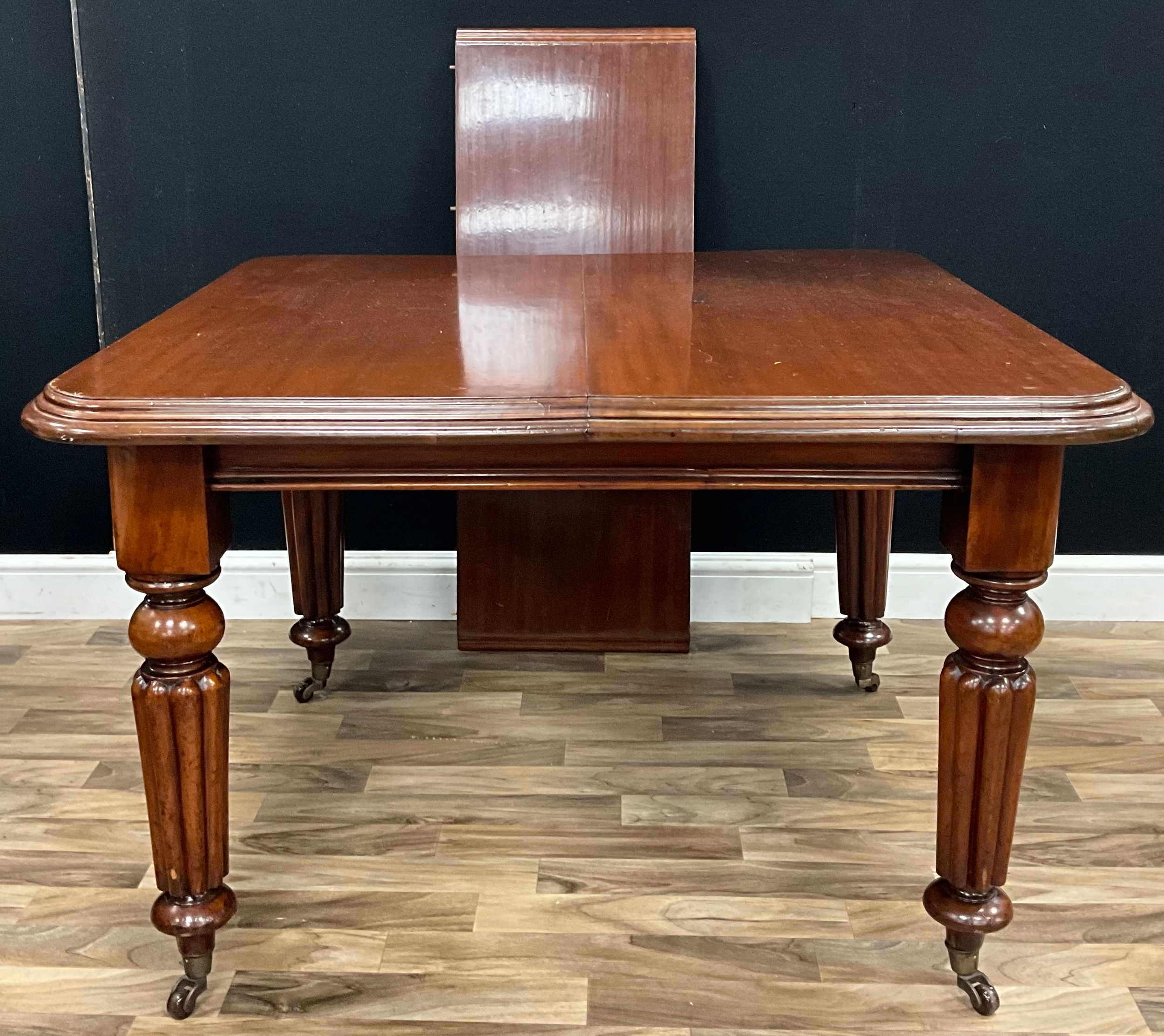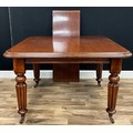 A Victorian mahogany extending table, moulded edge, turned and reeded legs, 71cm high, 110cm wide extending to 150cm, 106.5cm depth