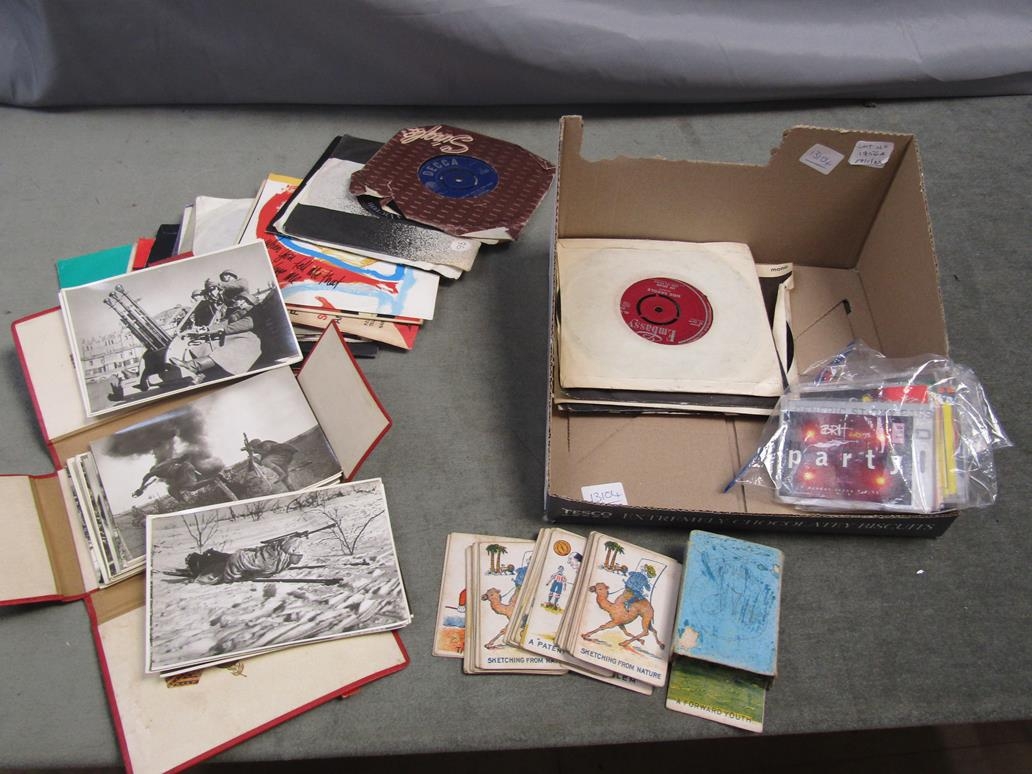 COLLECTION OF SINGLE RECORDS AND OTHER ITEMS OF EPHEMERA INC. OLD PLAYING CARDS