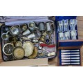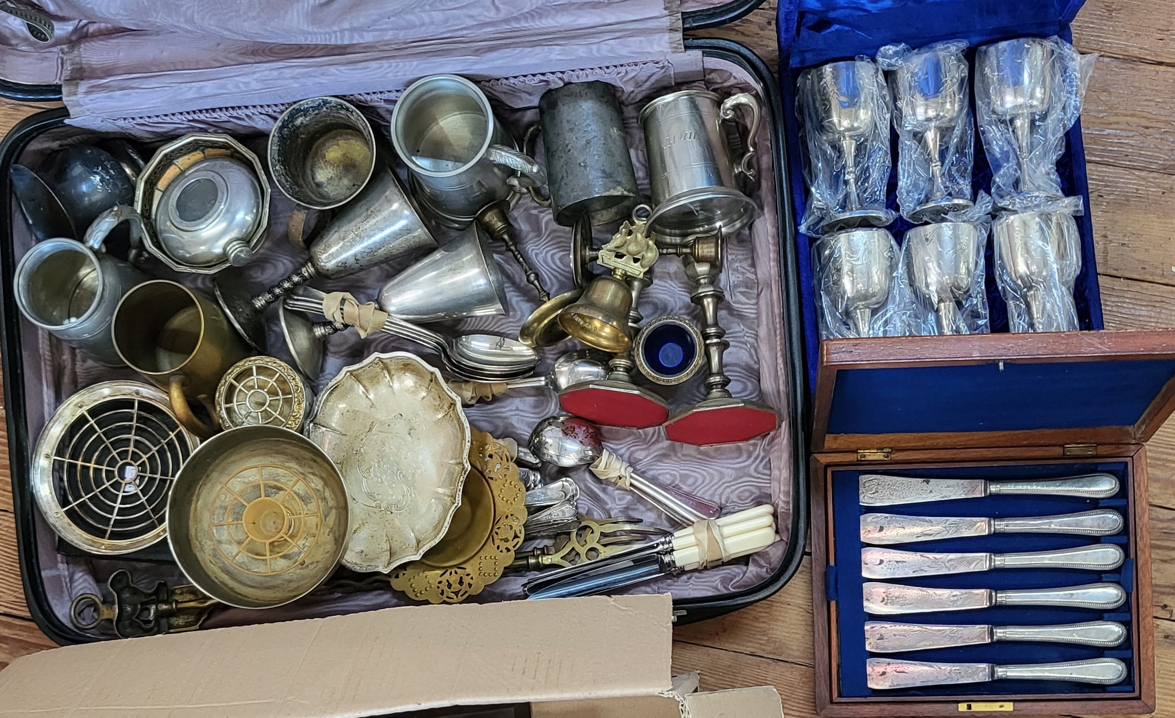 A large quantity of brass, pewter, and EPNS including tankards, cutlery, bowls, boxed knives, and boxed goblets.