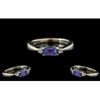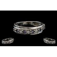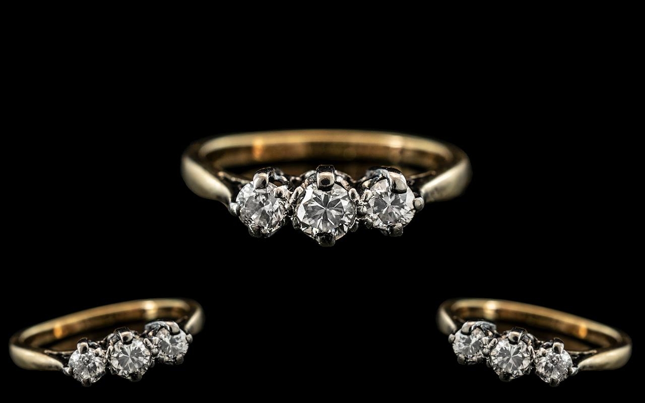 18ct Gold - Attractive 3 Stone Diamond Set Ring. Marked 18ct To Interior of Shank. The Three Round Diamonds of Good Colour / Clarity. Est Diamond Weight 0.25 pts, Ring Size H - I. The Shank and Setting Excellent Condition.