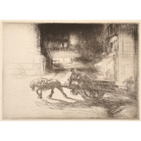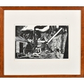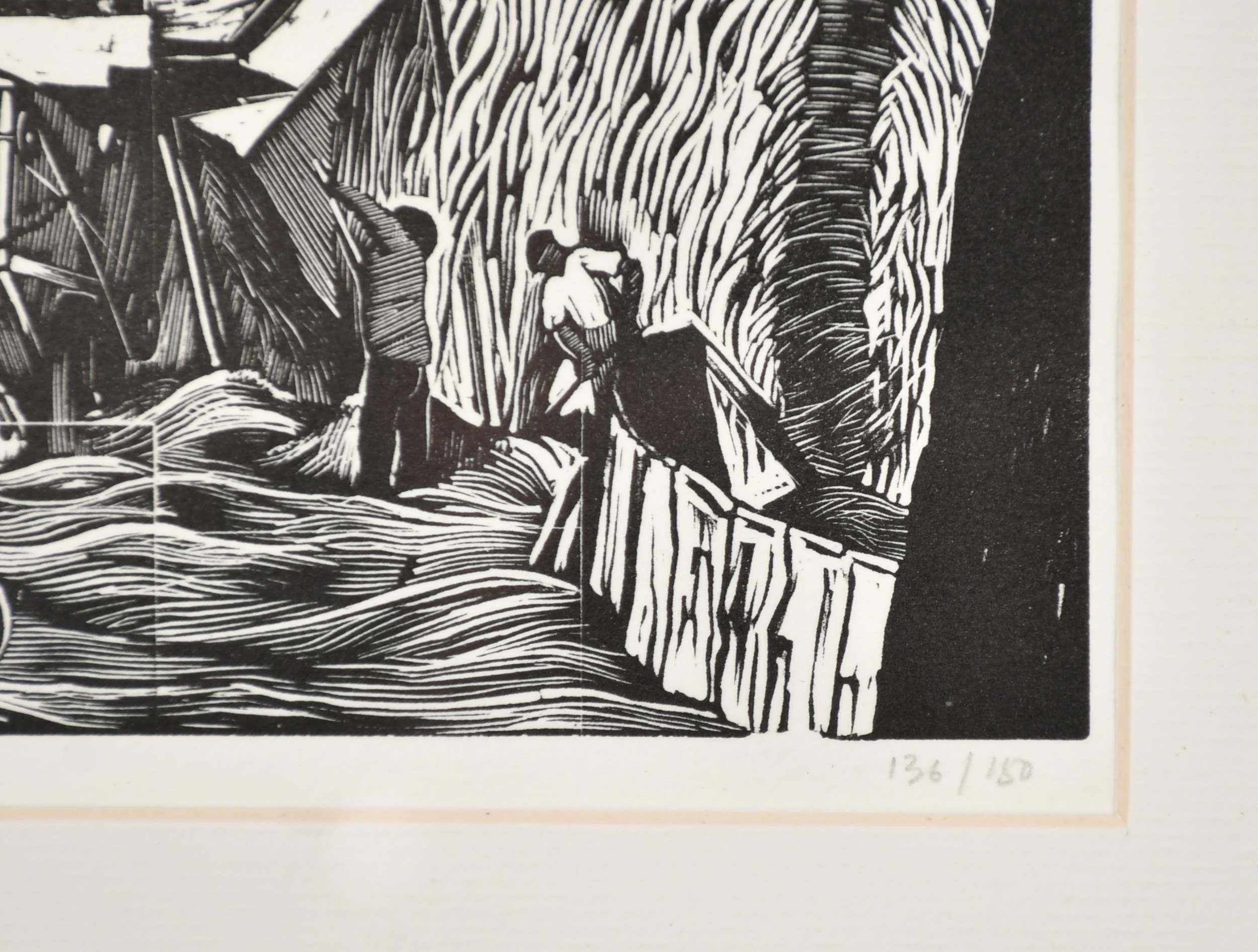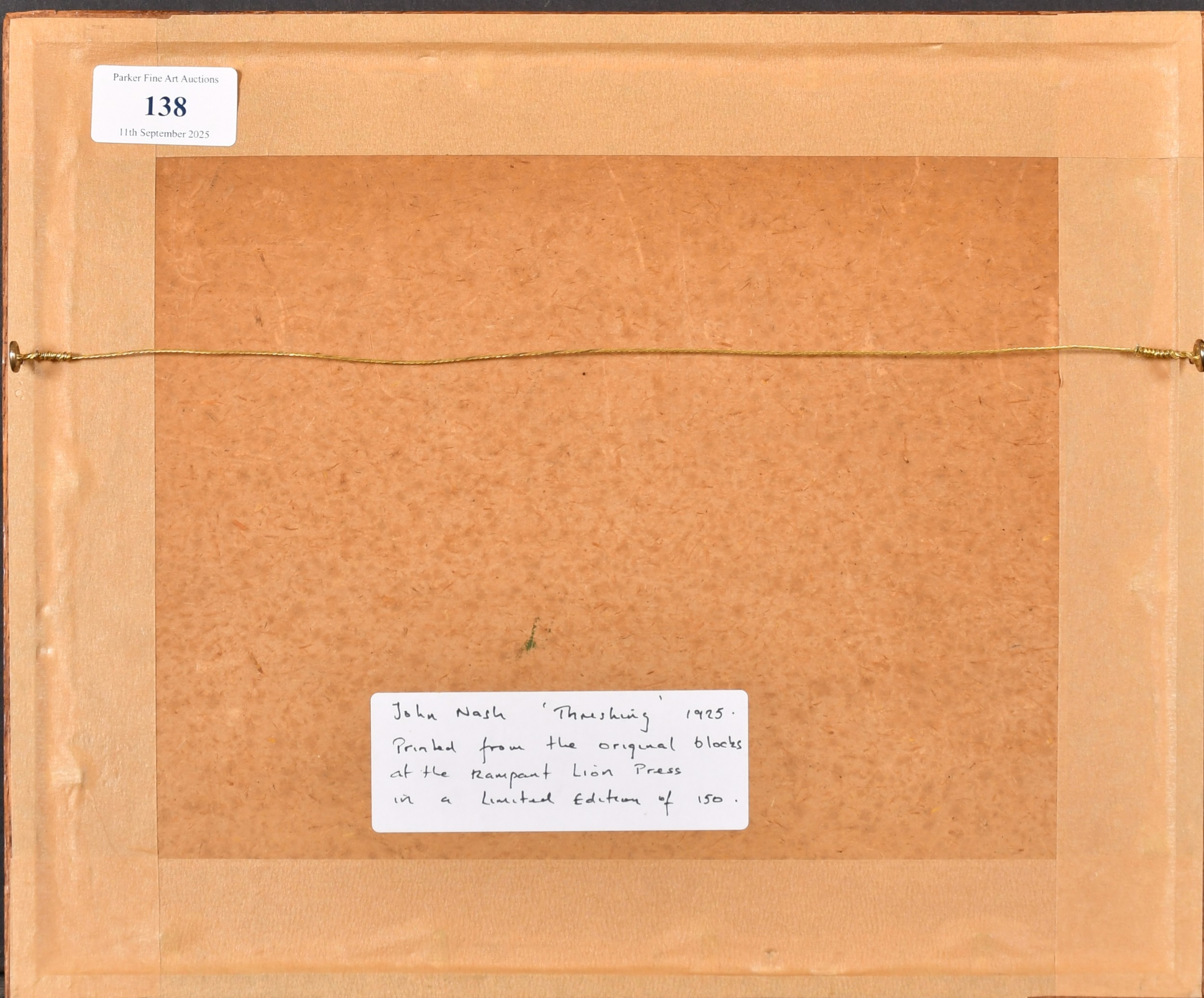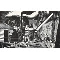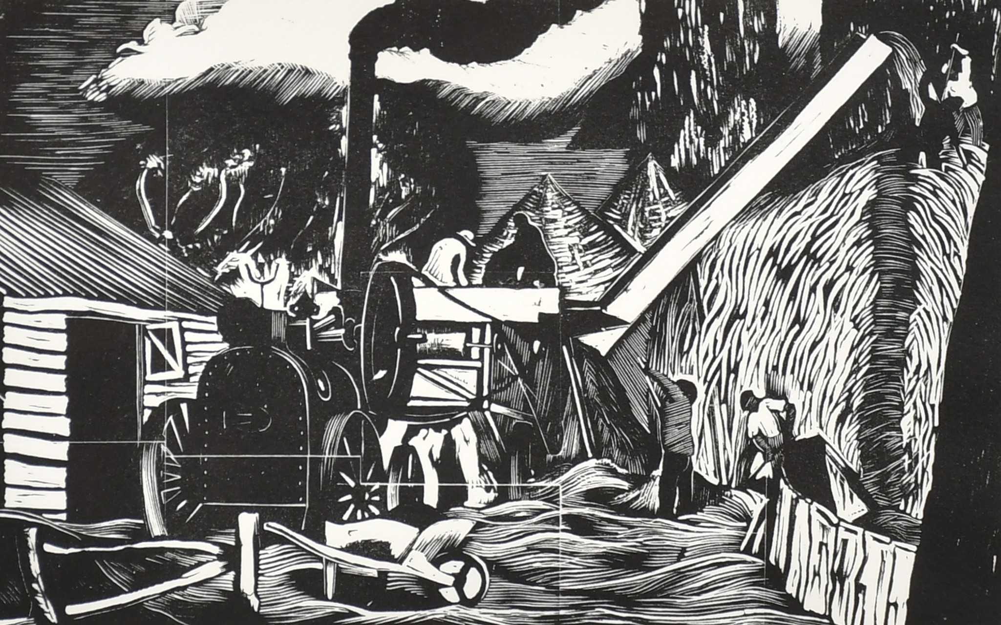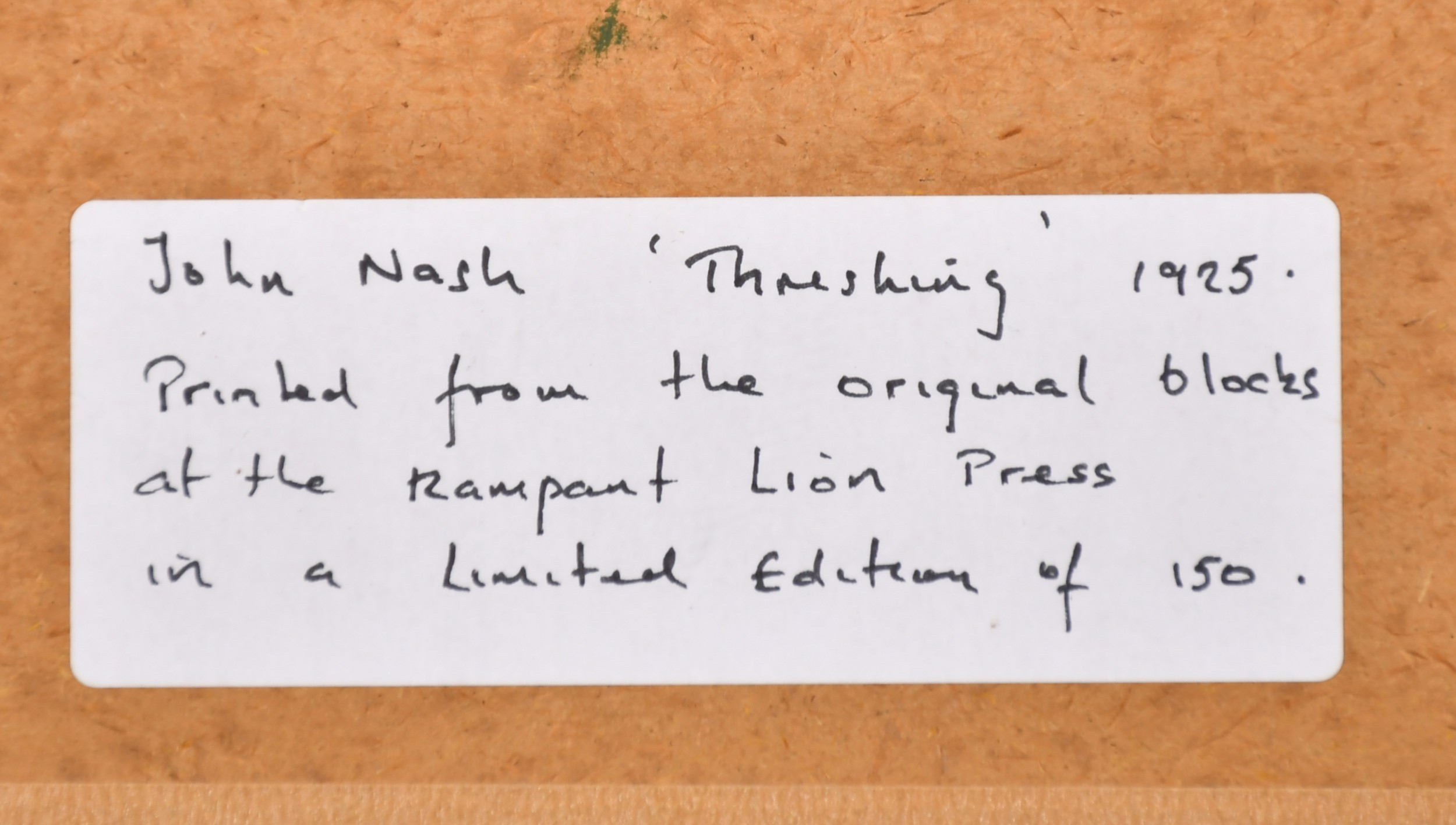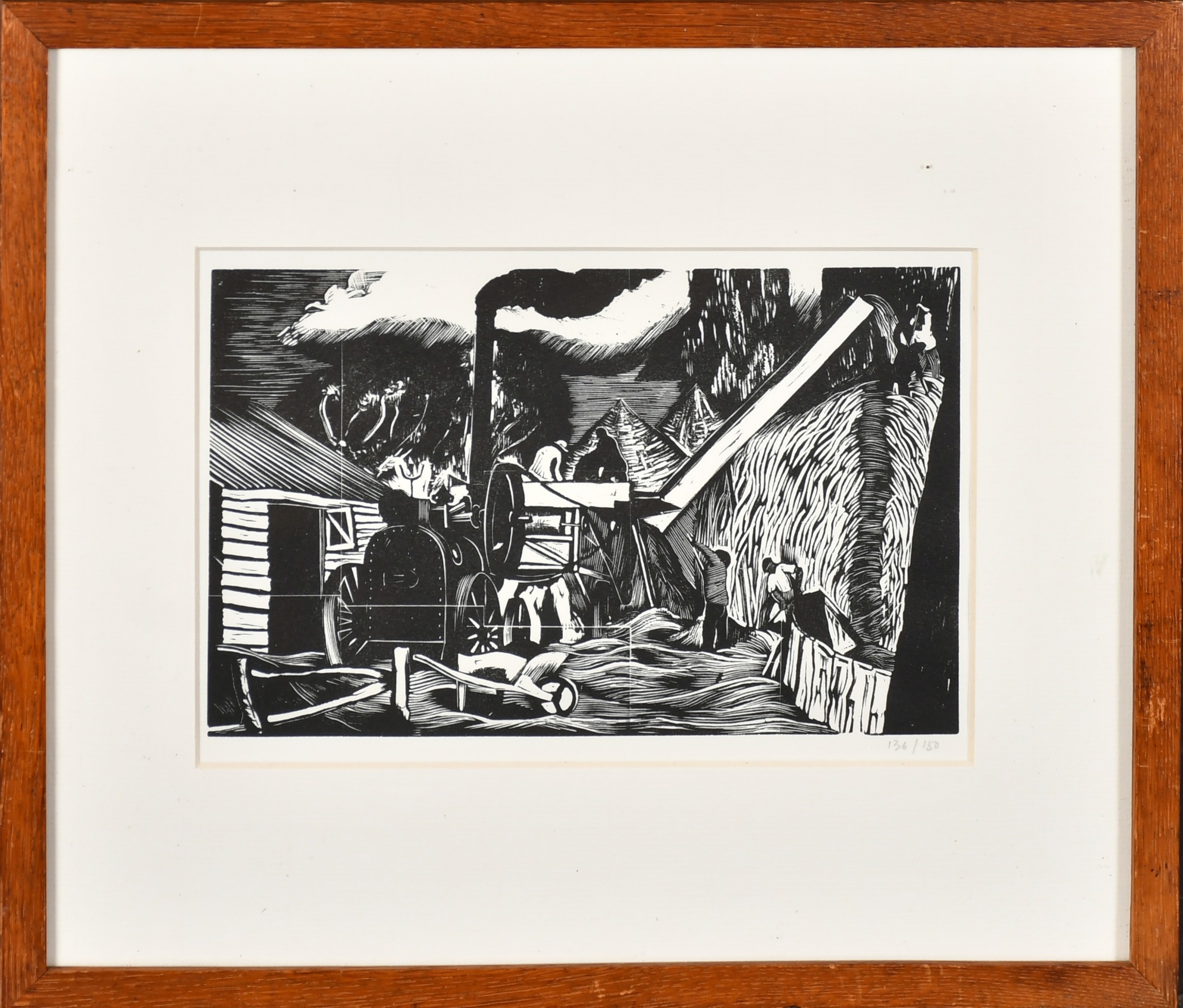 John Northcote Nash (1893-1977) British. "Threshing", Woodcut printed by Rampant Lion Press in a limited edition, Numbered 136/150 in pencil, and inscribed on a label verso, 4.85" x 7.9" (12.5" x 20cm)