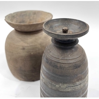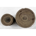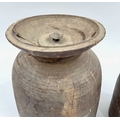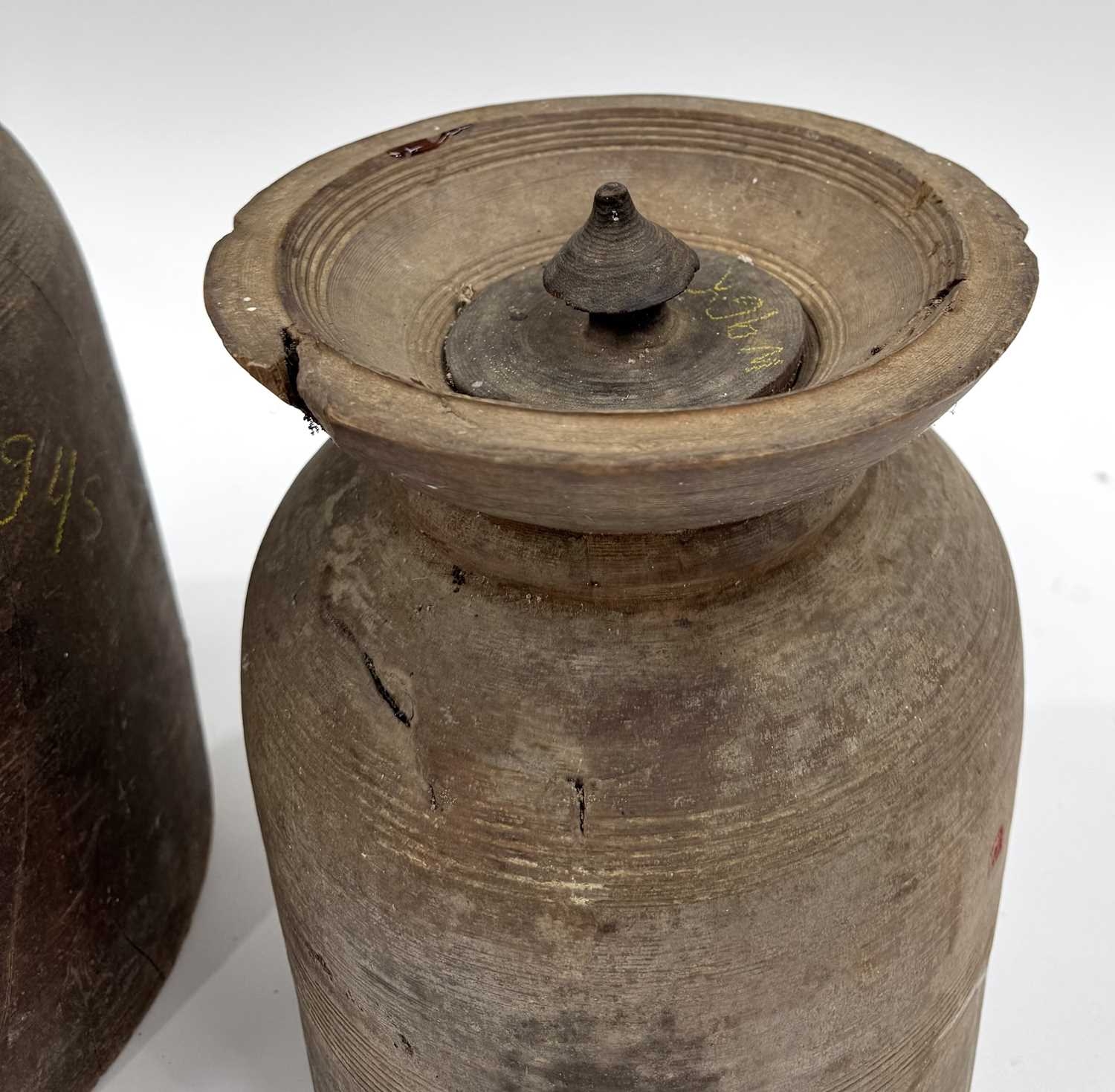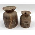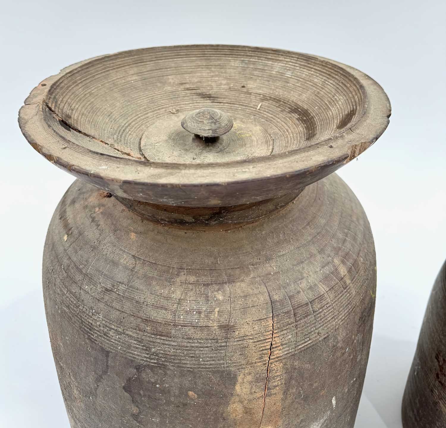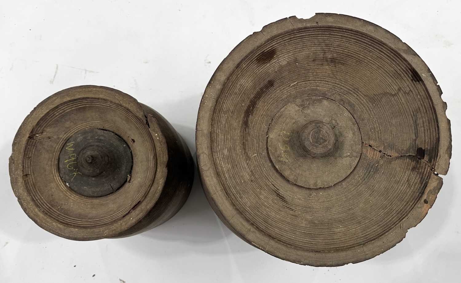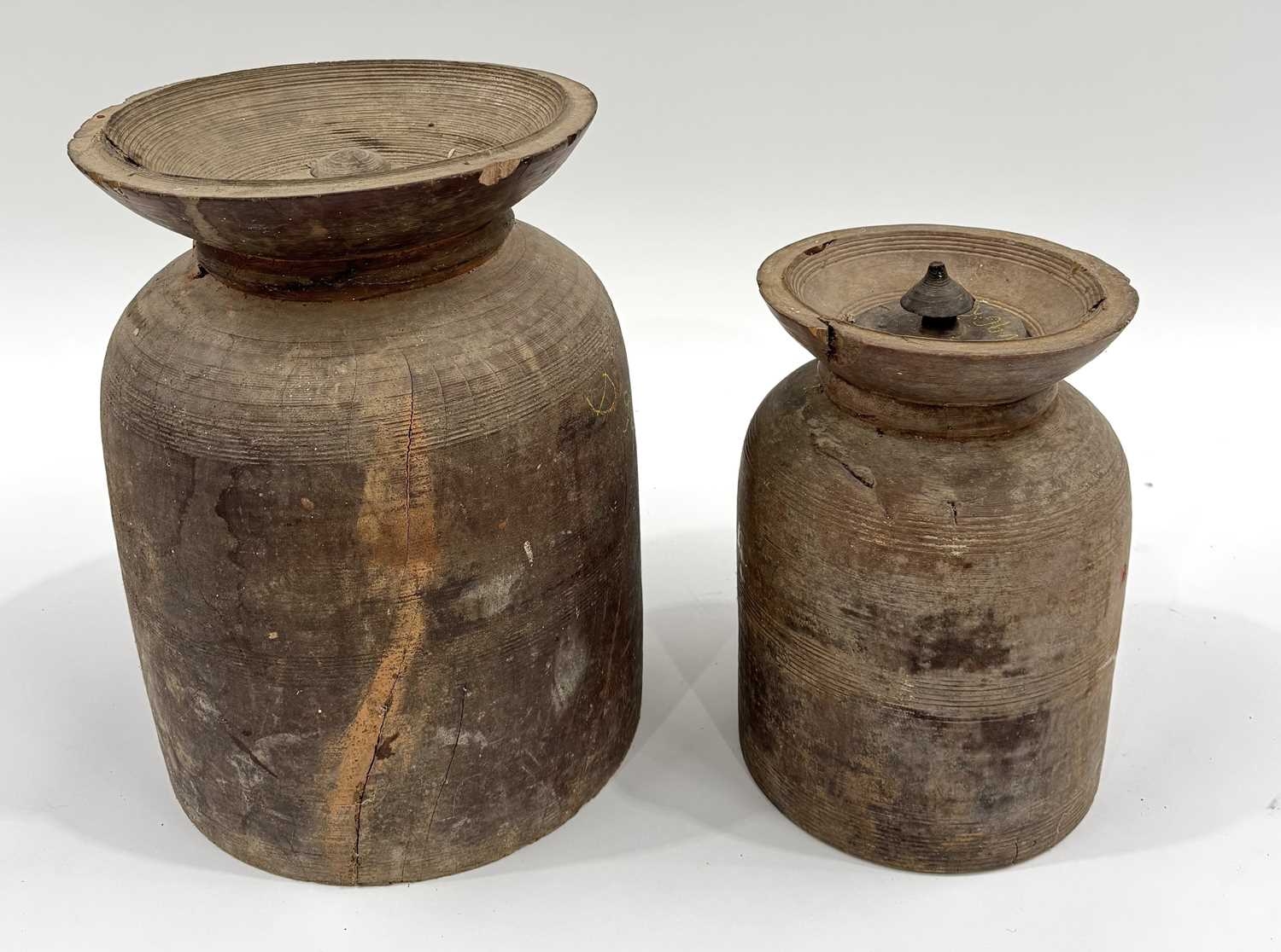 Two Nepalese turned hardwood lidded vessels, cylindrical body with flared rims, designed for the fermentation of Yak milk, Dolpa region, North Nepal/Tibetan border, late 19th century, 31cm and 41cm high (2)