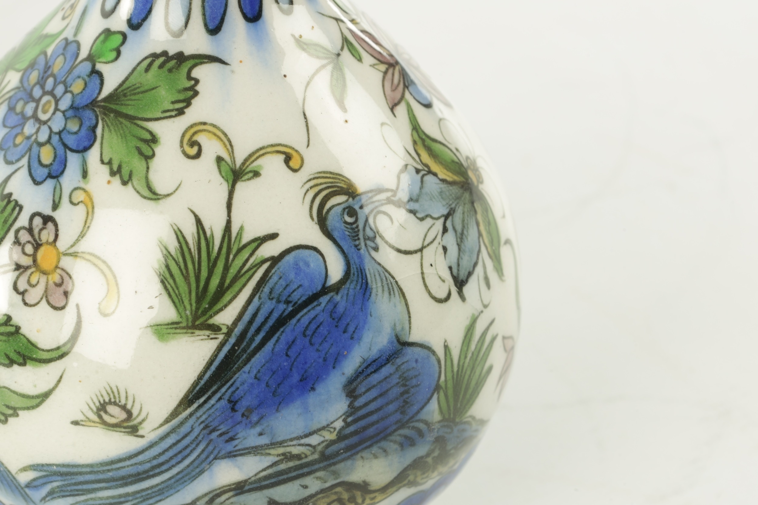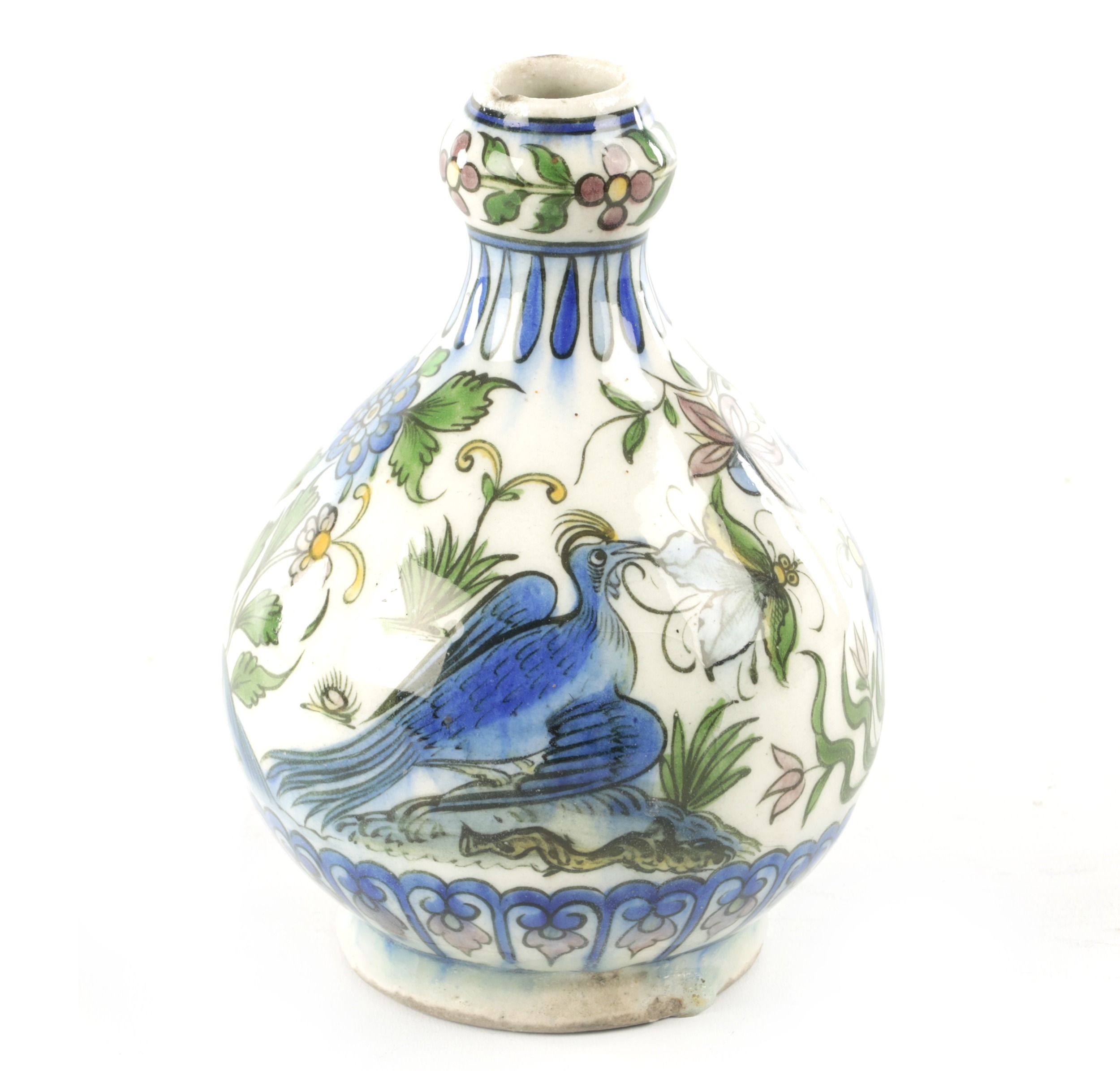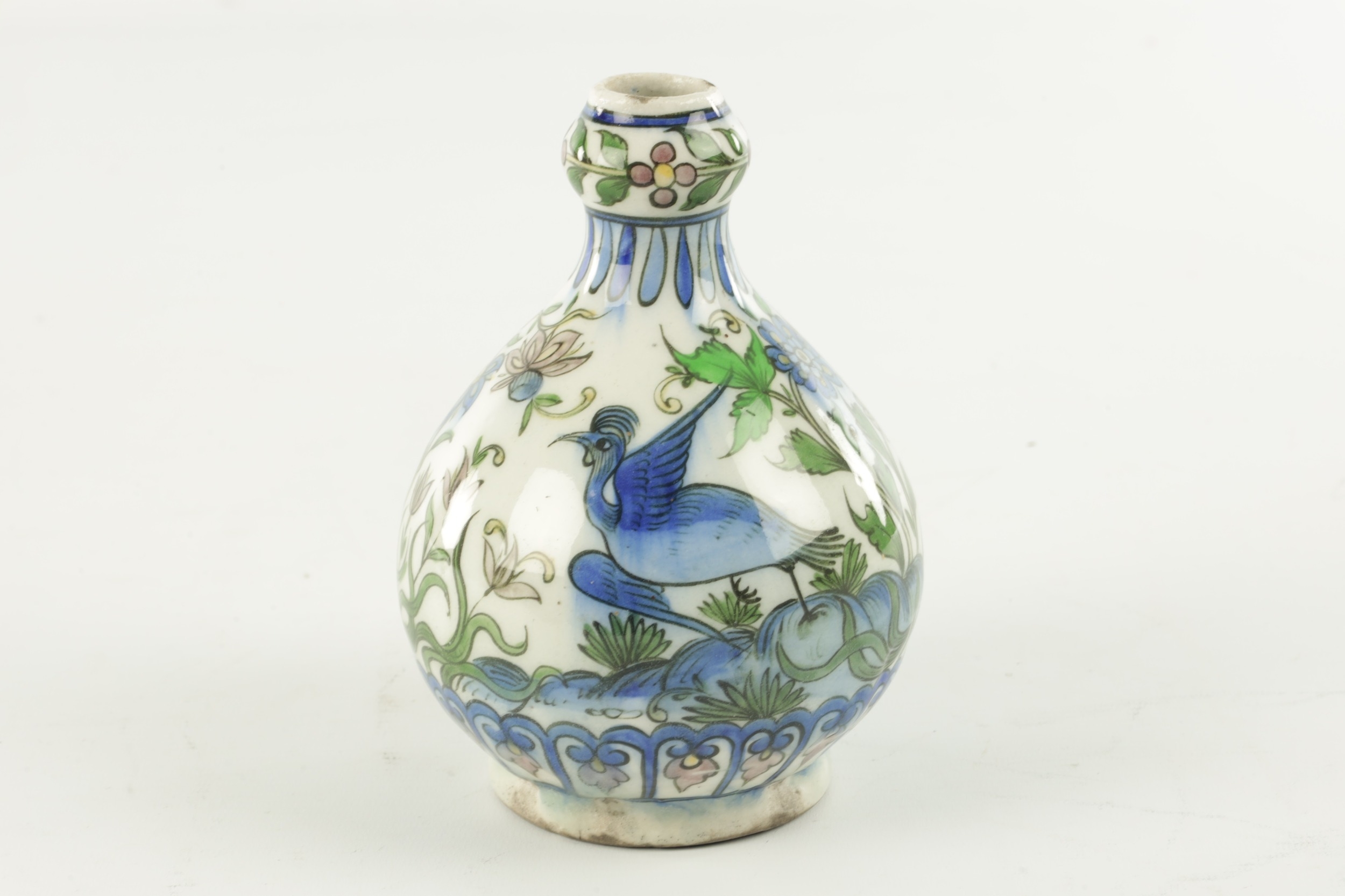 AN 18TH/19TH CENTURY PERSIAN PORCELAIN BOTTLE VASE, of bulbous form, decorated with flowers and birds, decorative blue bands to the neck and base. (17cm high)