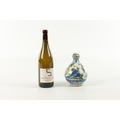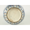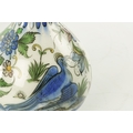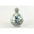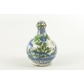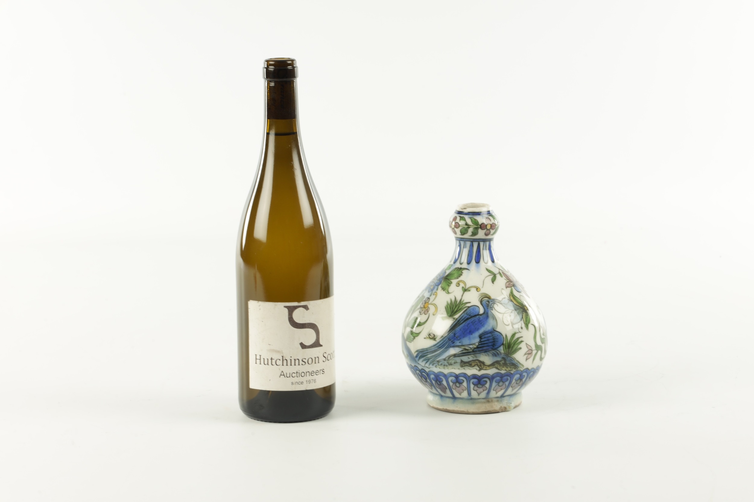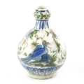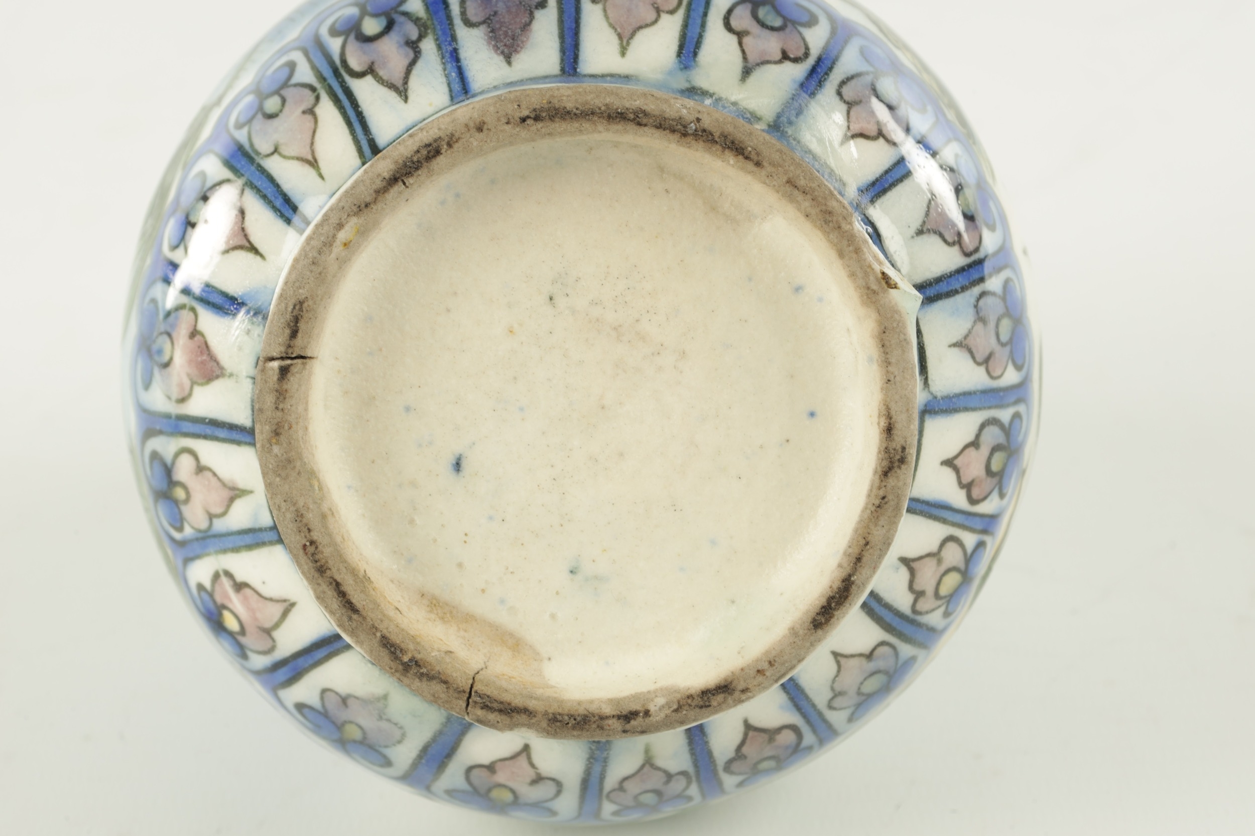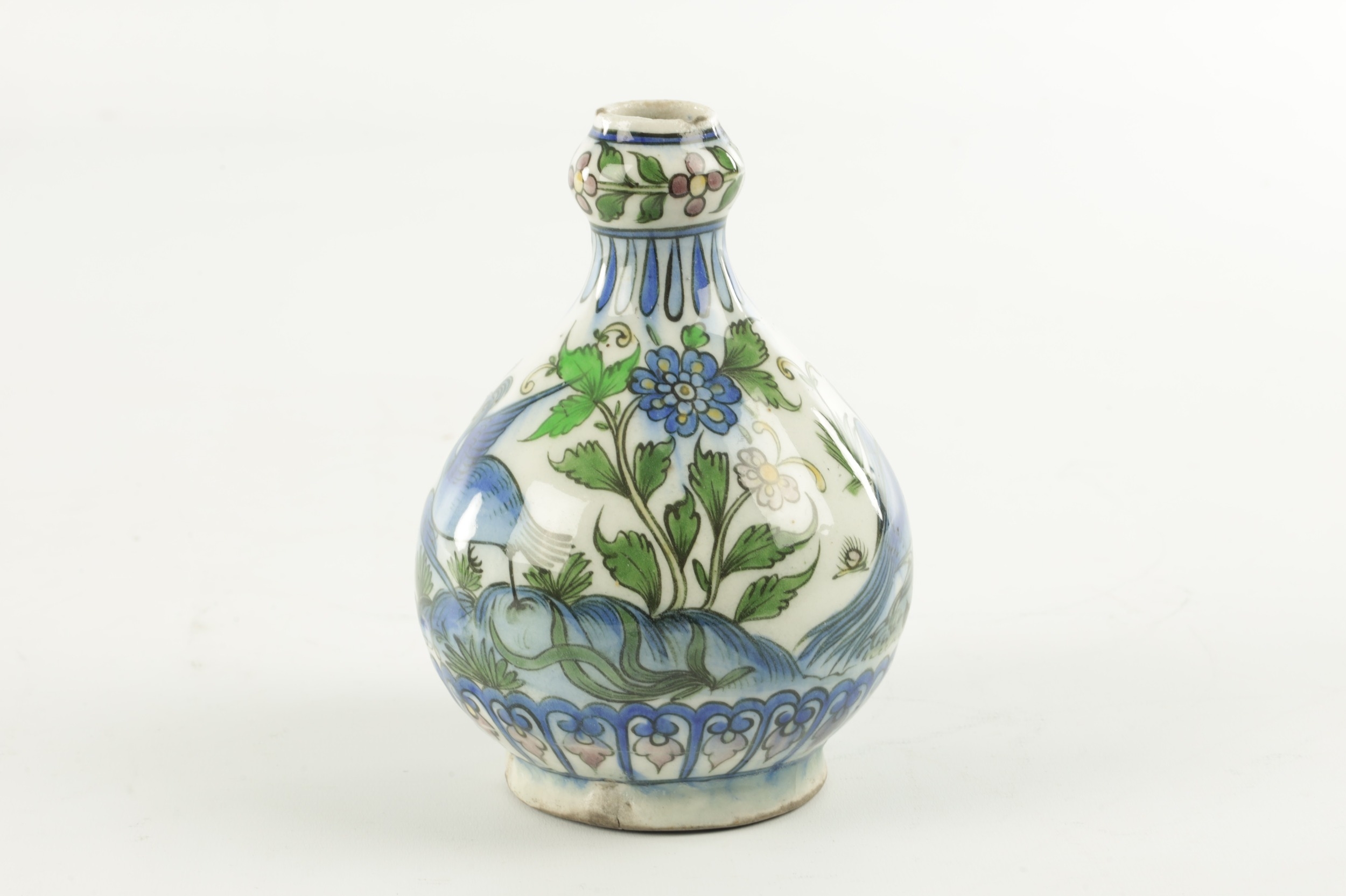 AN 18TH/19TH CENTURY PERSIAN PORCELAIN BOTTLE VASE, of bulbous form, decorated with flowers and birds, decorative blue bands to the neck and base. (17cm high)