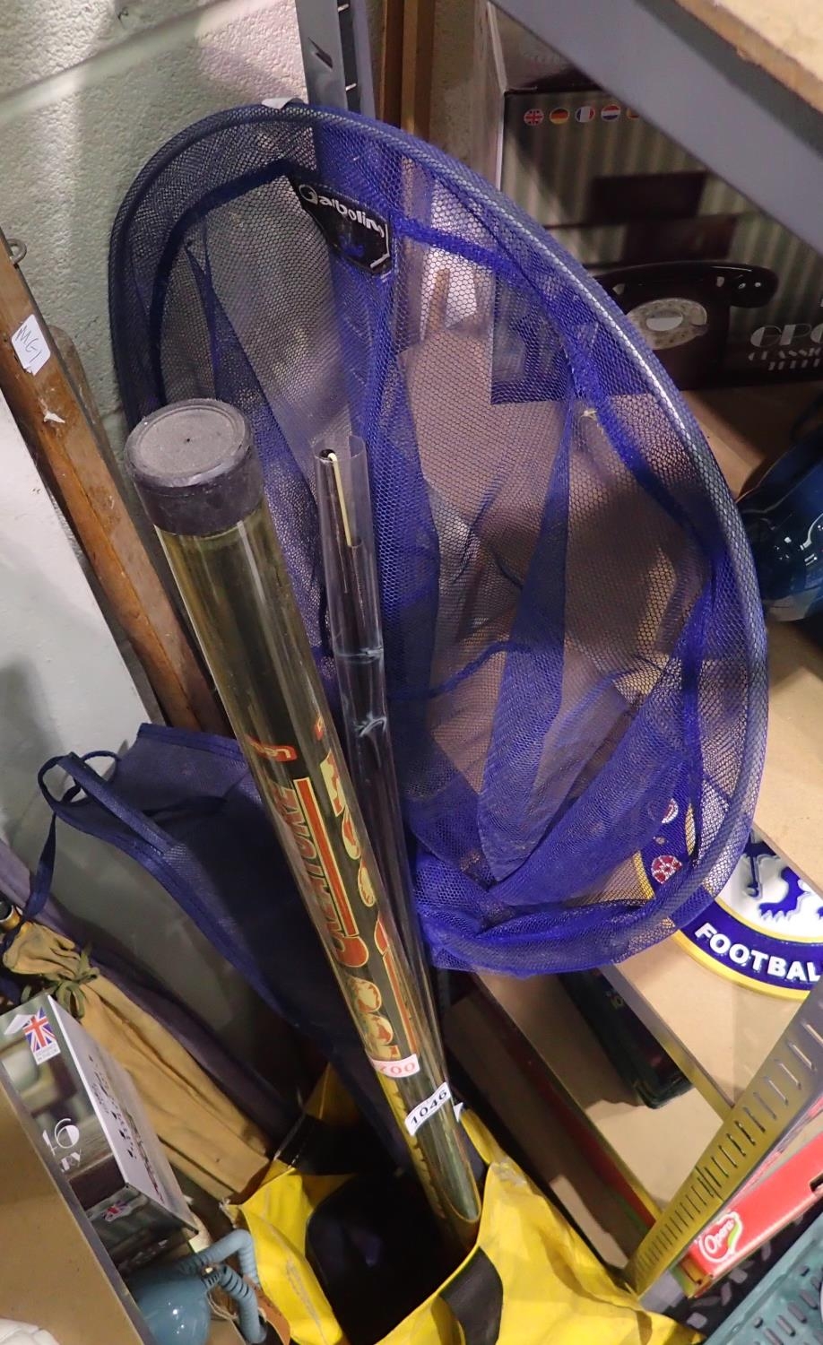 Selection of fishing rods and nets and a reel. Not available for in-house P&P
