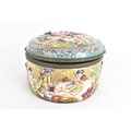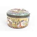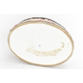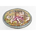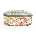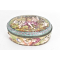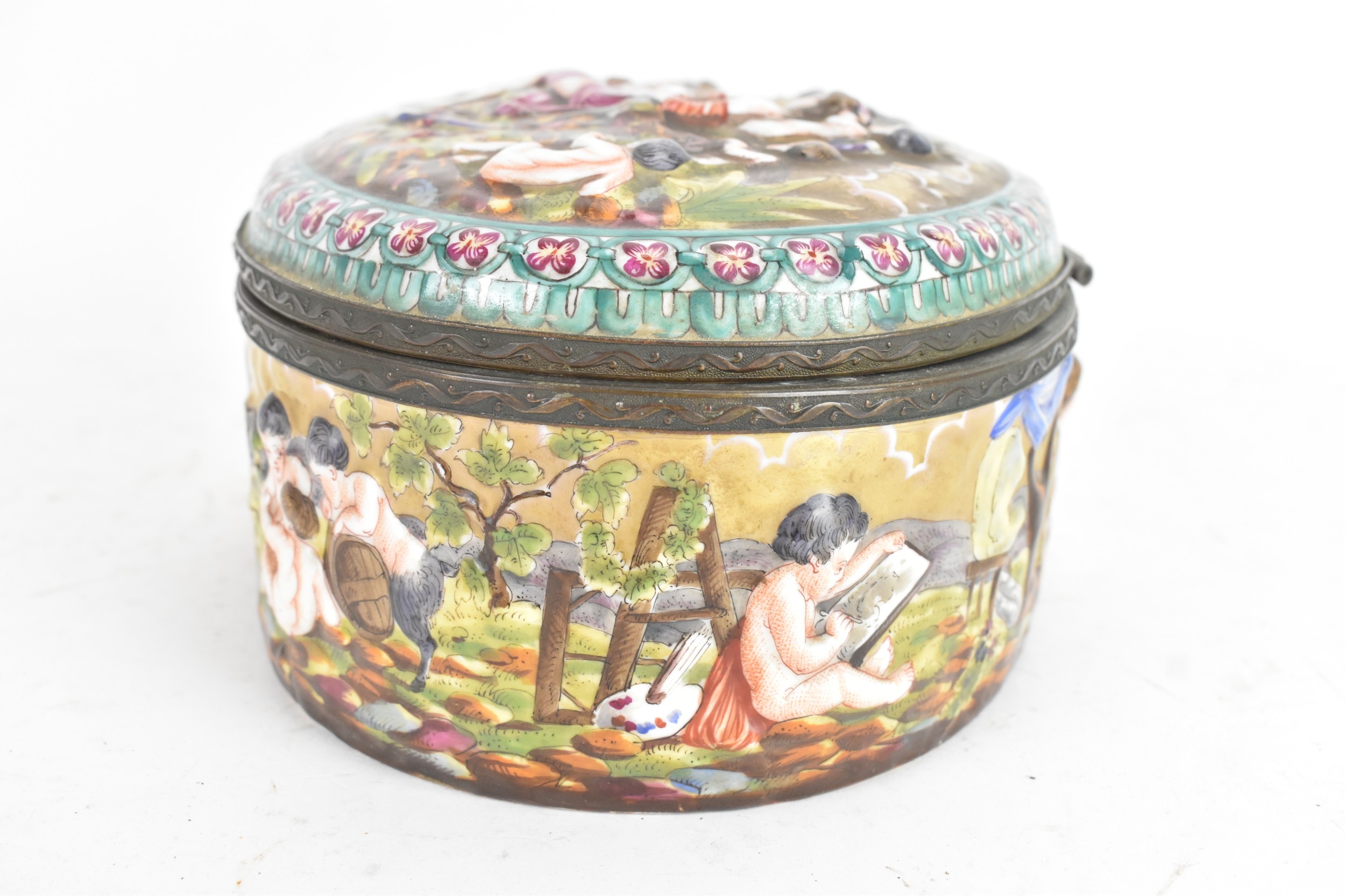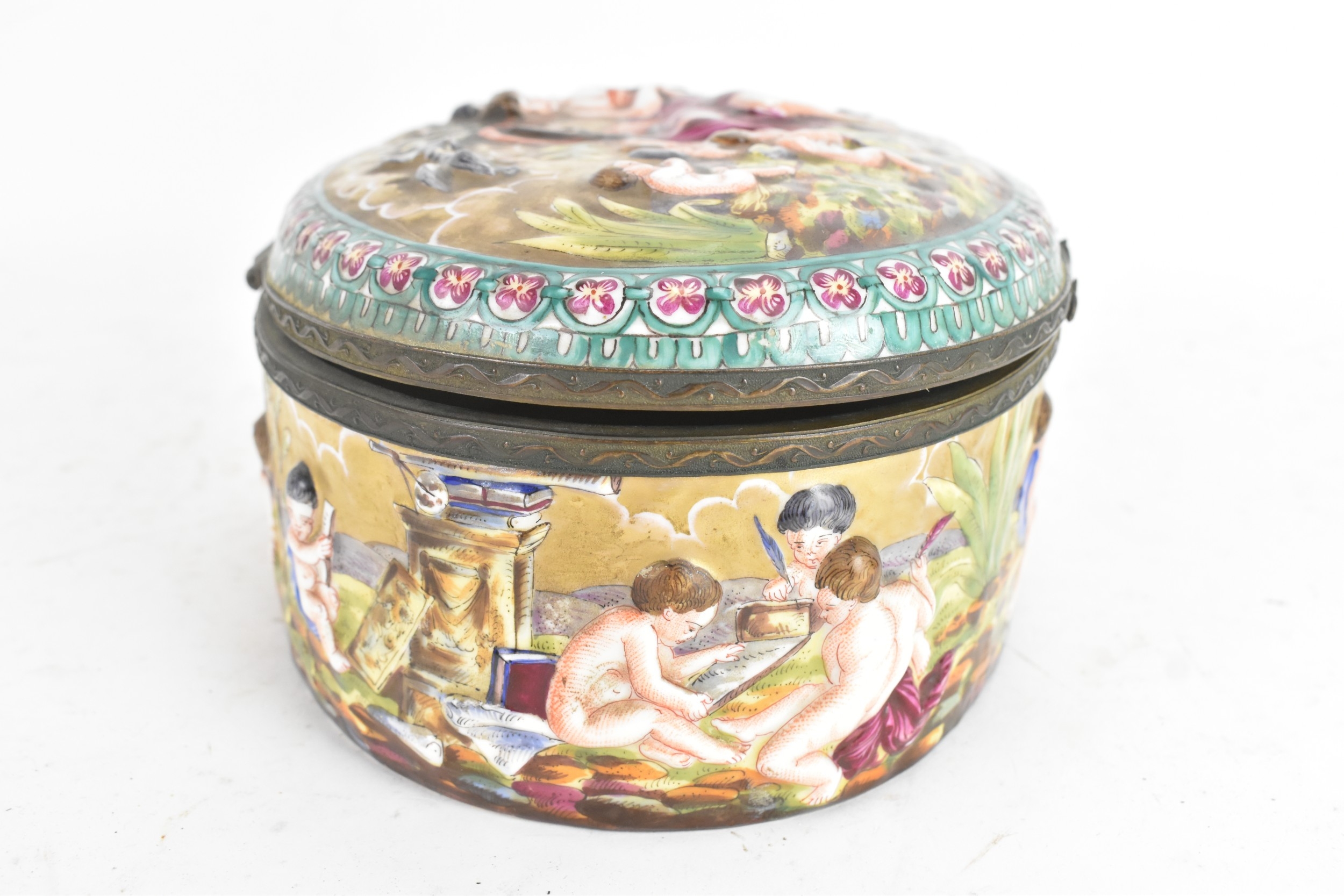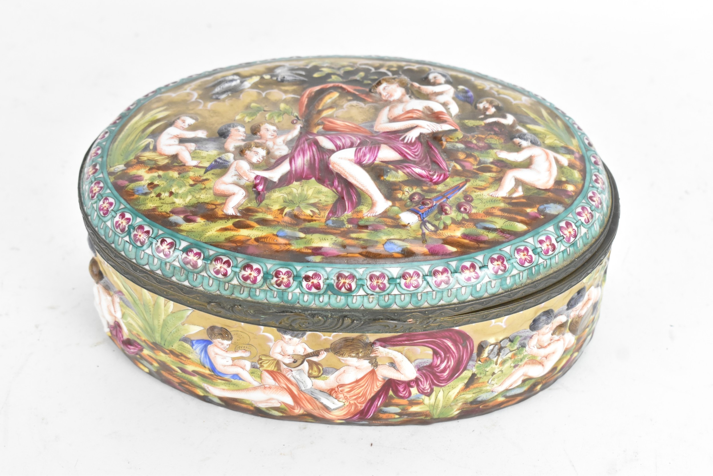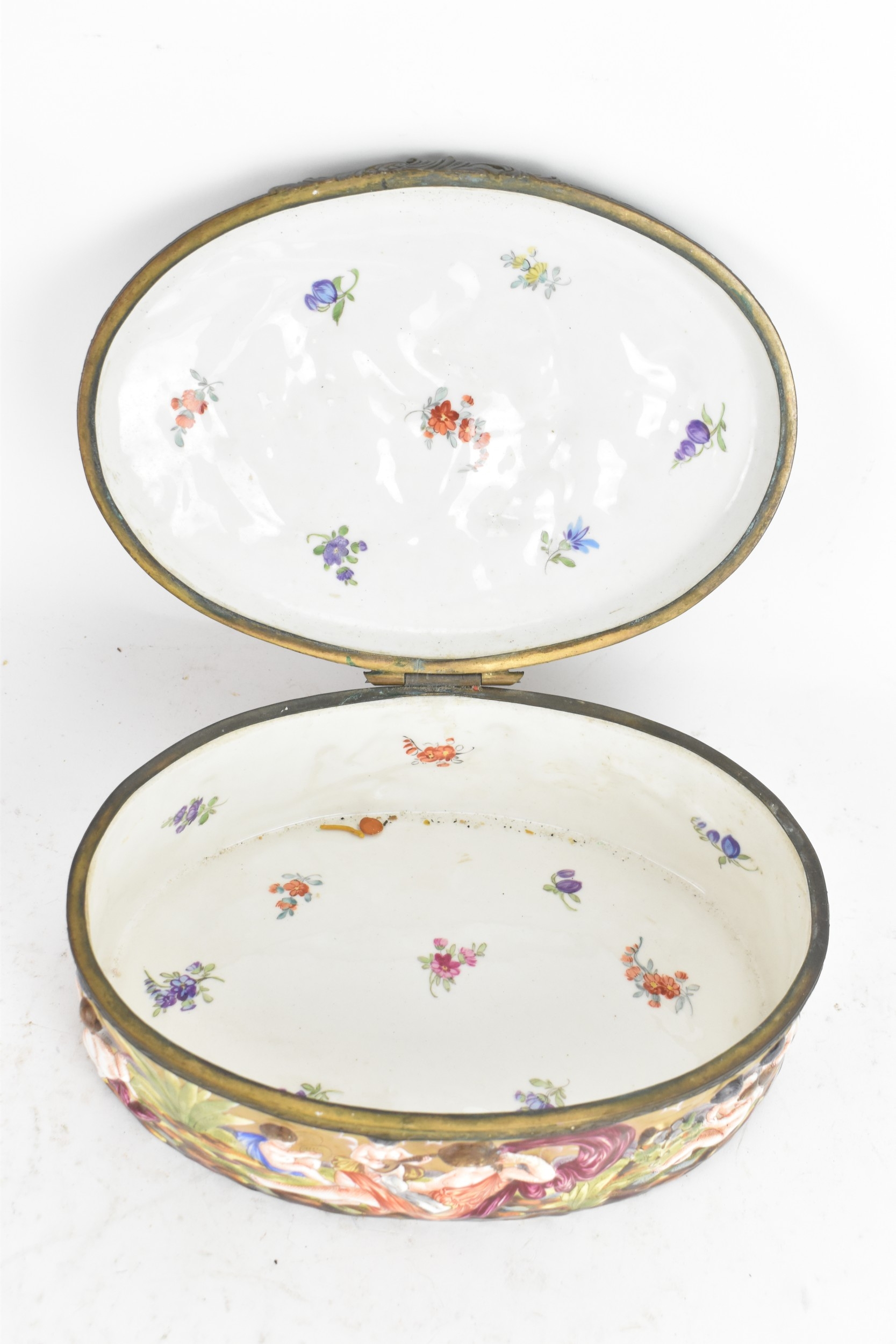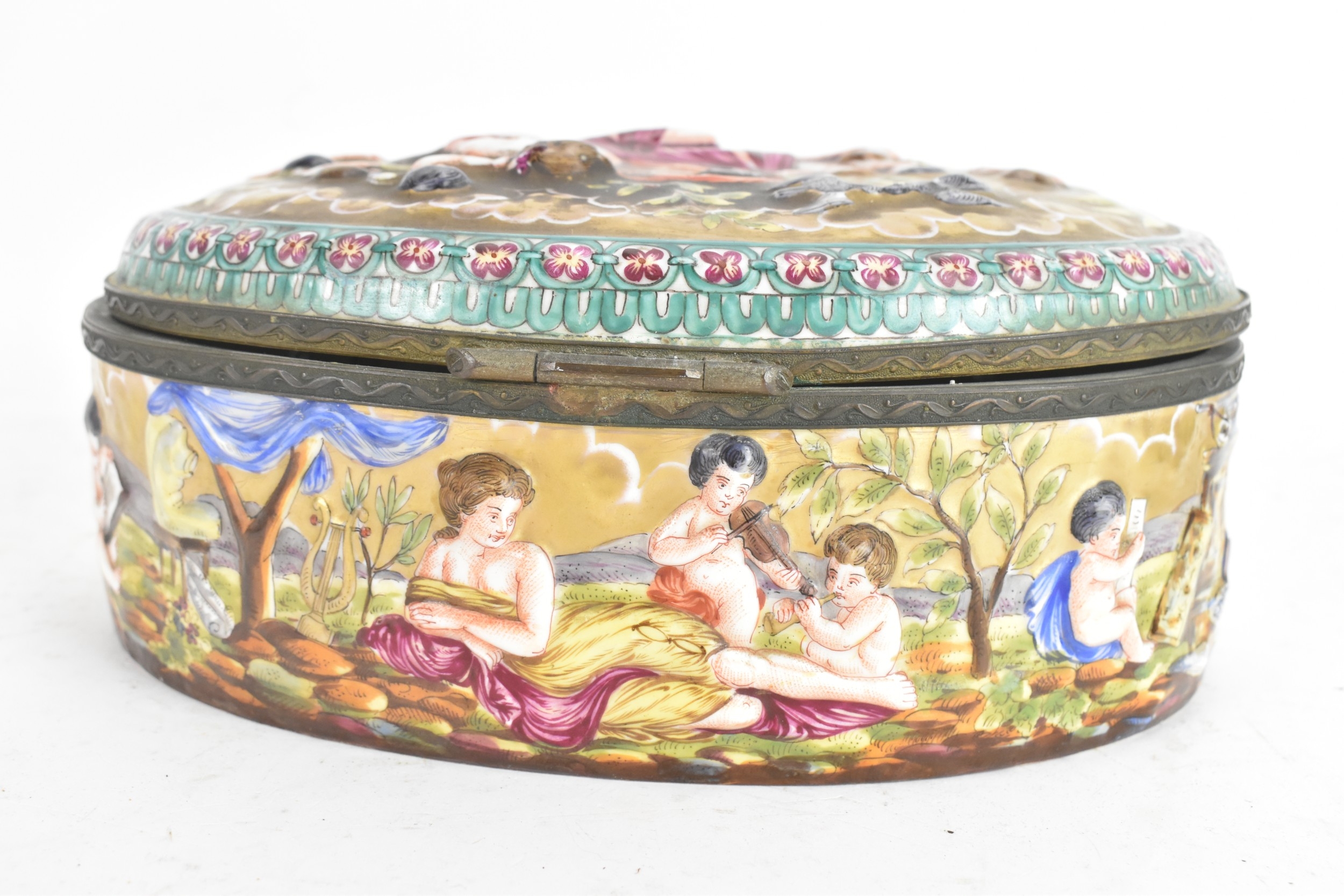 A late 19th/early 20th century Capodimonte porcelain and metal-mounted oval casket, the domed lid and sides enamelled in polychrome with classical figures and putti in a wooded landscape, within a foliate metal mount, the interior decorated with scattered floral sprigs, the base with a blue crowned ‘N’ mark, 11.5cm high x 25cm wide