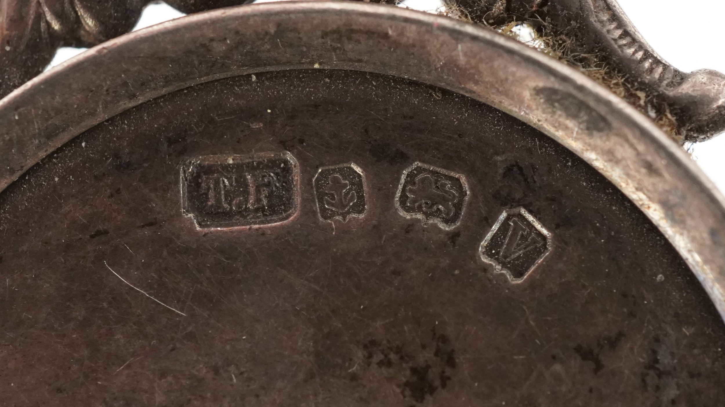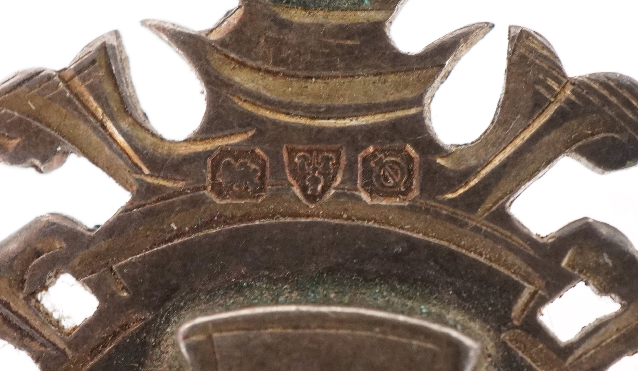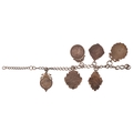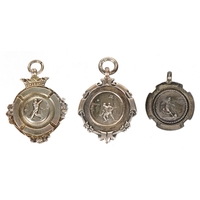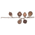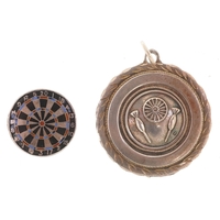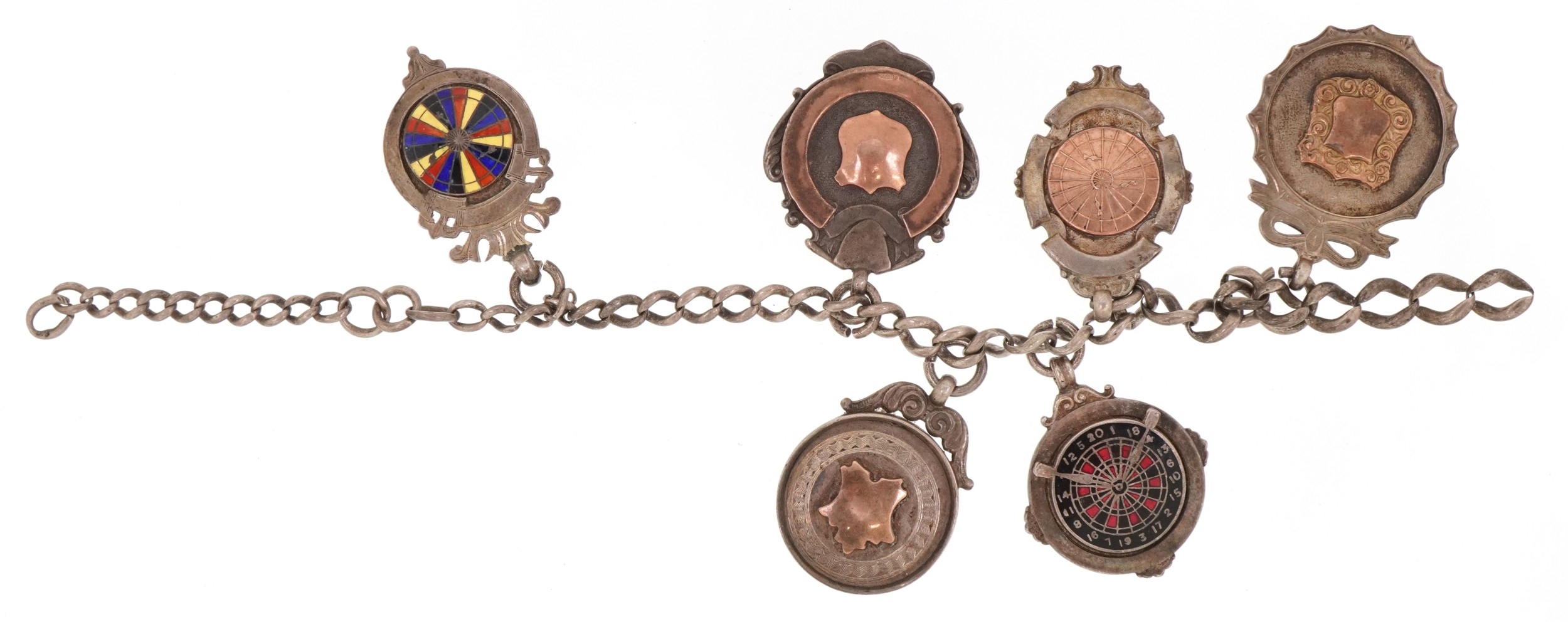Six antique silver sports jewels including two enamelled dart boards, mounted on a silver chain, total weight 68.0g.