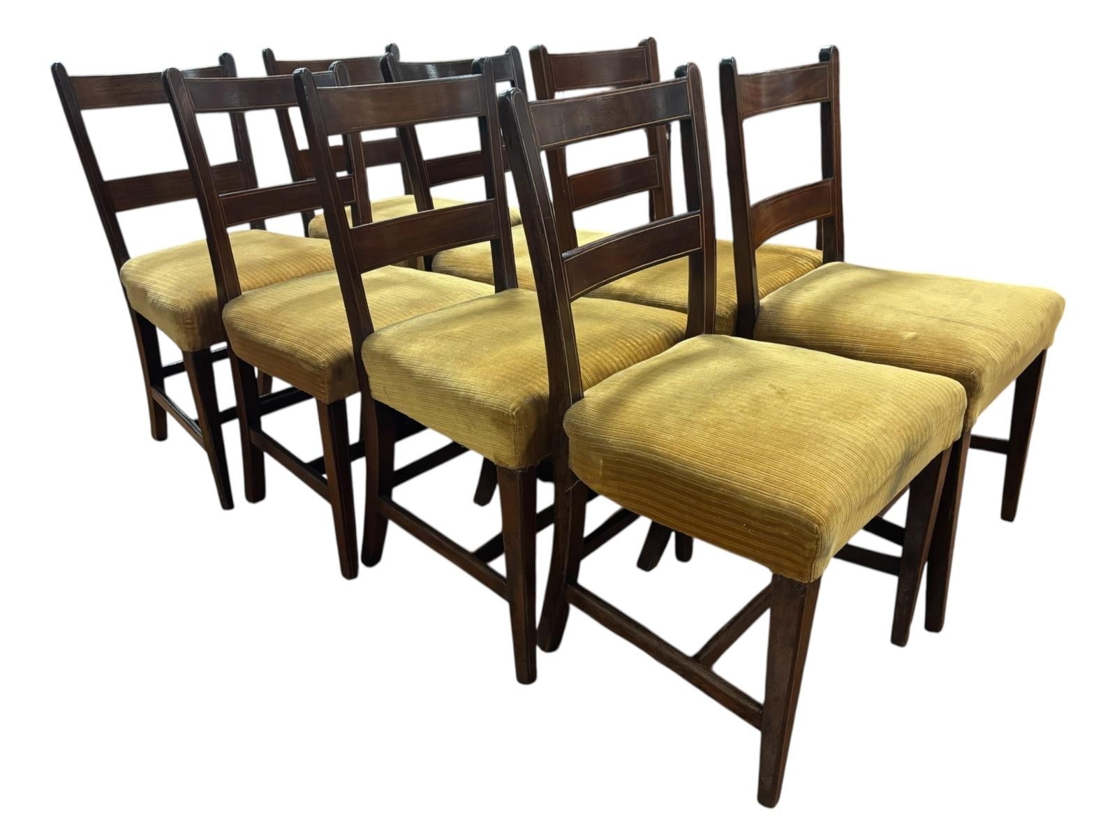 A SET OF EIGHT GEORGIAN MAHOGANY AND SATINWOOD INLAID DINING CHAIRS each with a curved top rail and splat with upholstered seats on square tapering legs joined by cross stretchers