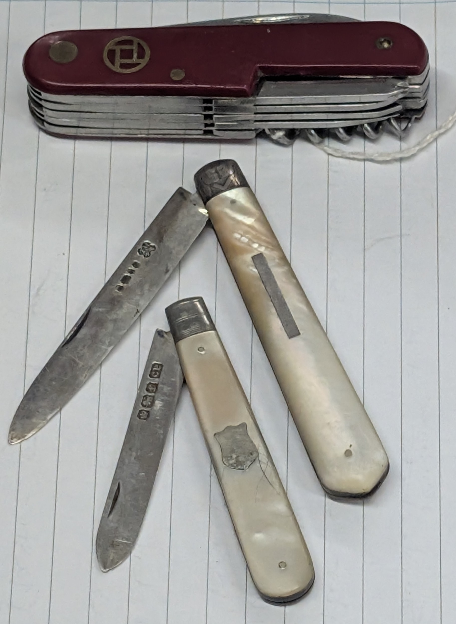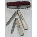 Three Folding Knives, including two Mother-of-Pearl and Silver Fruit, and a Swiss Army Style Multi-Tool