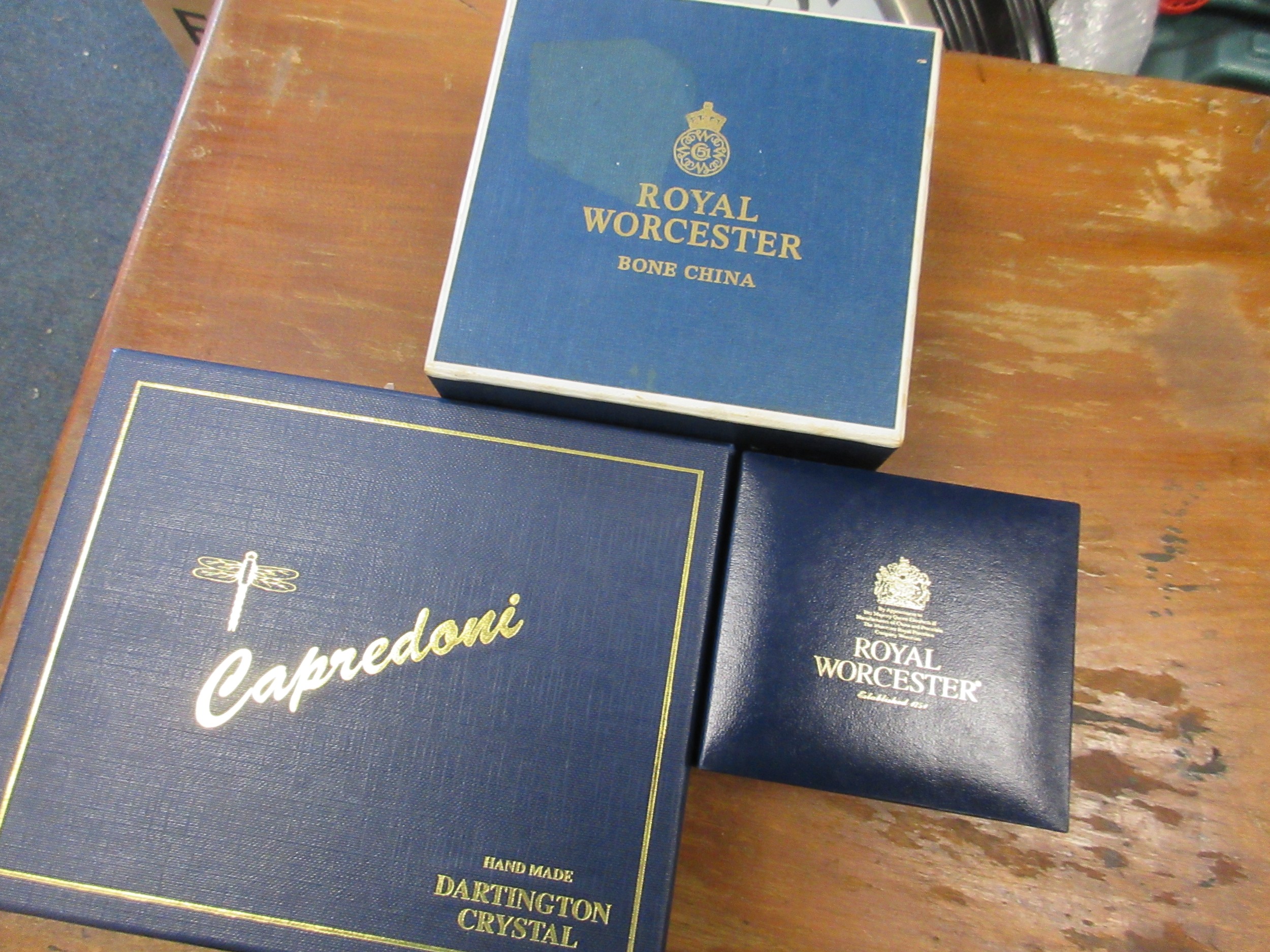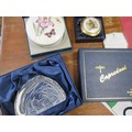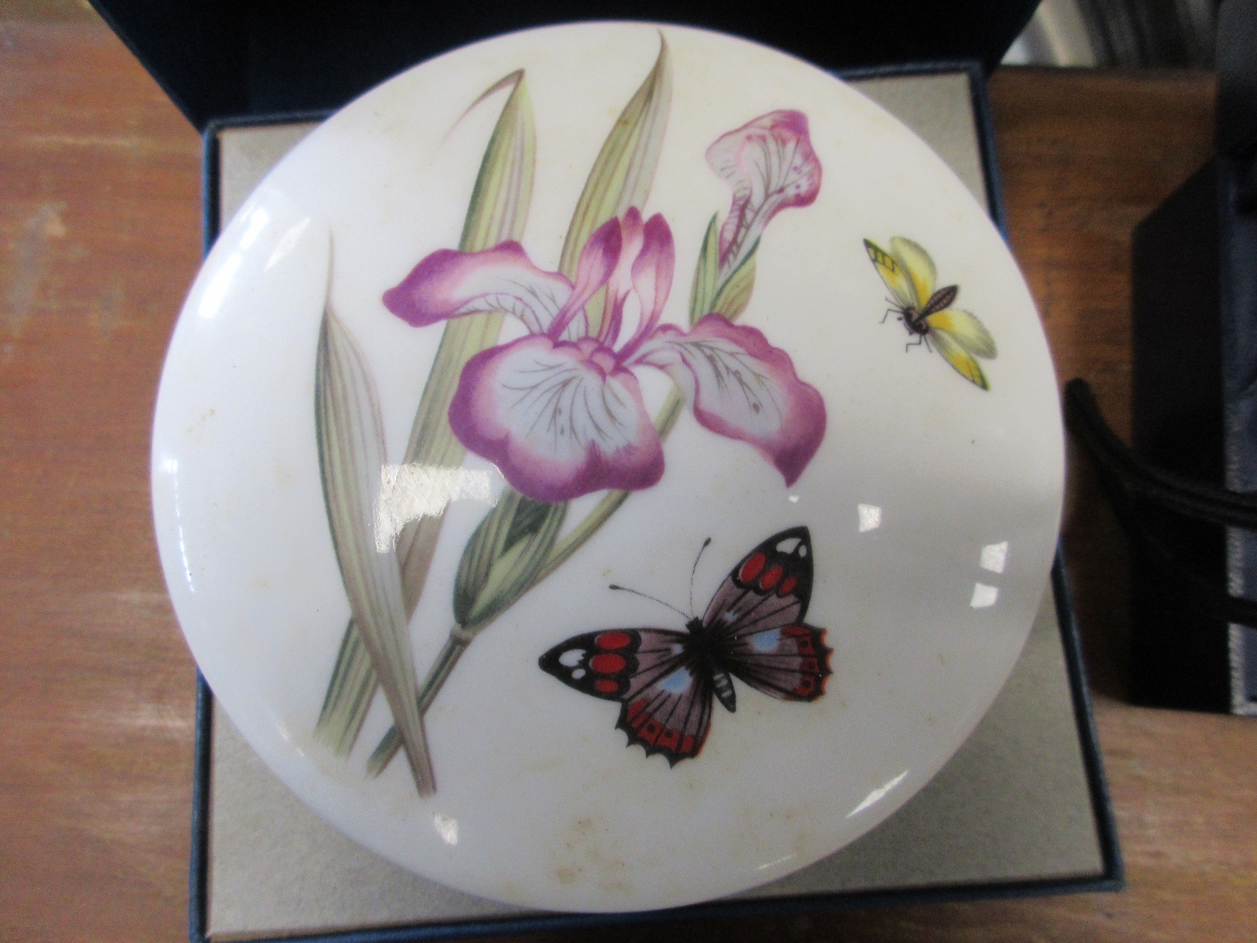 Two china boxes and a crystal paperweight - a Royal Worcester L/S Round China box to celebrate QEII Golden Jubilee limited edition 376/2002 with certificate. A Royal Worcester bone china round jar decorated with butterflies and flowers. An Alfred Capredoni Dartington Crystal fawn iceberg paperweight C10011.