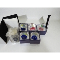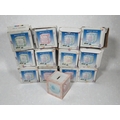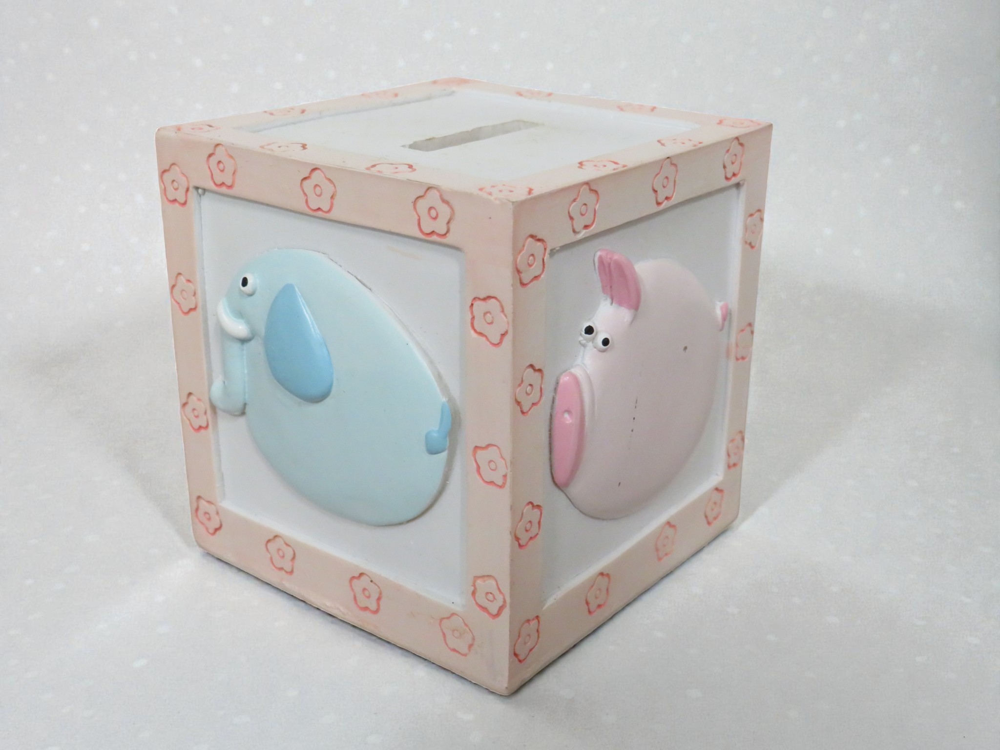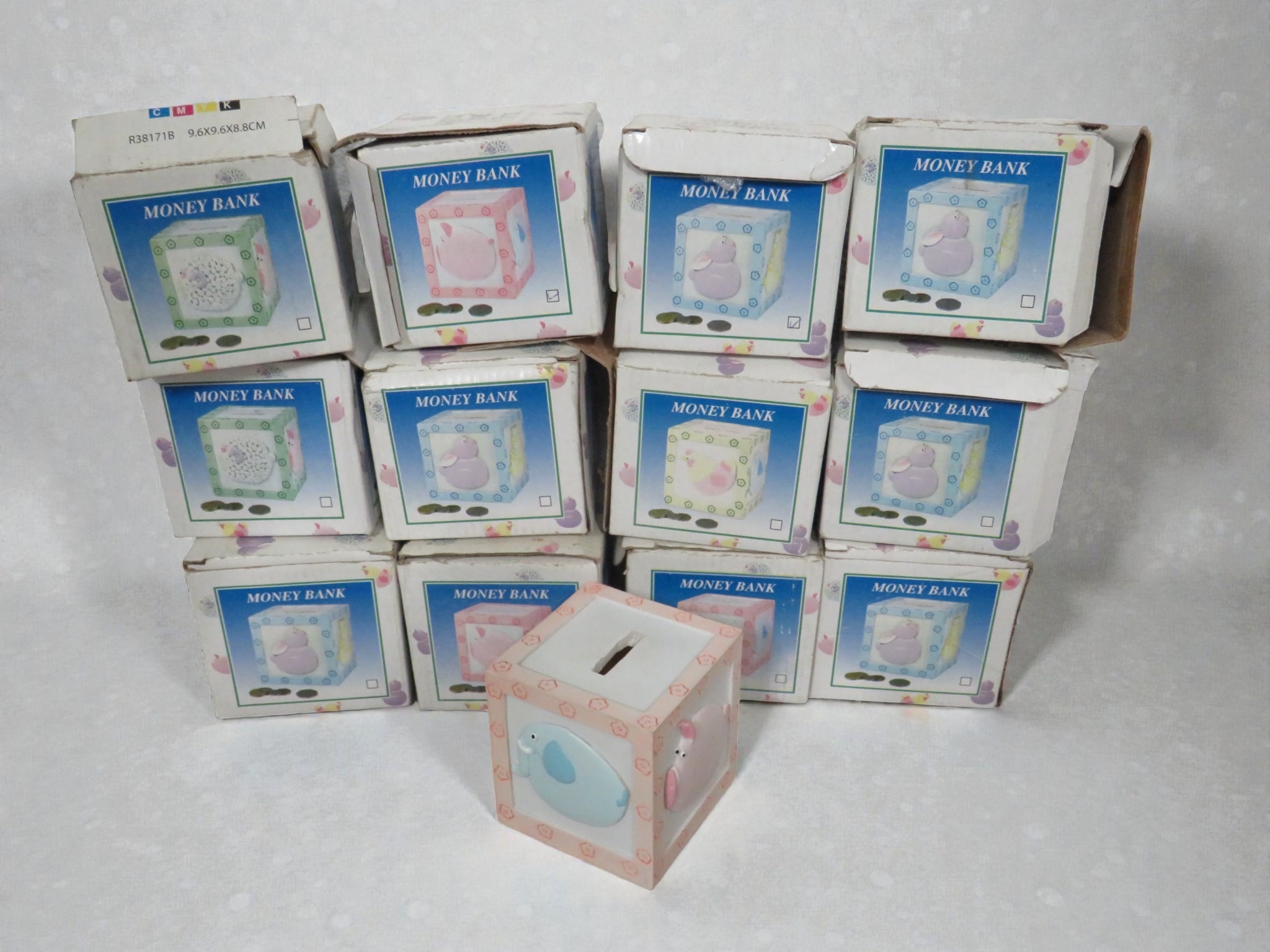Collection of approximately twelve boxed children's money boxes/piggy banks, new in retail packaging. The items are branded "MONEY BANK" and feature cube-shaped ceramic or similar material construction decorated with colorful patterns including polka dots, stripes, and character designs. Colors include pink, blue, yellow, green, and cream with coordinating decorative motifs. One example displayed shows a pink money box with teddy bear or similar cute character design and coin slot on top. Reference number R38171B visible with dimensions 9.6x9.6x8.8cm noted. All items appear unused in original boxes which show some storage wear with minor crushing to corners but contents appear undamaged. Popular children's gift item with good retail potential for toy shops, gift retailers, or market stalls. The variety of colors and designs adds commercial appeal.