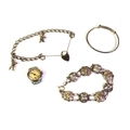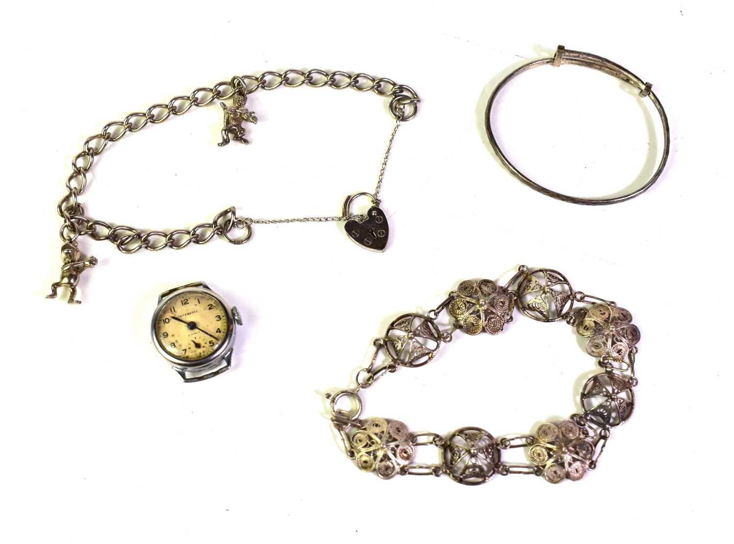 A silver charm bracelet together with a silver filigree bracelet, a silver bangle and an Ingersoll watch.