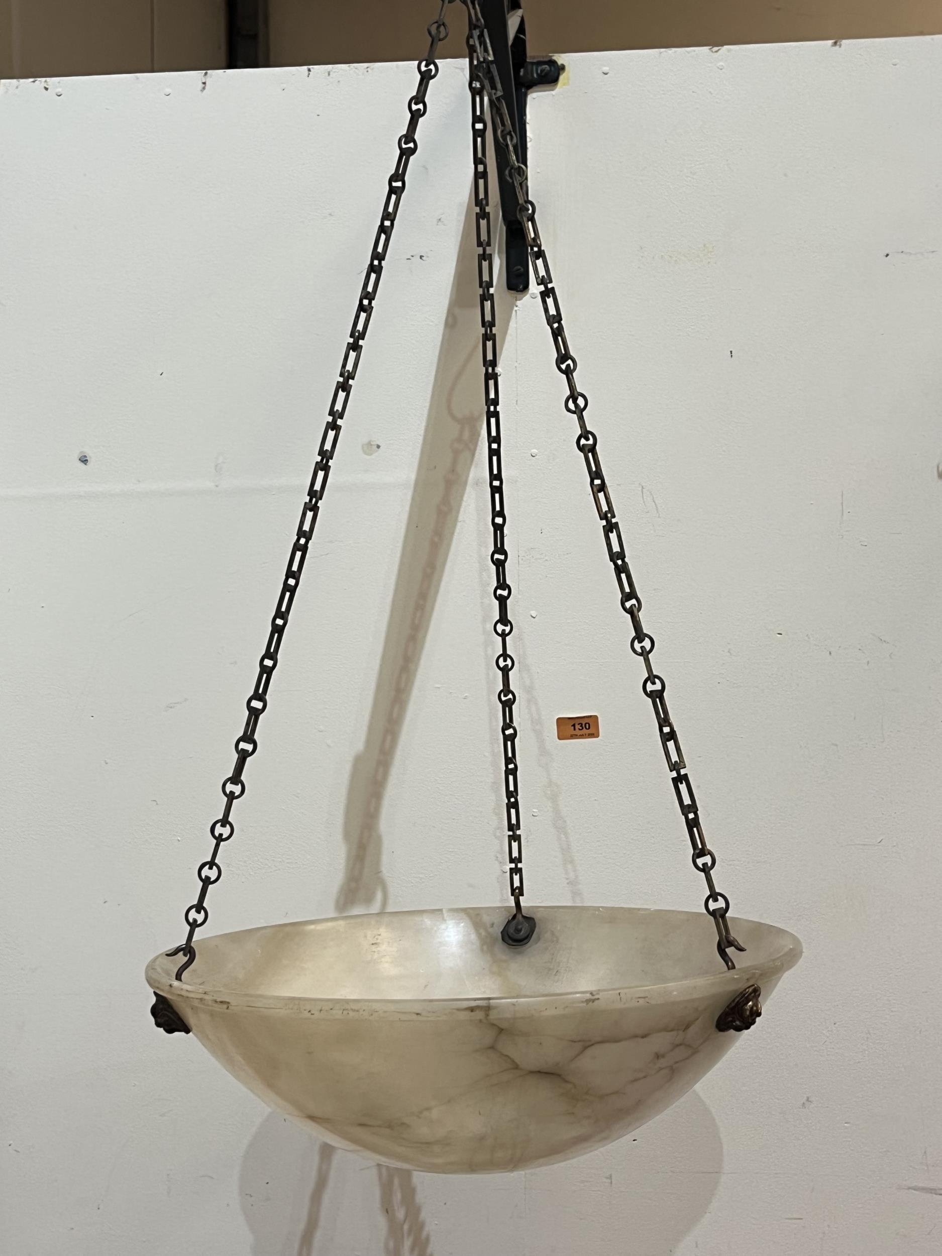 An early 20th century alabaster plafonnier hanging shade with gilt brass suspension chains. Probably French. 16' diam.