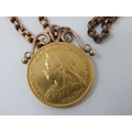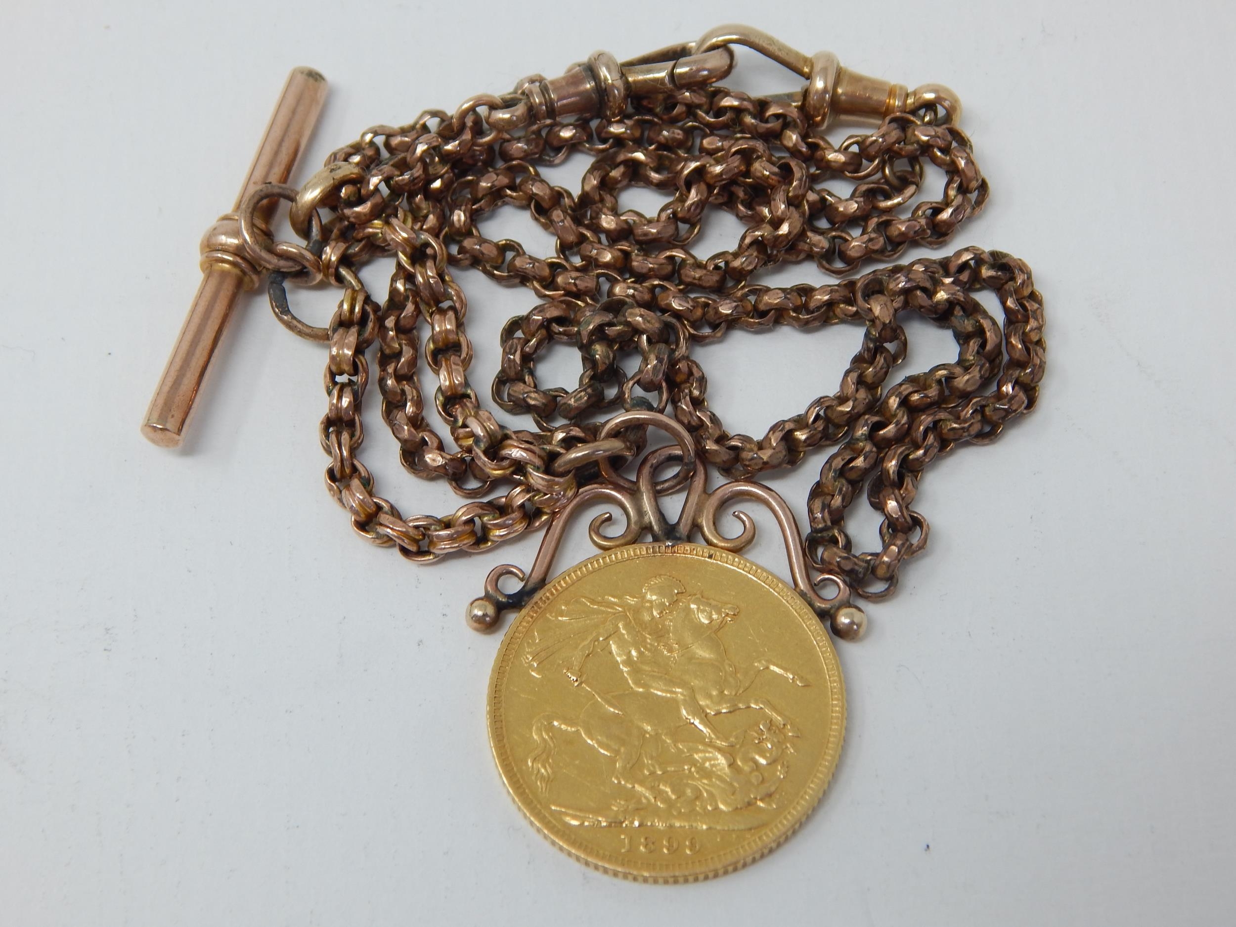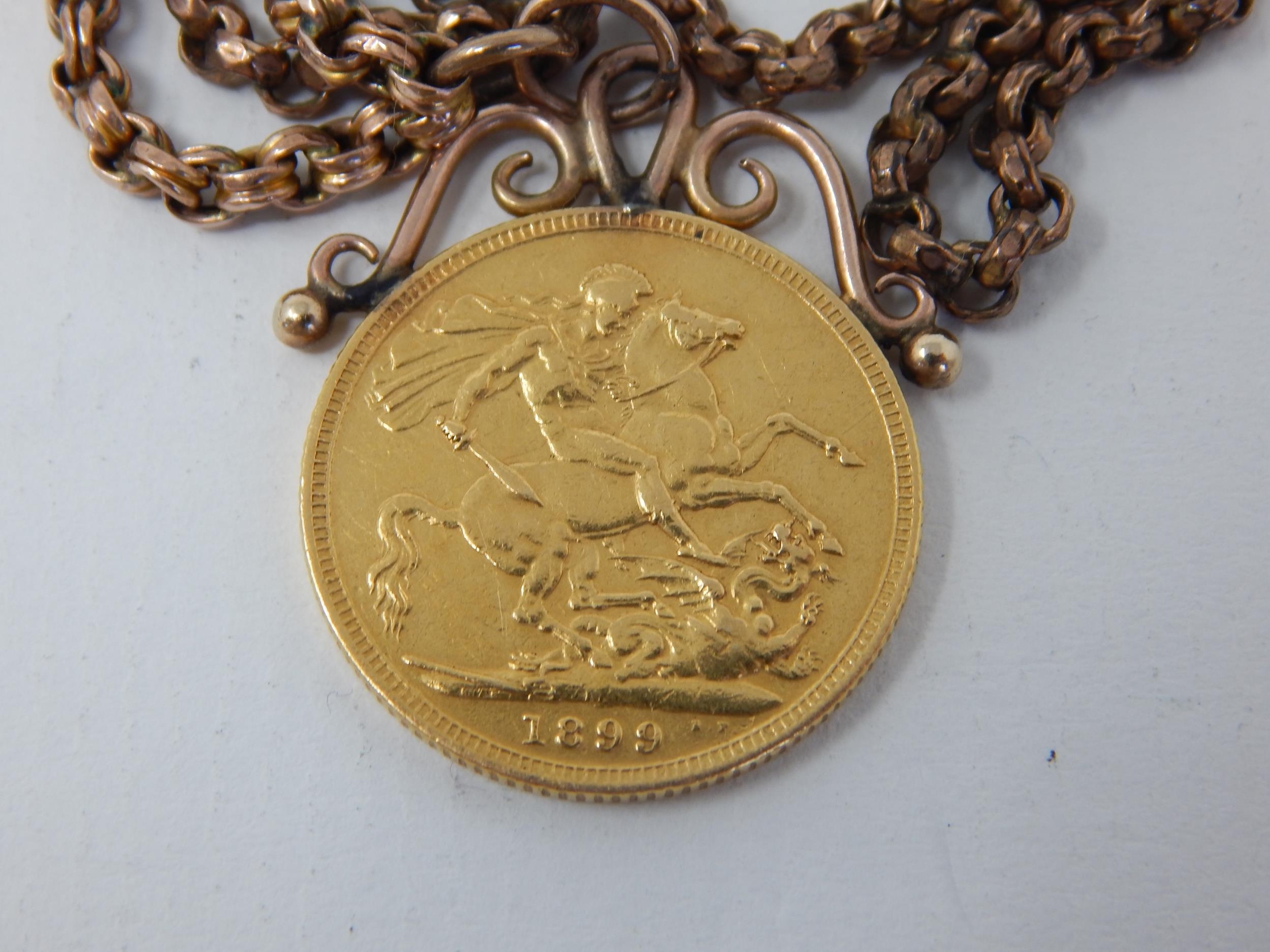 Victorian Full Gold Sovereign 1899 with Attached Loop on 9ct Gold Fob Chain with T-Bar & Clips: Gross weight 24.1g