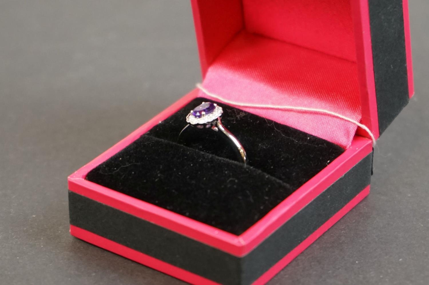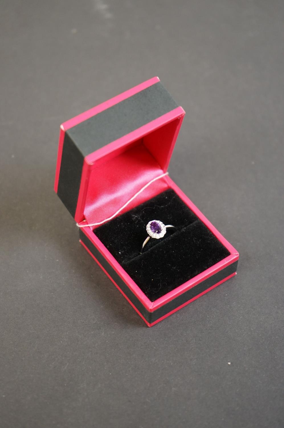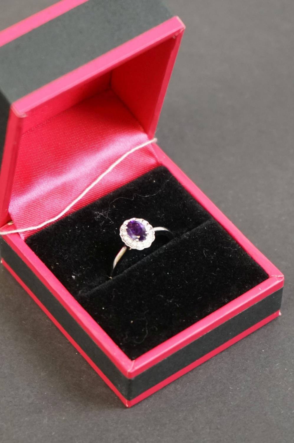 18ct white gold amethyst and diamond cluster ring of 52 points