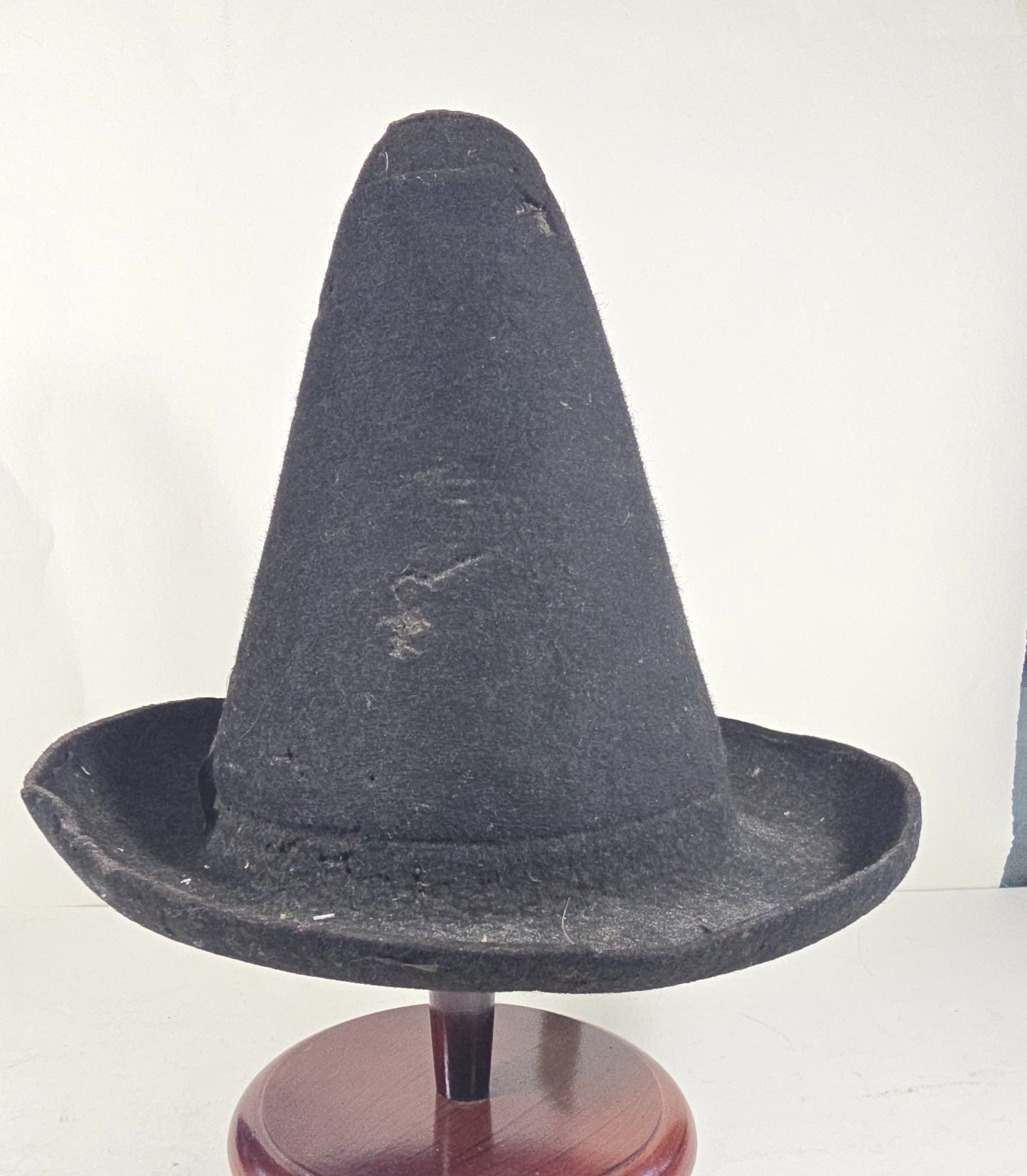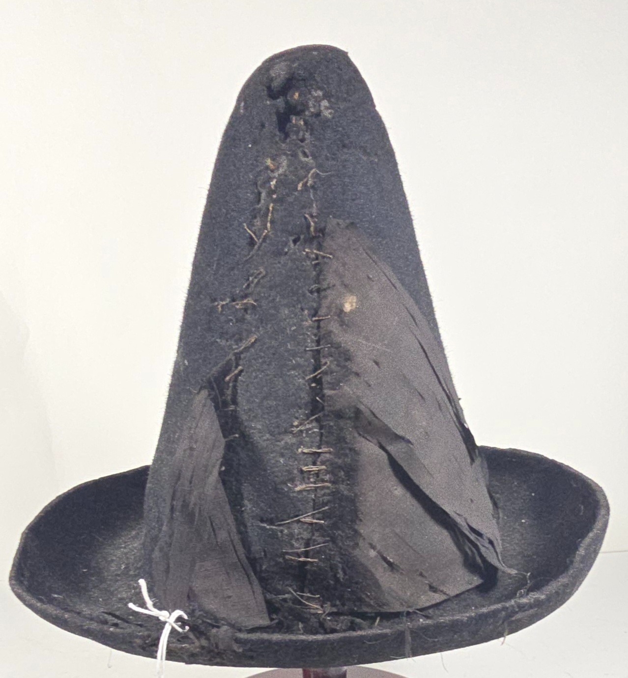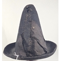 An early (18thcentury?) black felt hat, with conical skull, upturned brim and remains of silk facings. Quite GC for age, mothed.