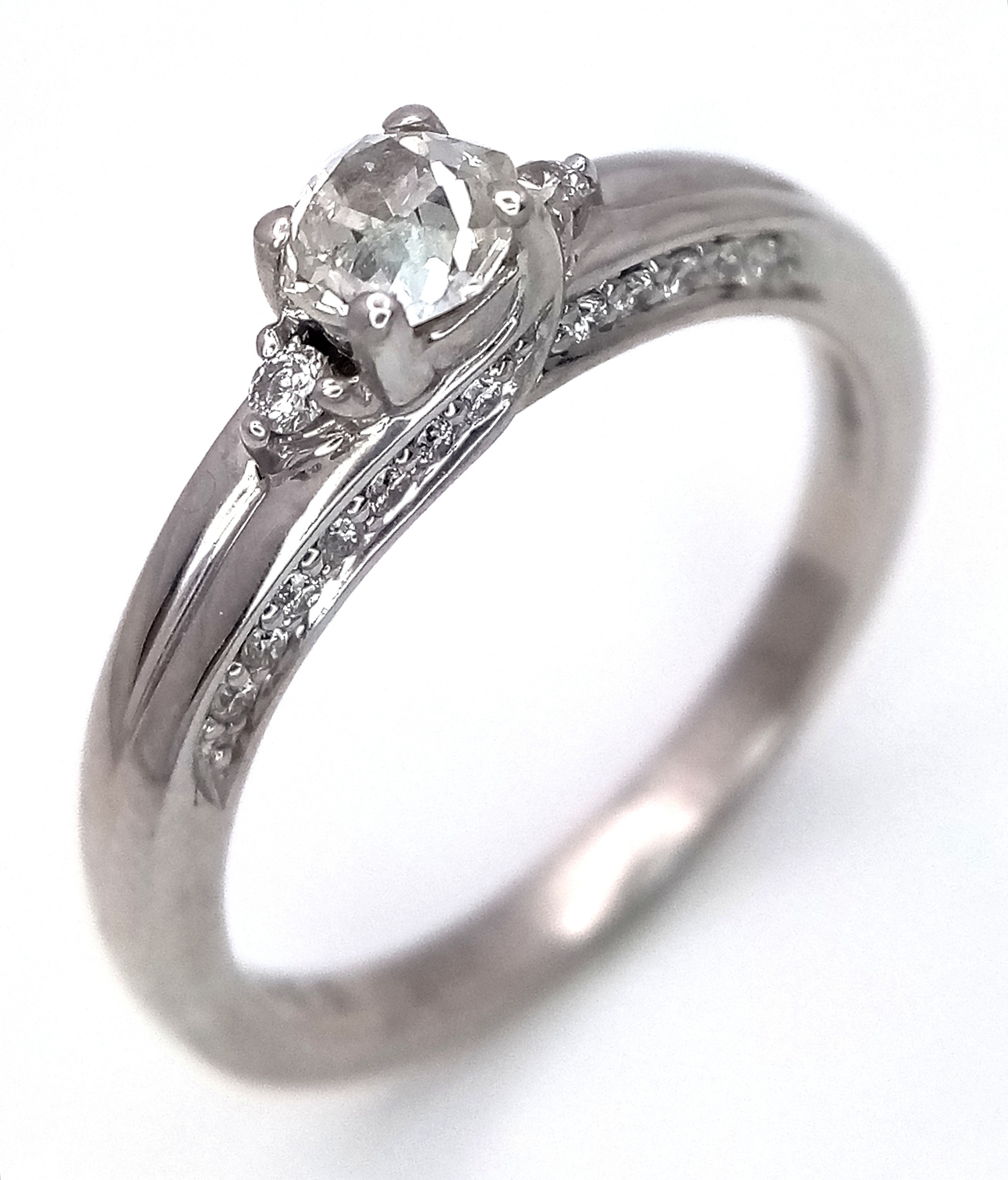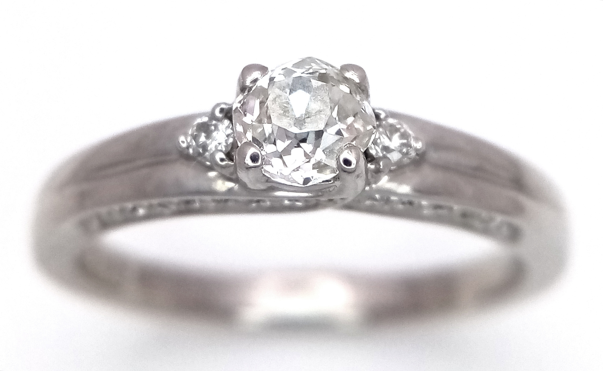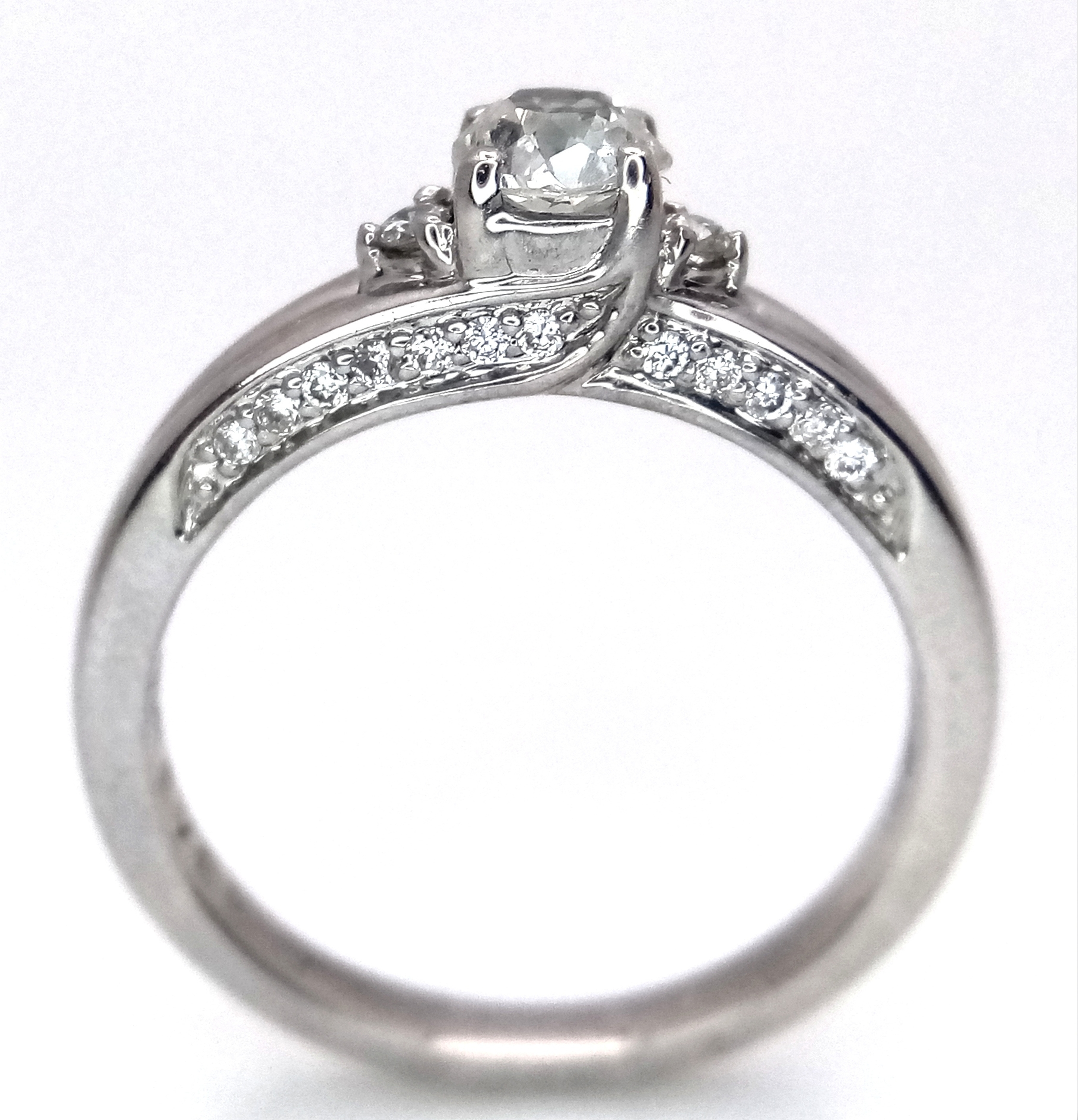 An 18k white gold diamond trilogy ring with diamond underside, 0.40ct diamond weight, 4.2g total weight, ring size O. NM06