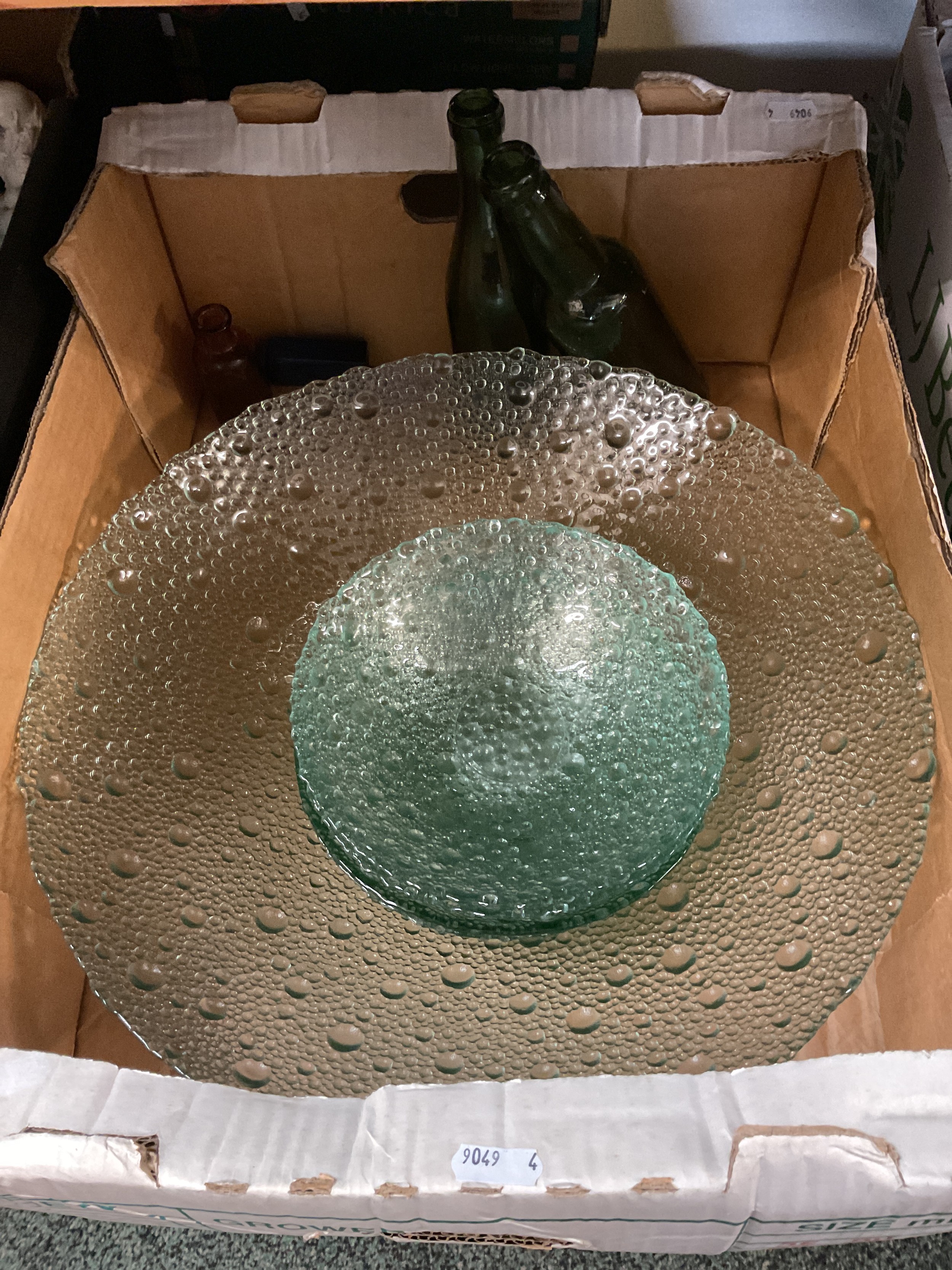 A selection of glass ware to include bowls and vintage bottles
