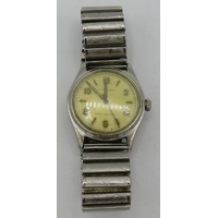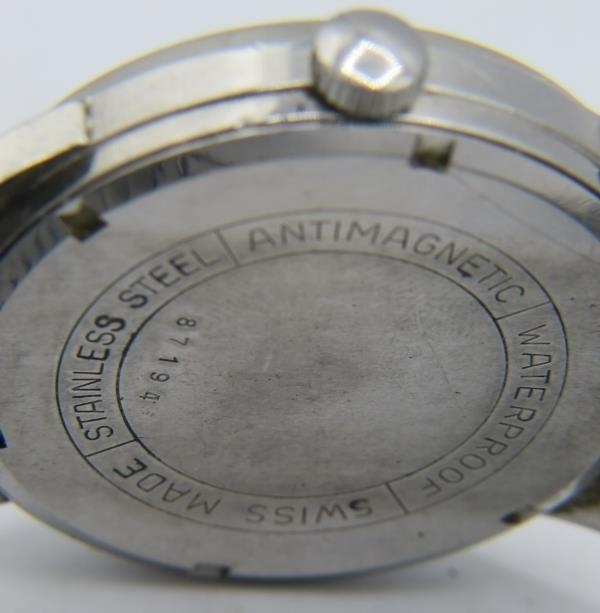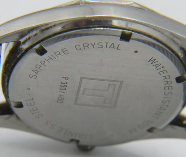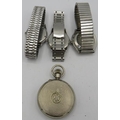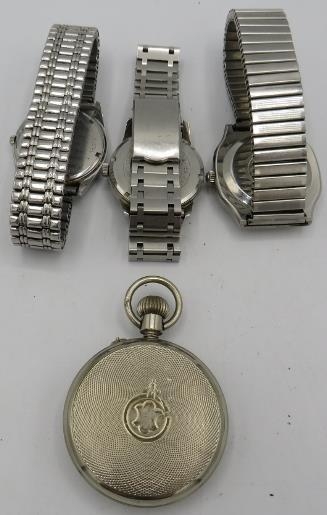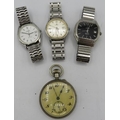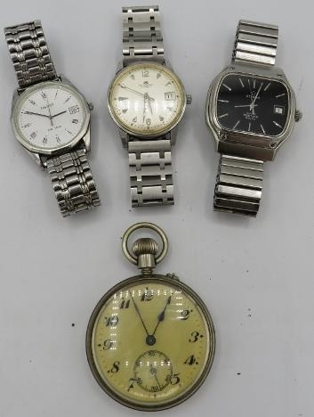 A vintage Bucherer 21 Jewel stainless steel watch, a Tissot PR100 P360/460 men's watch, an Eterna Neptune Kontiki Quartz men's watch and a 20th century pocket watch.