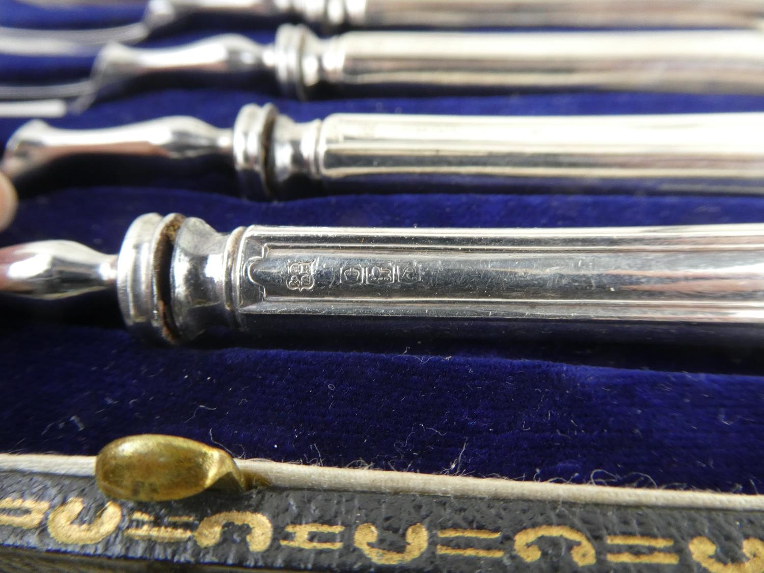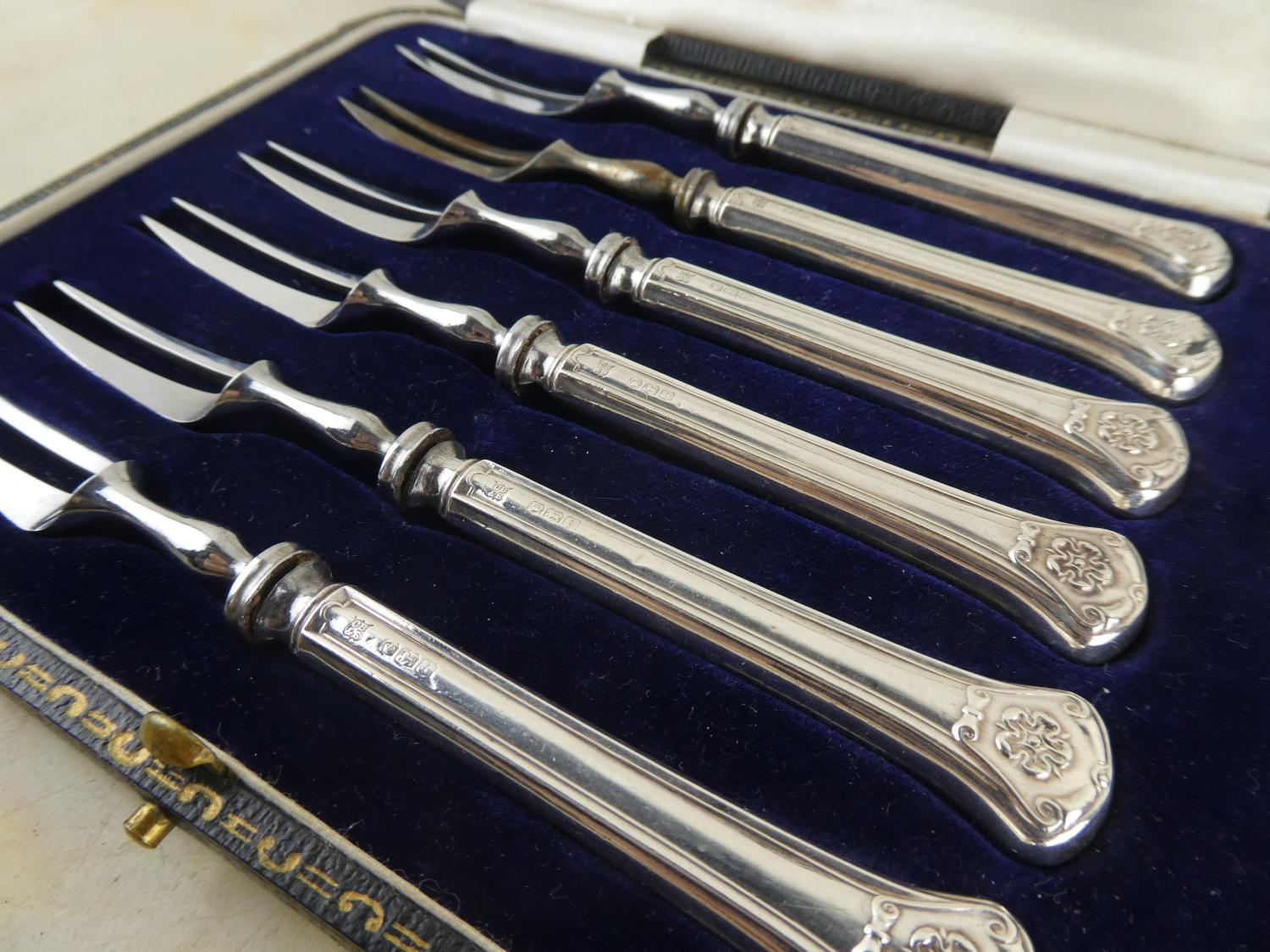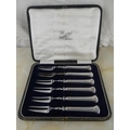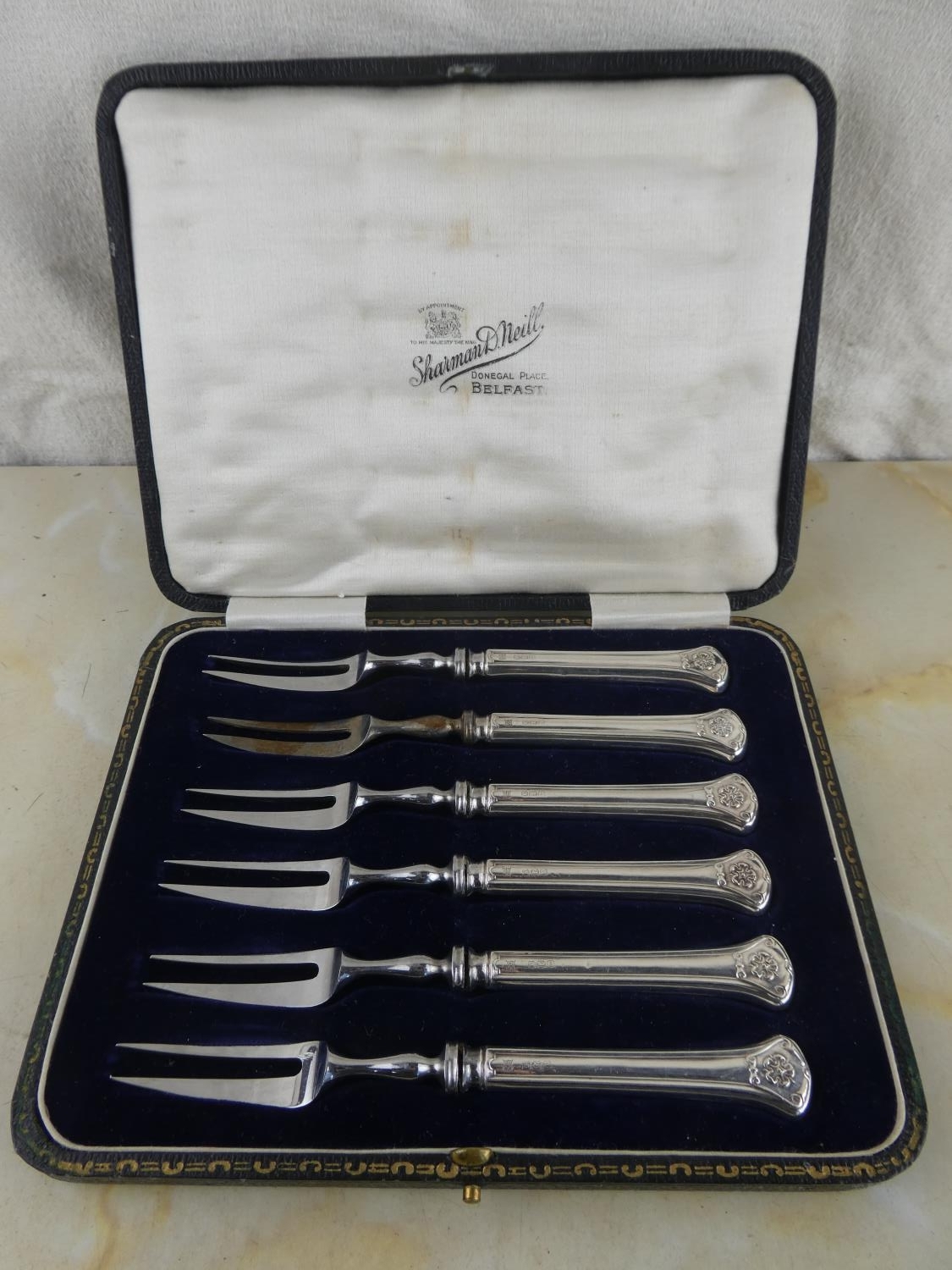 A stunning boxed set of sterling silver pickle forks by Sharman D Neill, Belfast