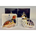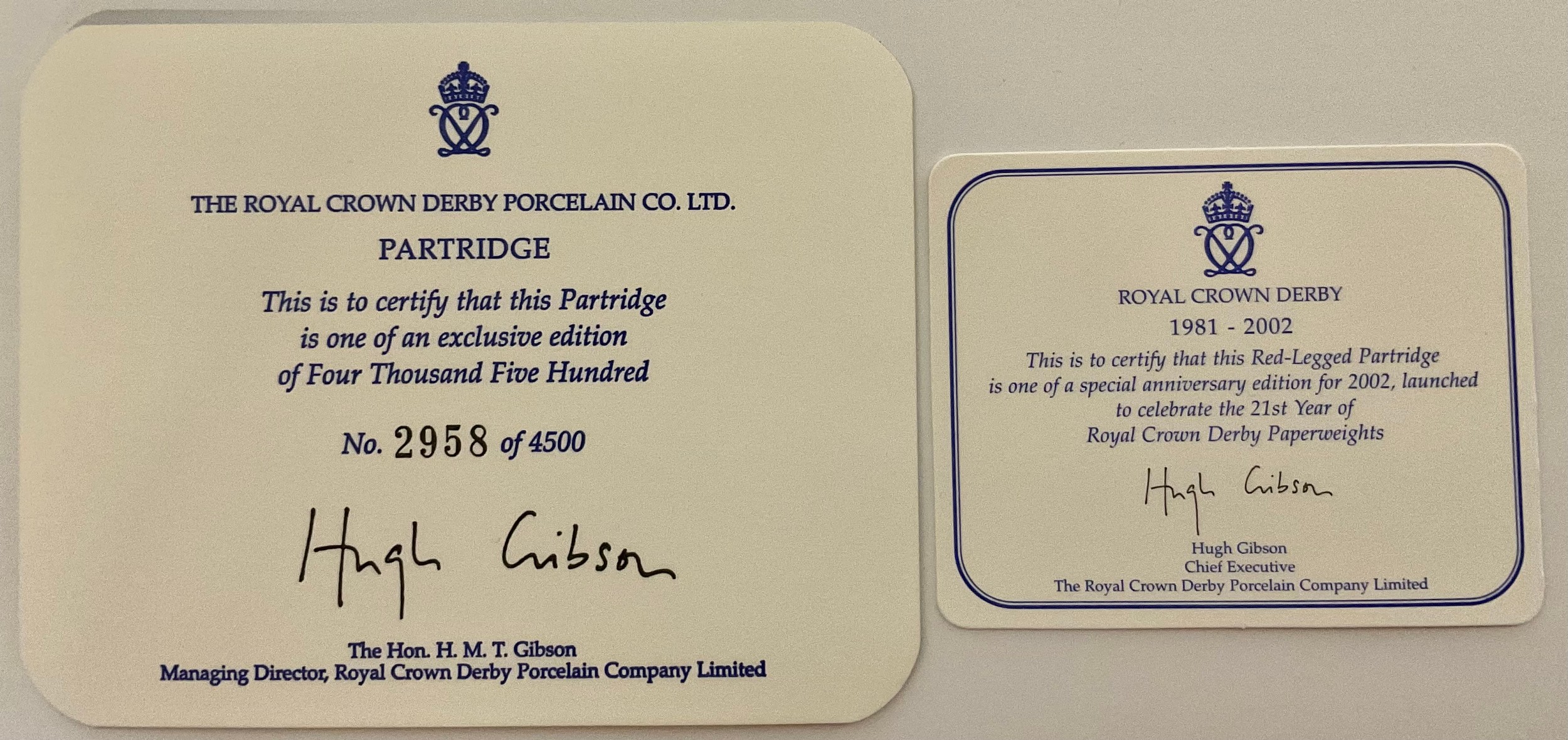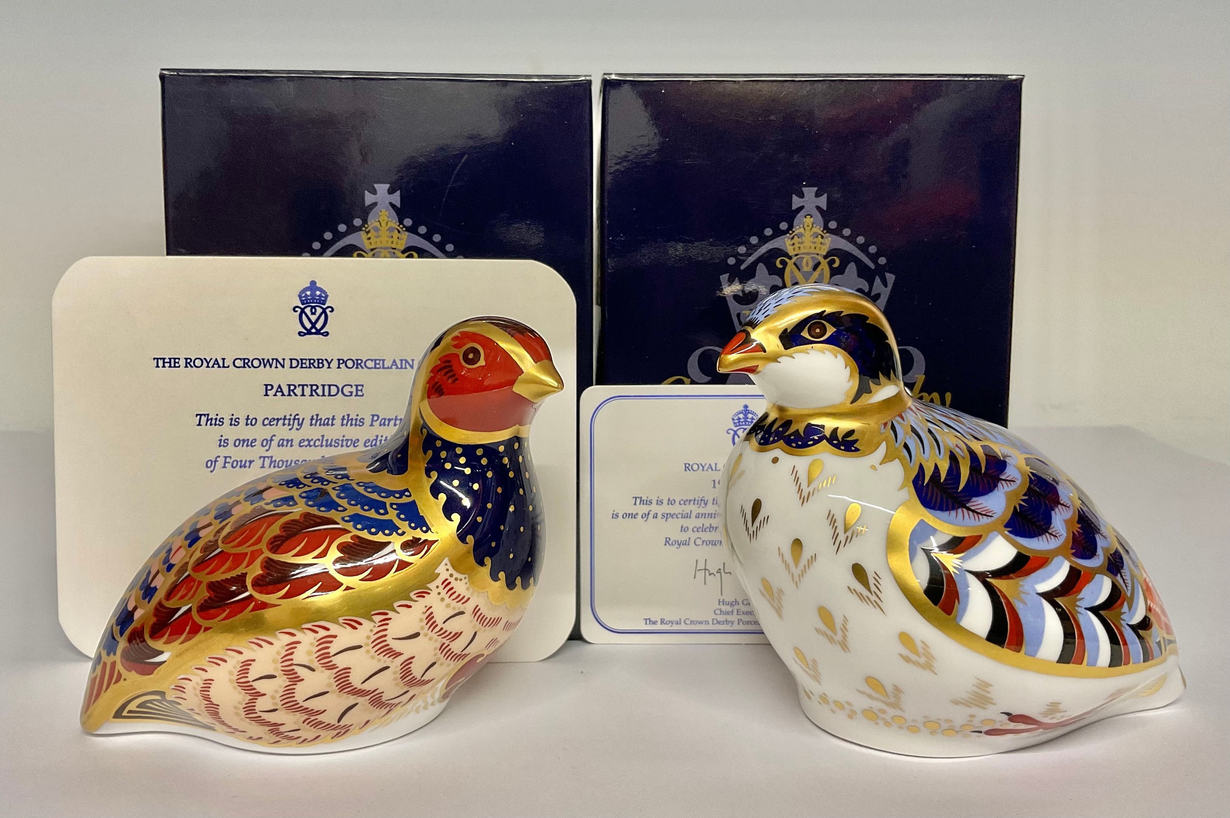 A Royal Crown Derby paperweight, Red Legged Partridge, special anniversary edition for 2002, designed by Tien Manh Dinh, gold stopper, 8.5cm high, printed mark in red, certificate, boxed; another, Partridge, exclusive limited edition 2,958/4,500, gold stopper, 7.5cm high, printed mark in red, certificate, boxed (2)