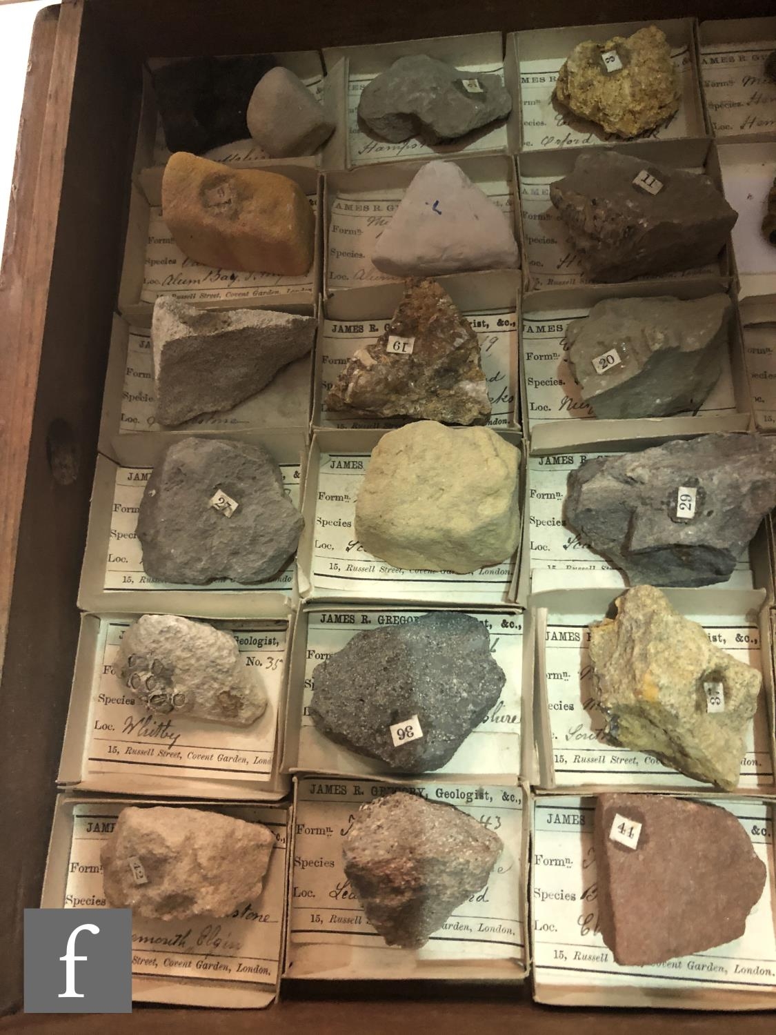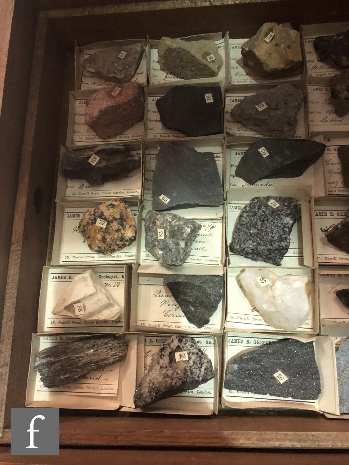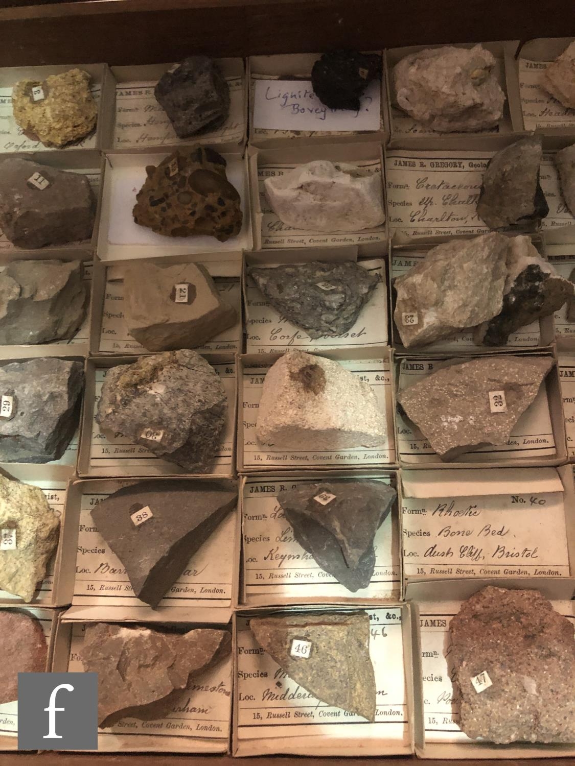 A 19th Century collection of rock specimens contained in fitted tray divisions, by James R.Gregory, Geologist London, width 44.5cm.