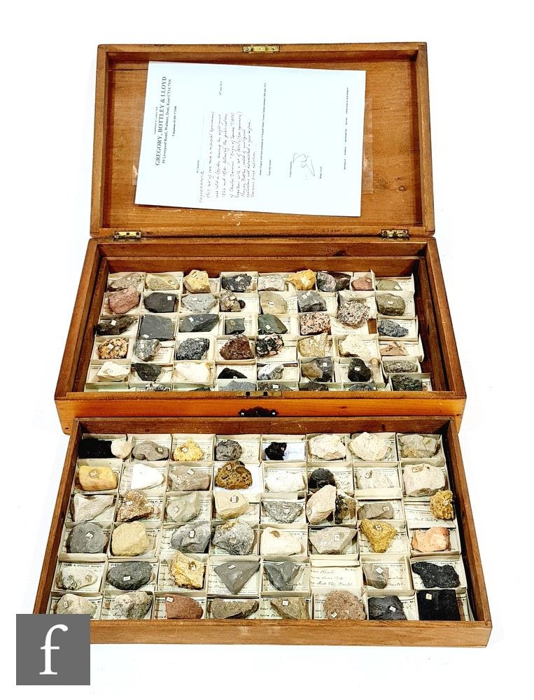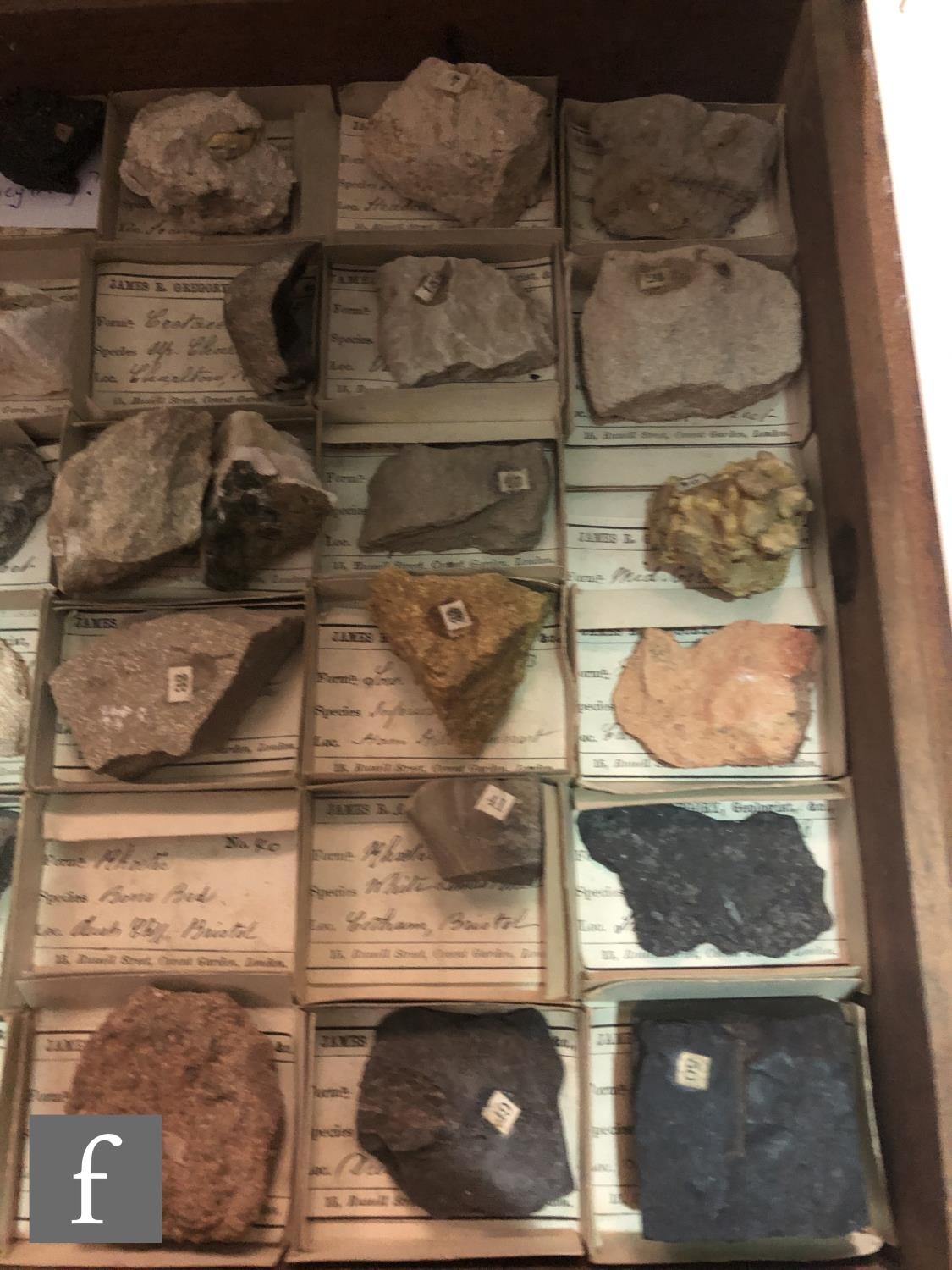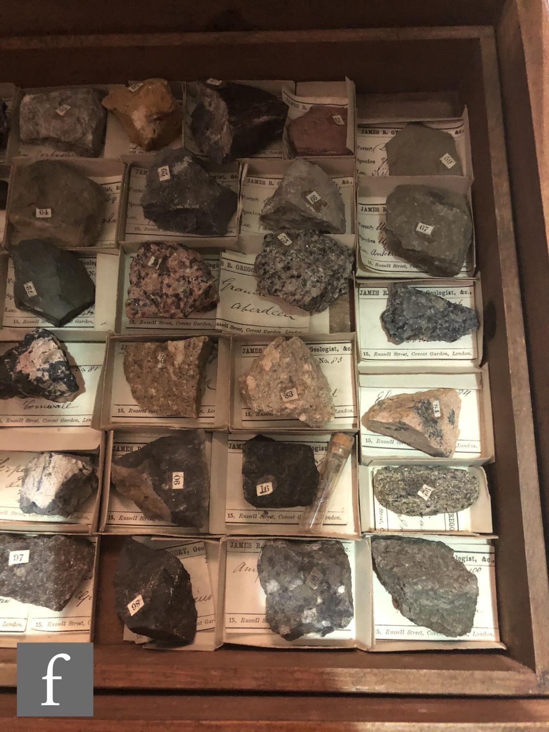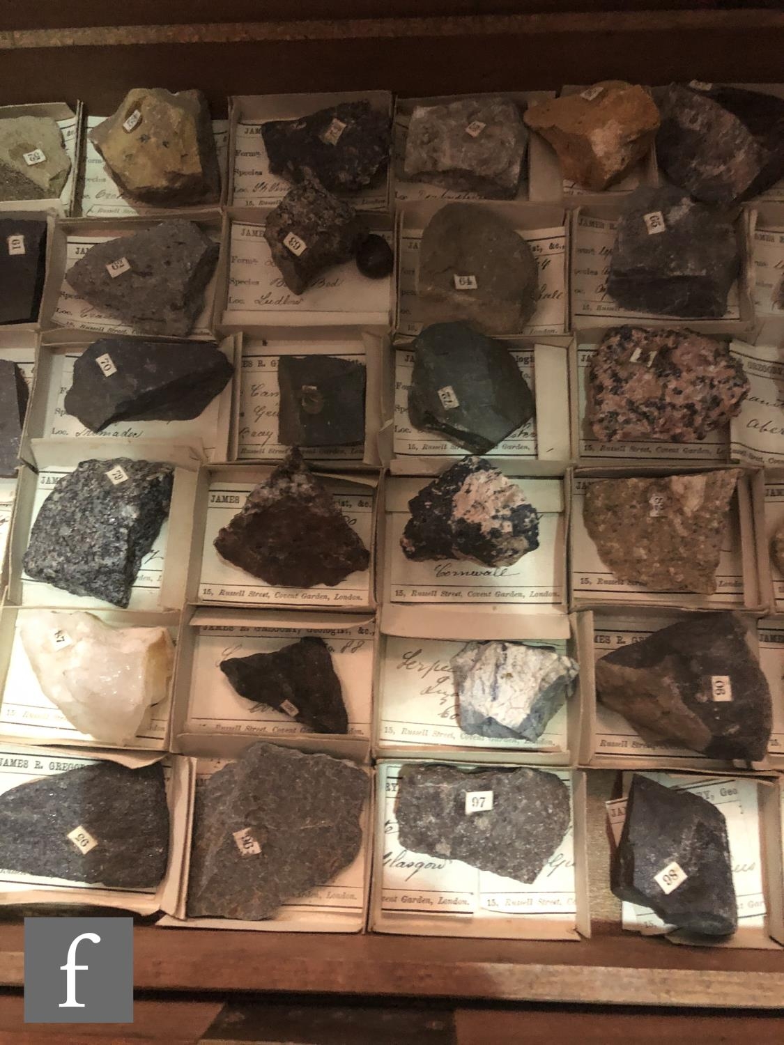 A 19th Century collection of rock specimens contained in fitted tray divisions, by James R.Gregory, Geologist London, width 44.5cm.