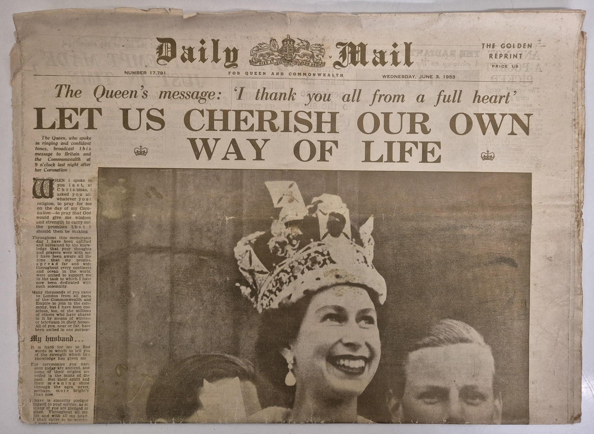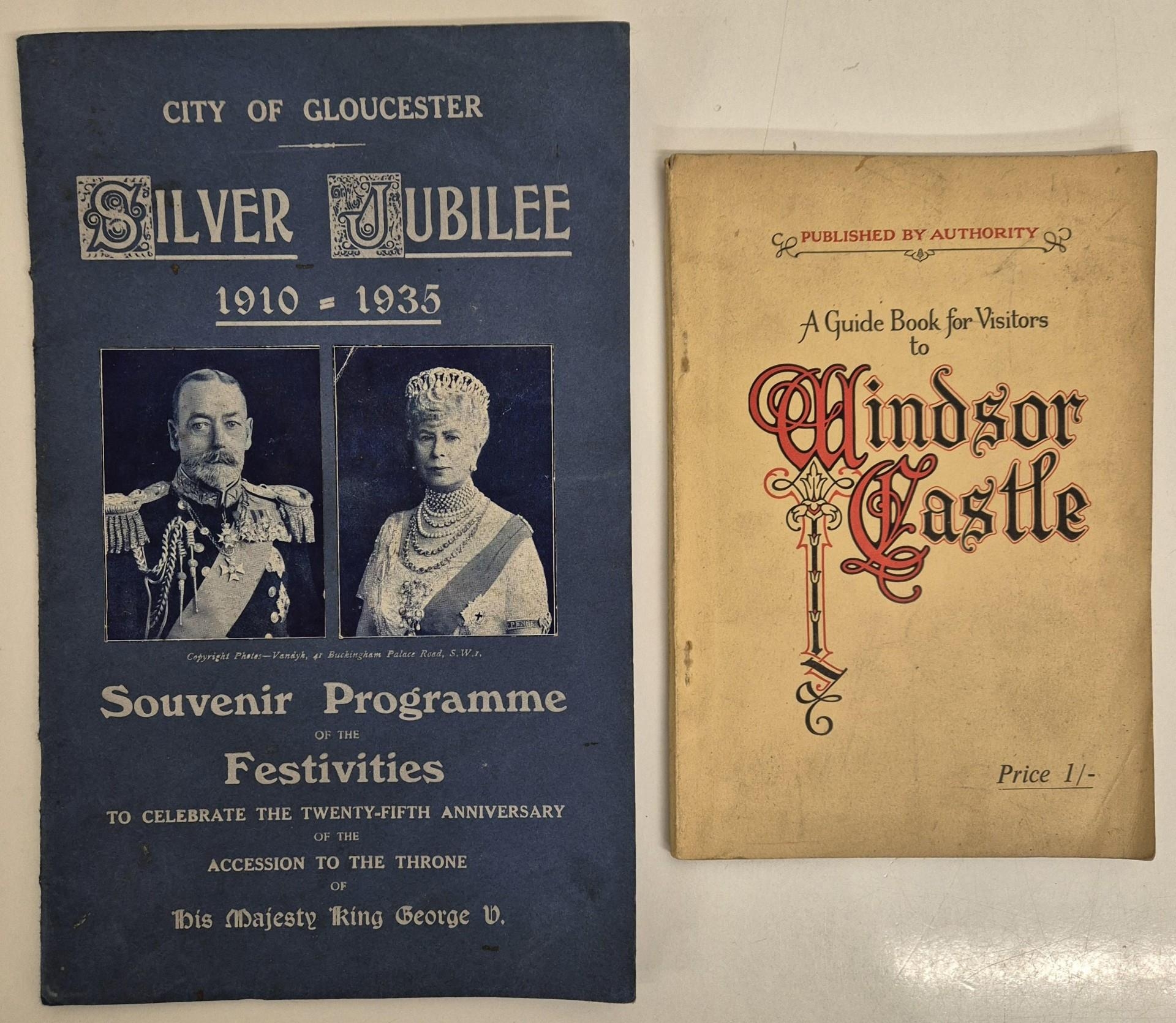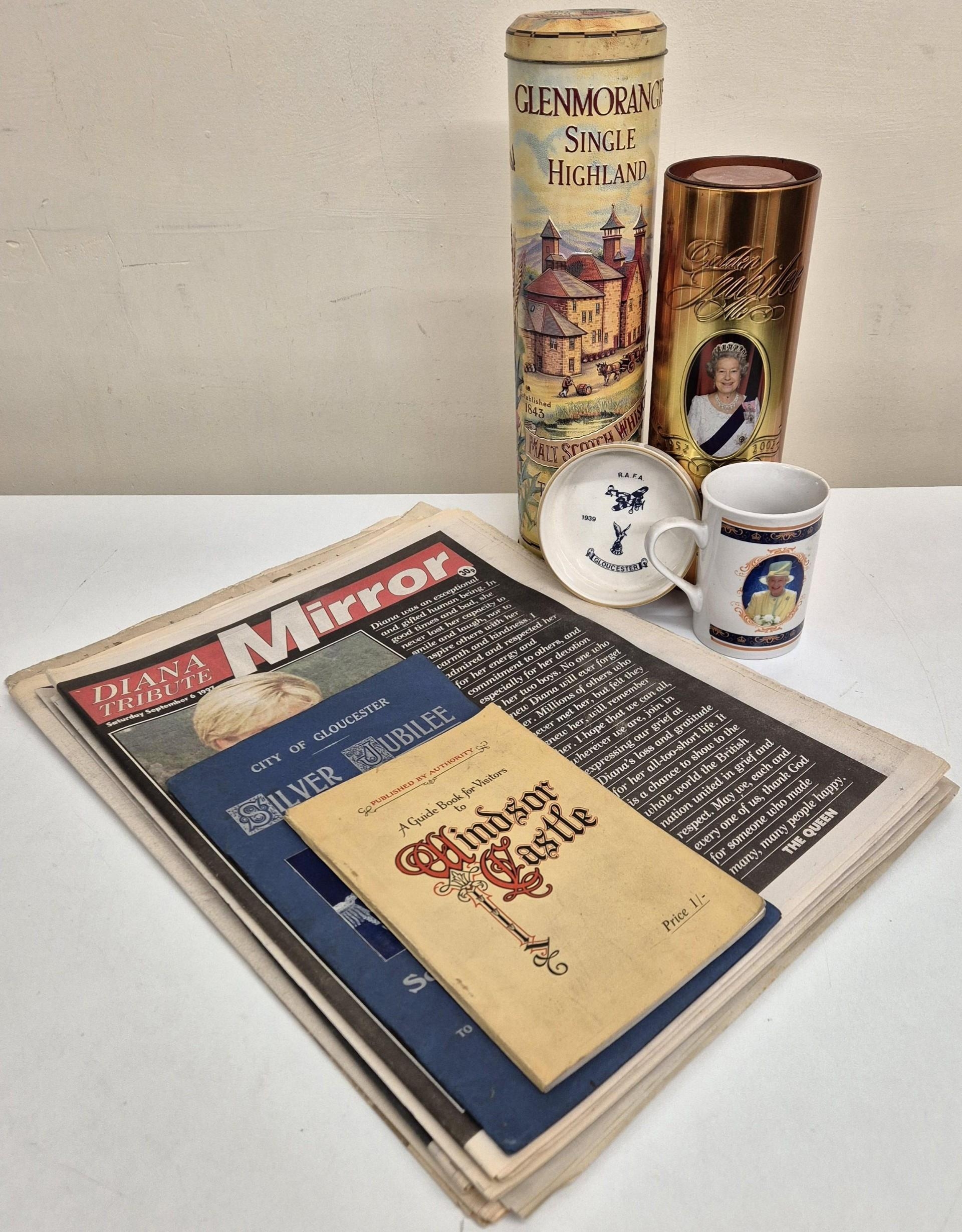 A collection of royal memorabilia. To include King George V silver jubilee Gloucester souvenir programme, vintage Windsor Castle guidebook, newspapers, ceramics, whisky tins, etc.