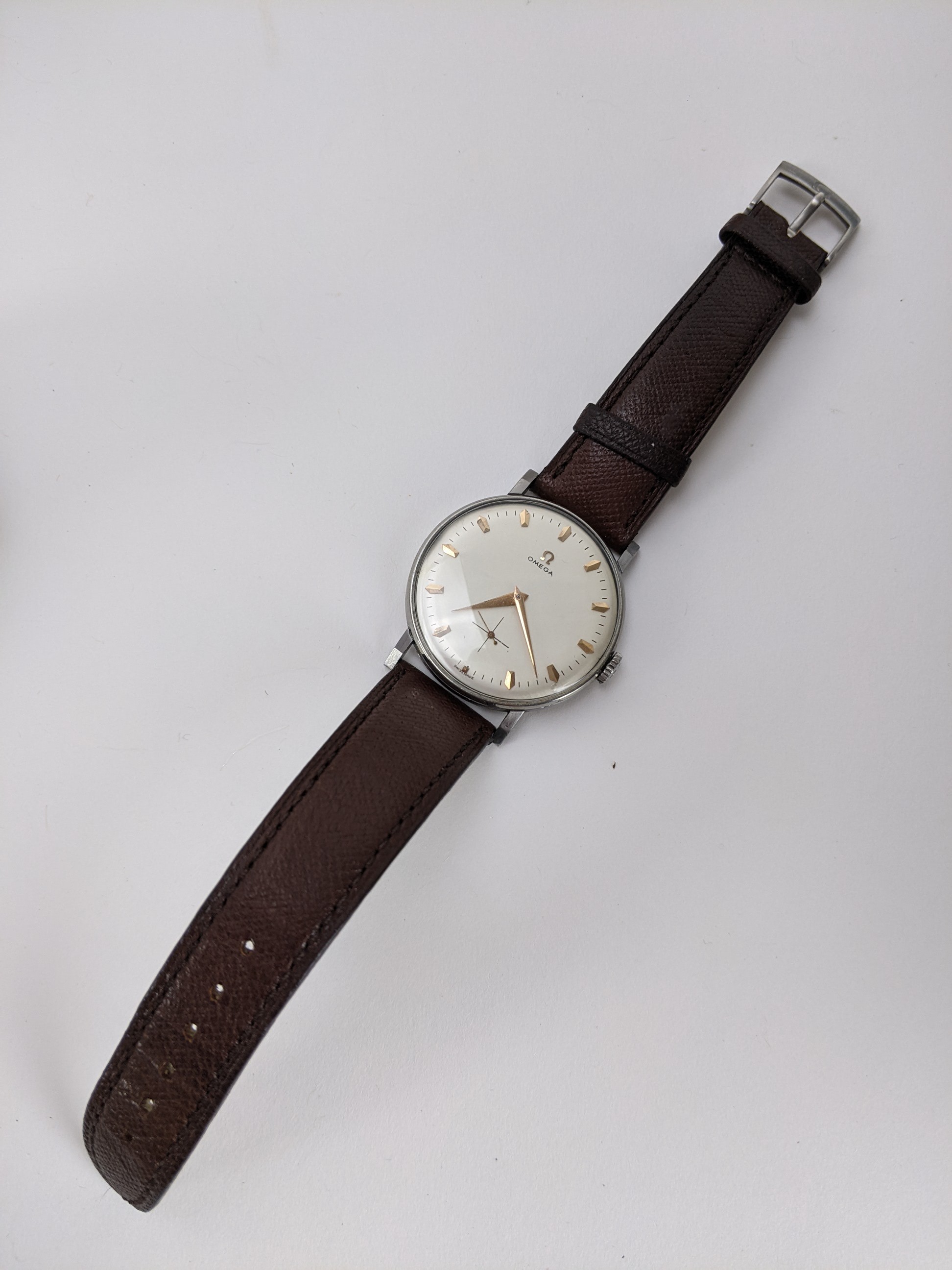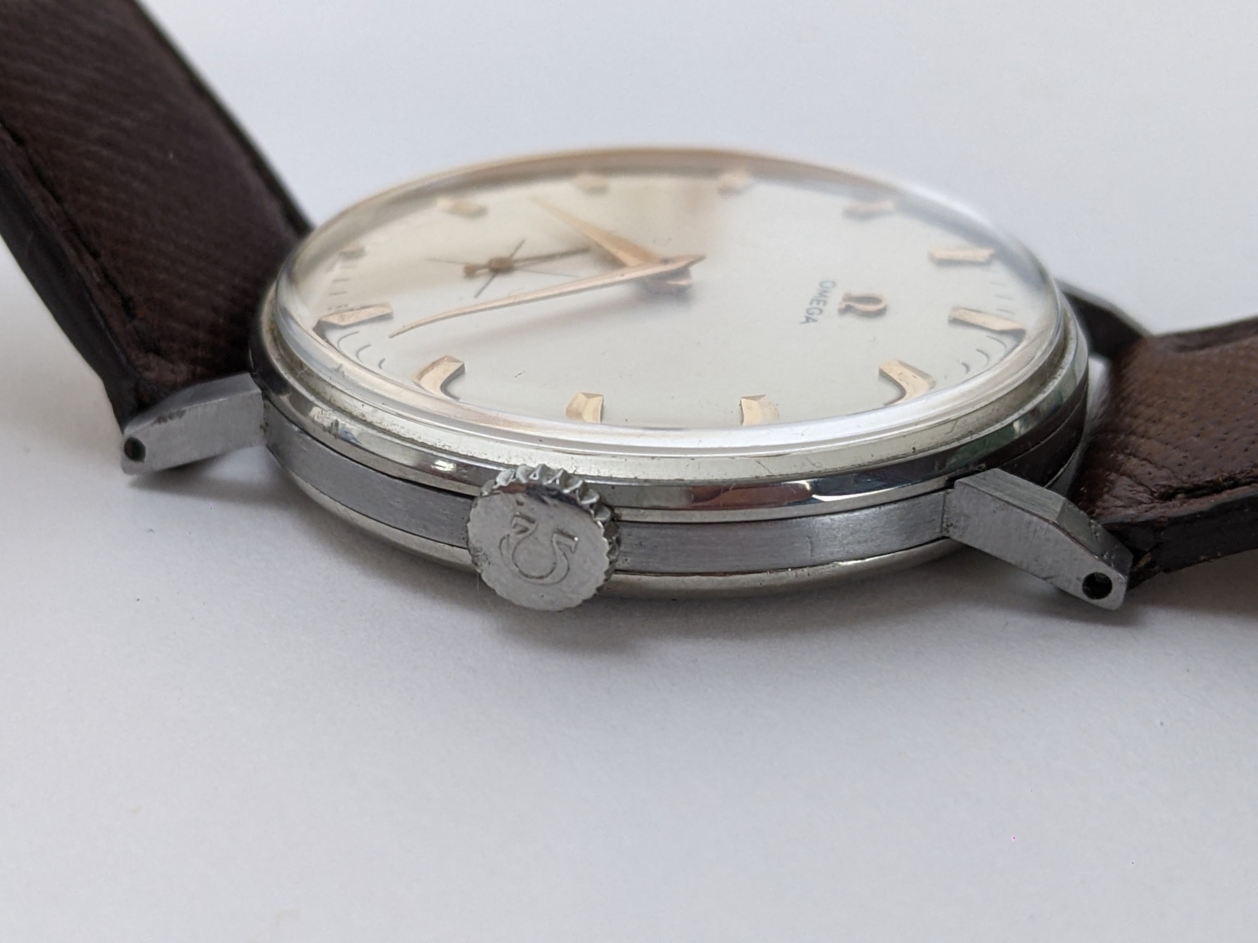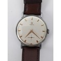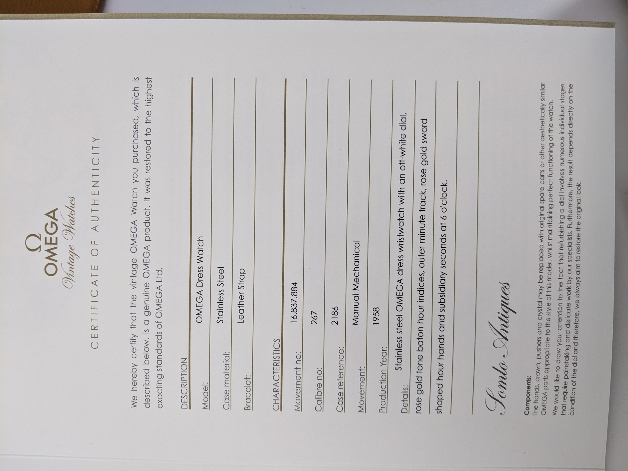 A Omega manual wind gents wristwatch, circa 1958, having a white enamel dial with gilt applied hour markers and subsidiary seconds, the movement numbered 16837XXX, case back numbered 2186, on a later brown leather strap, 37.5mm, together with paperwork and a modern Omega presentation case and outer white box