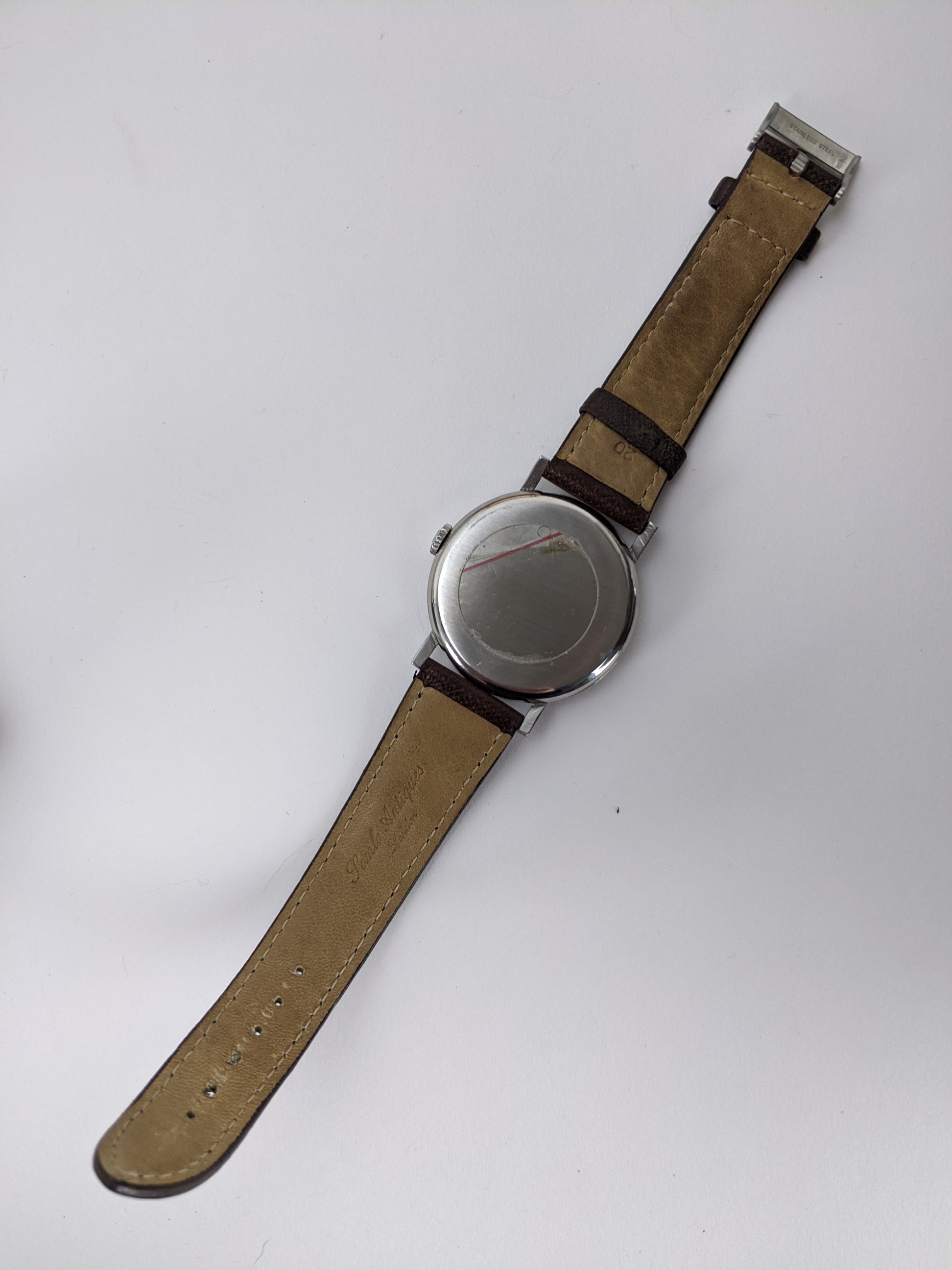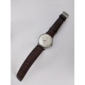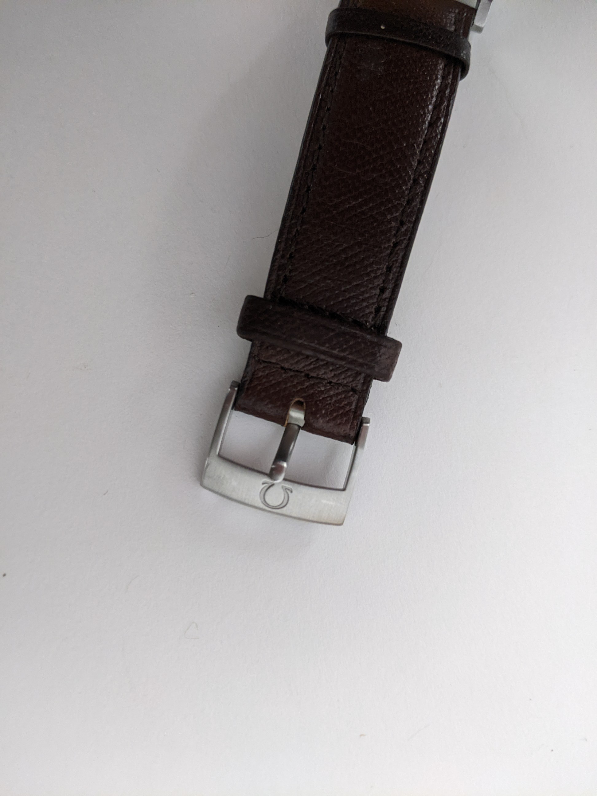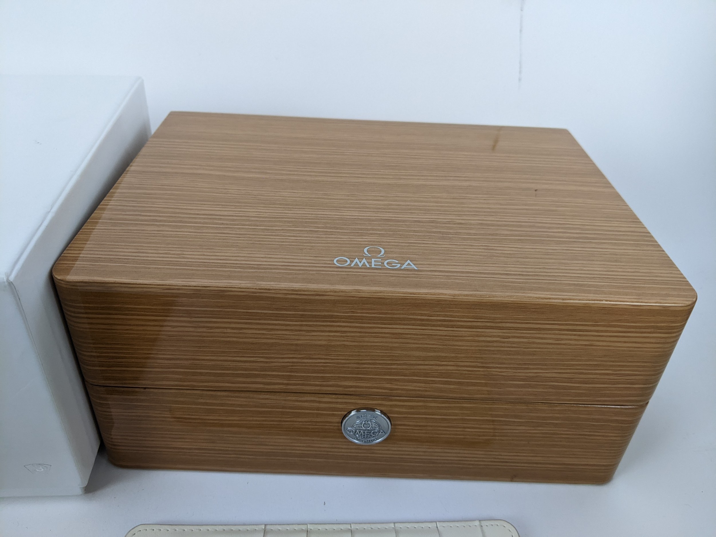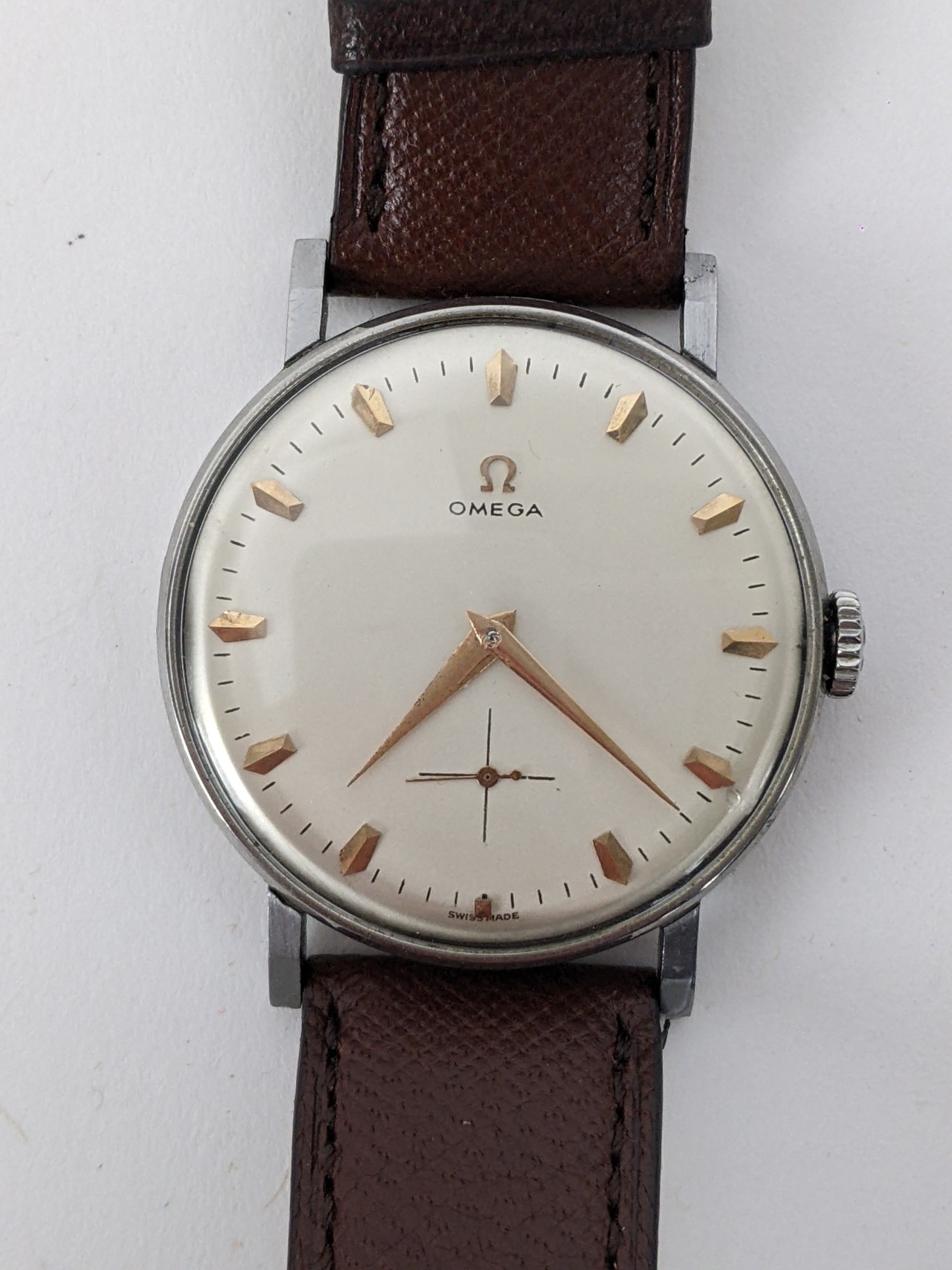 A Omega manual wind gents wristwatch, circa 1958, having a white enamel dial with gilt applied hour markers and subsidiary seconds, the movement numbered 16837XXX, case back numbered 2186, on a later brown leather strap, 37.5mm, together with paperwork and a modern Omega presentation case and outer white box