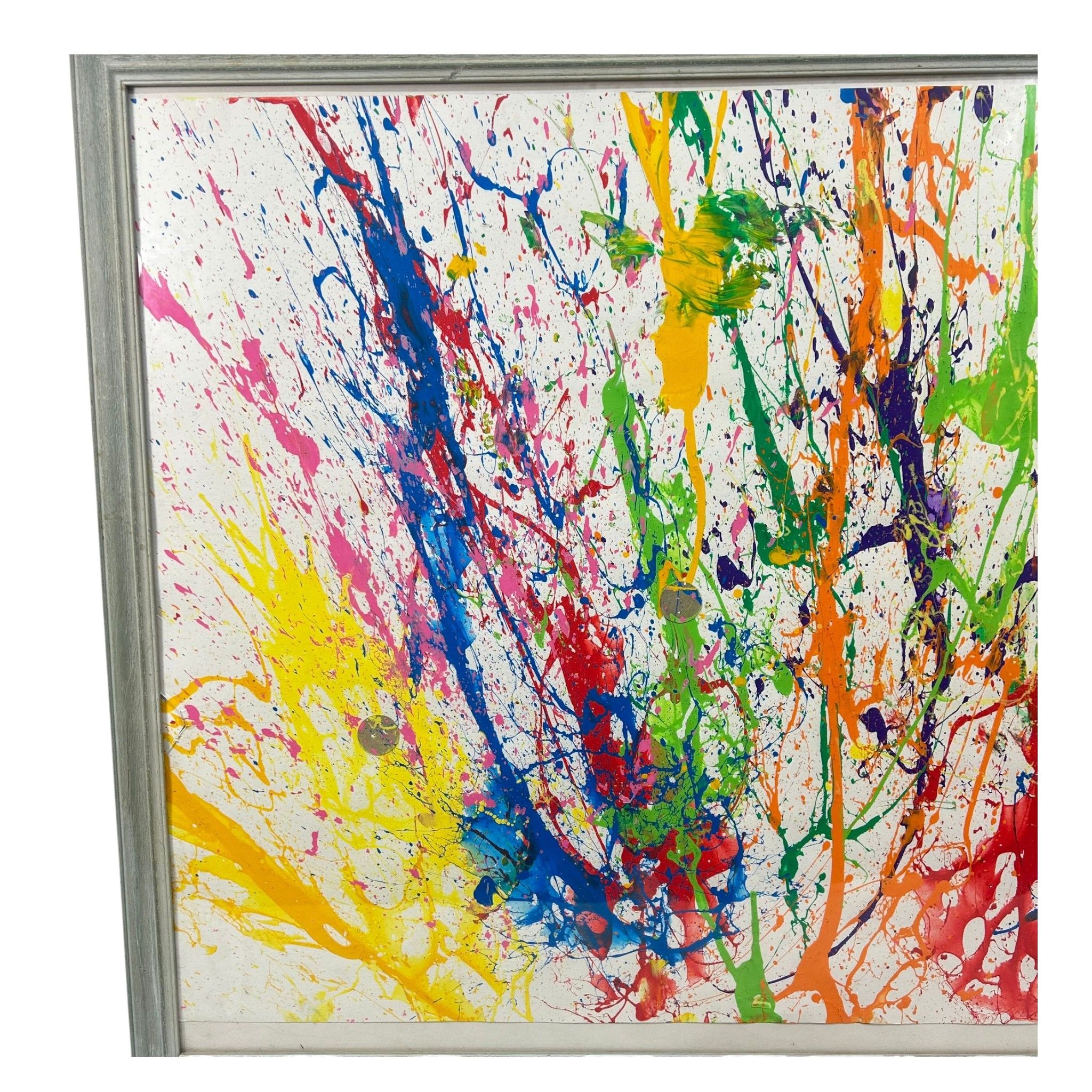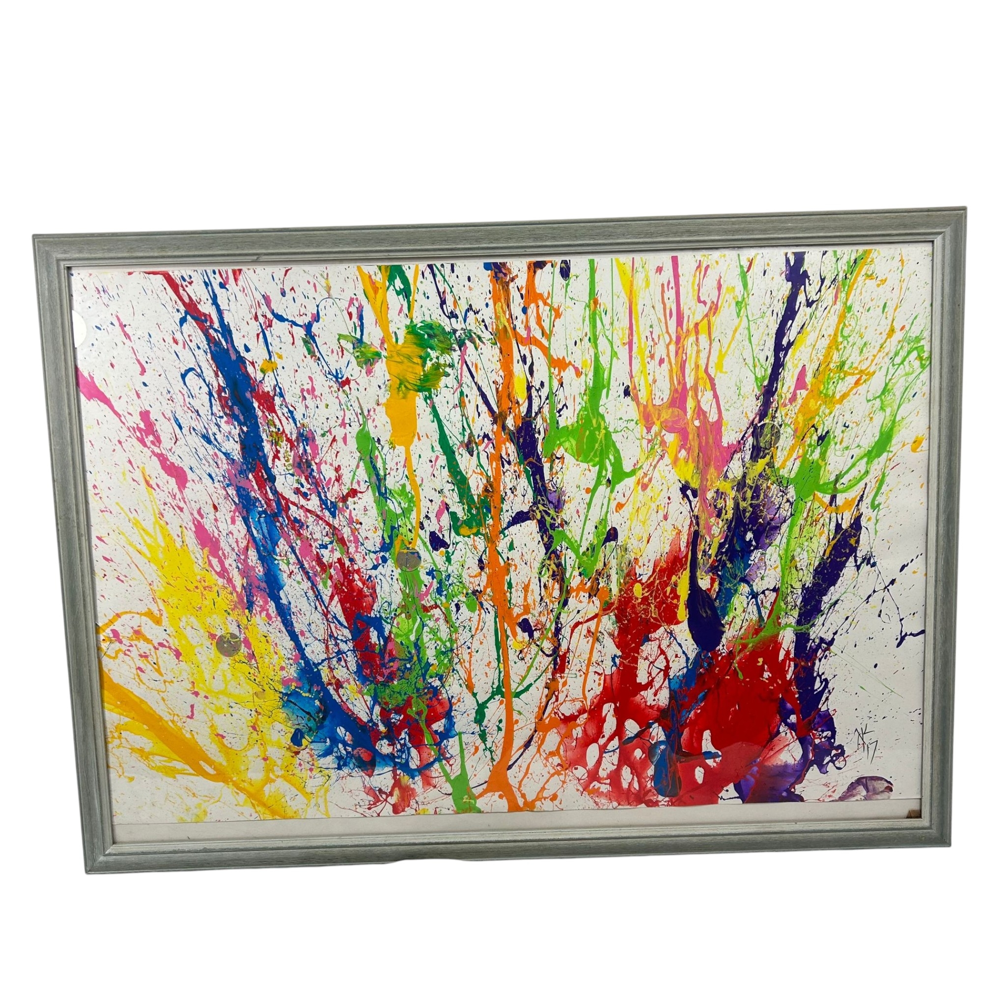 A vibrant abstract composition characterised by energetic splashes and dripped passages of colour across a white ground. Executed with spontaneity and physicality, Take Off demonstrates King’s confident handling of acrylic, balancing gestural movement with areas of controlled intensity. The work reflects her long-standing interest in abstraction and process-driven painting, informed by her time living and working in Cornwall, particularly St Ives.