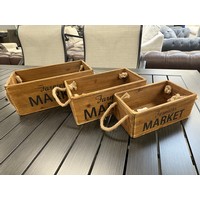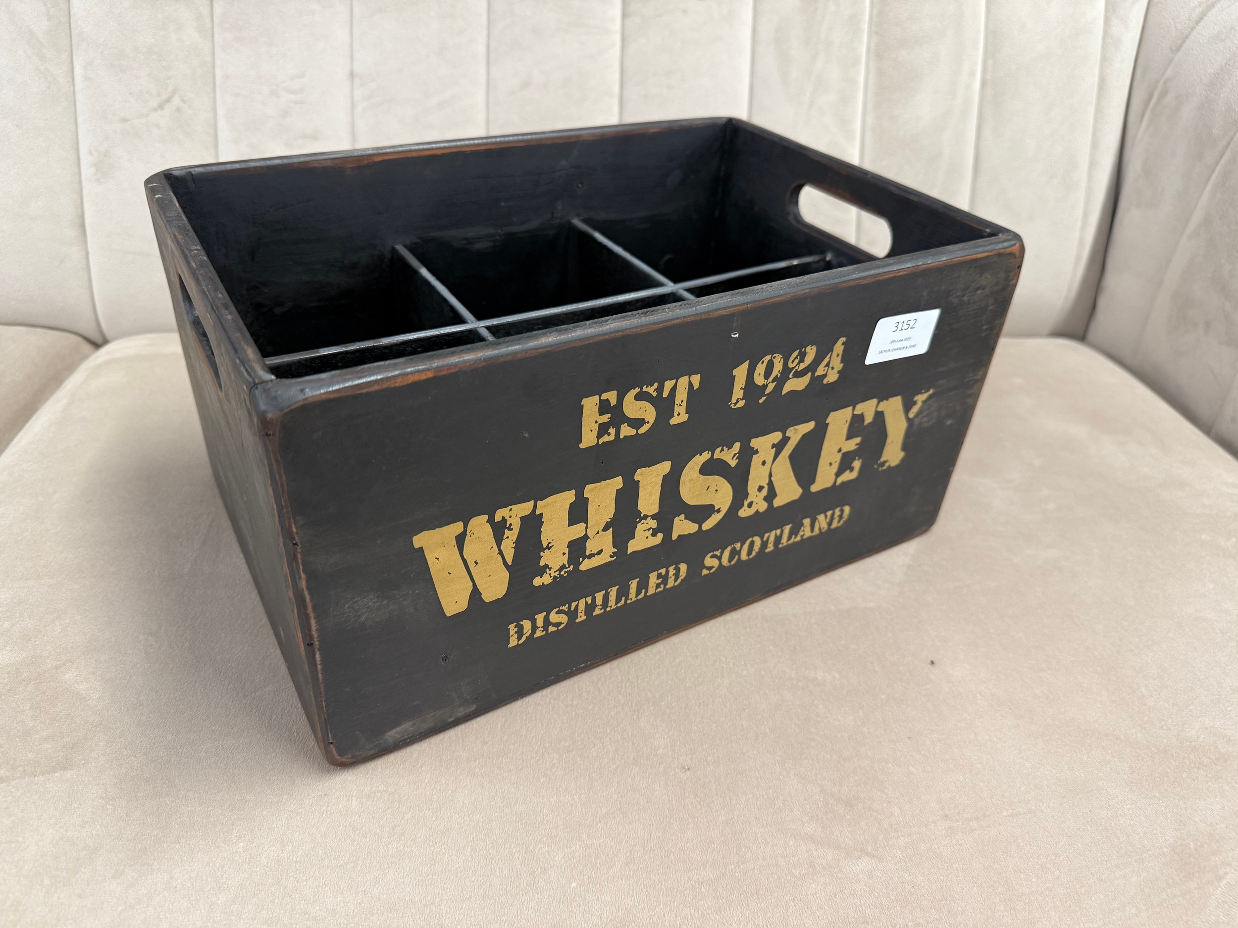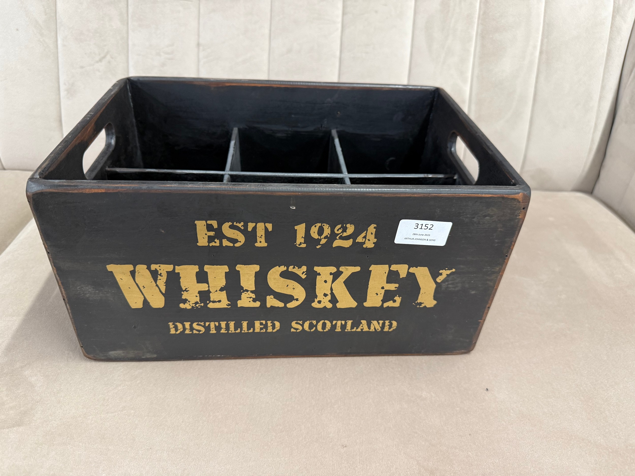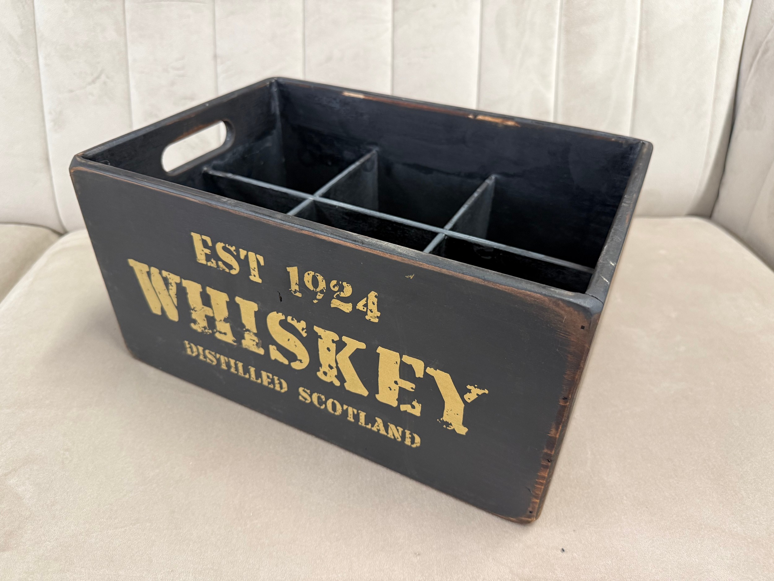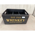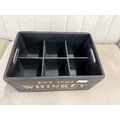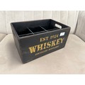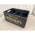 A black painted wooden six bottle decorative whiskey crate