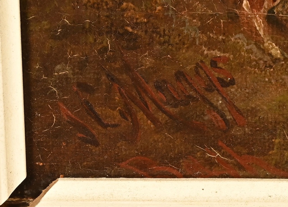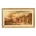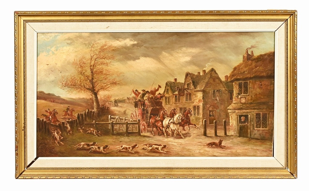 James Charles Maggs (often known as John 1819-1896), oil on canvas coaching and foxhunting scene. 34.5 cm x 85 cm, framed, signed.