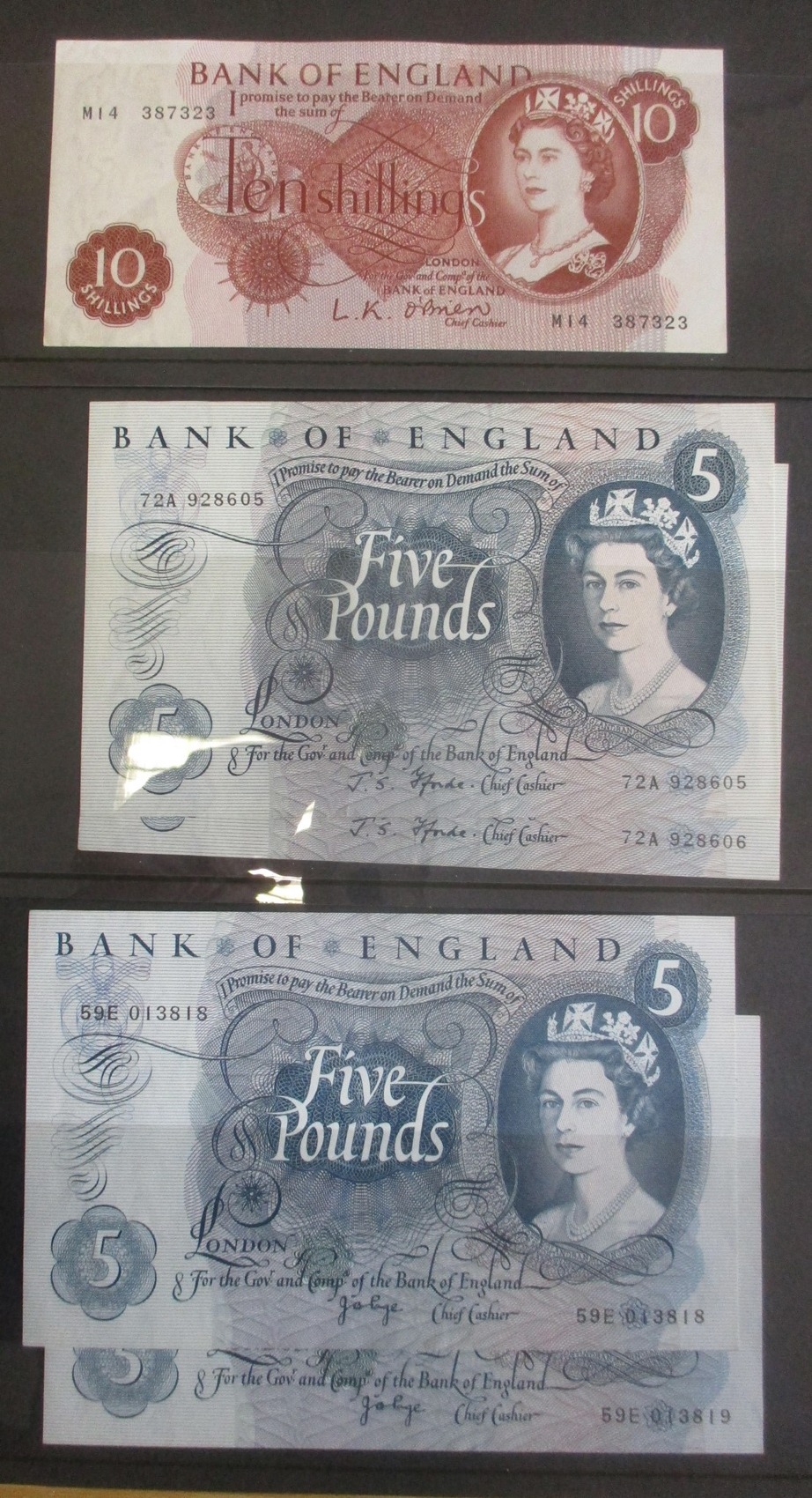 Range of banknotes, generally extremely fine to near uncirculated, with O'Brien 10/- M14 387323 replacement run, Fforde £5 72A 928605 to ...606 consecutive pair, £1 B11Y 937231 first run issue (Duggleby B301), Error 10/- 75K 479582 offset partial front design on back (BNYB E2d(ii)) and Page £5 59E 013818 to ...819 consecutive pair. Qty 7 (R)