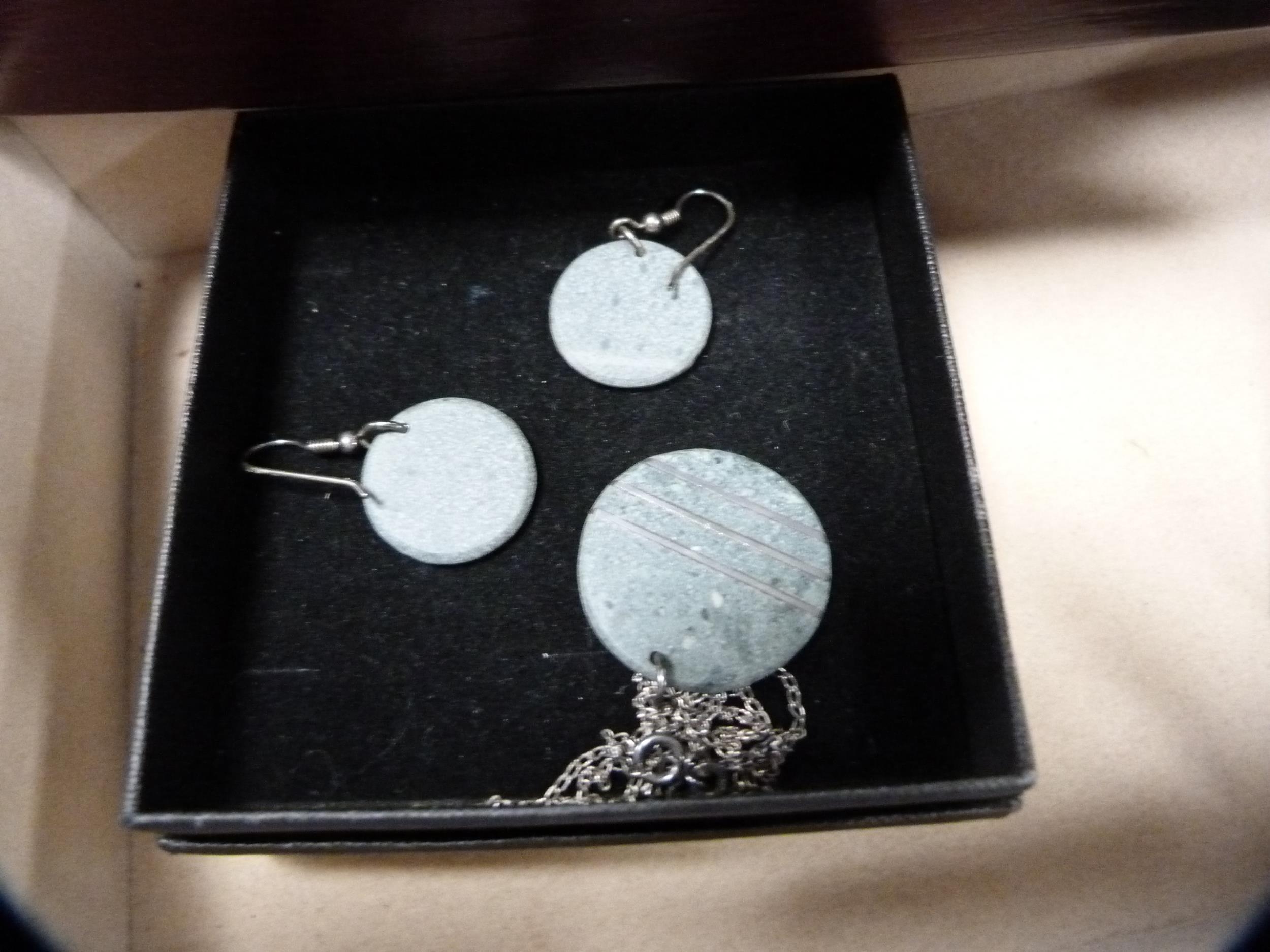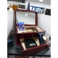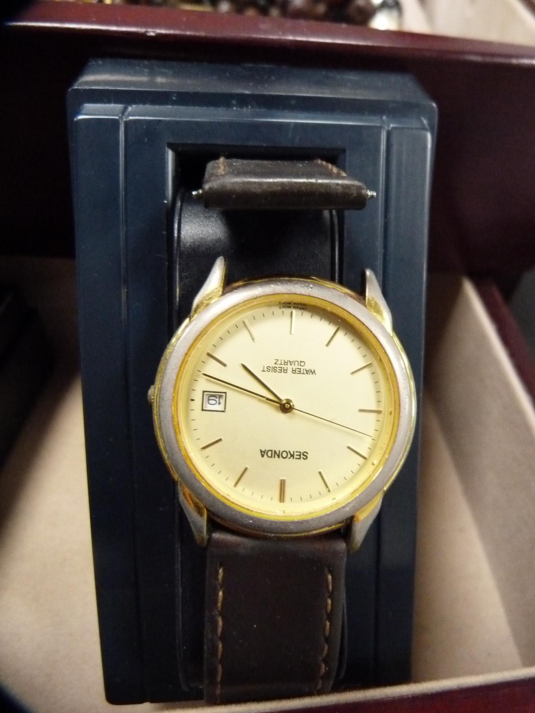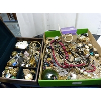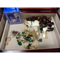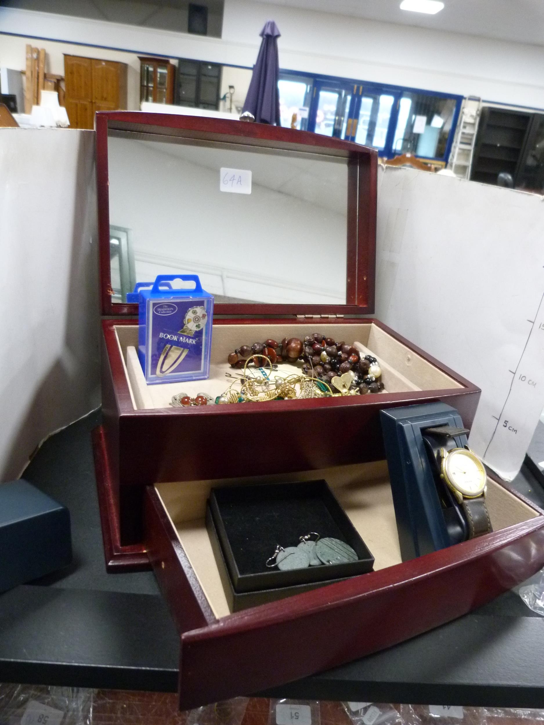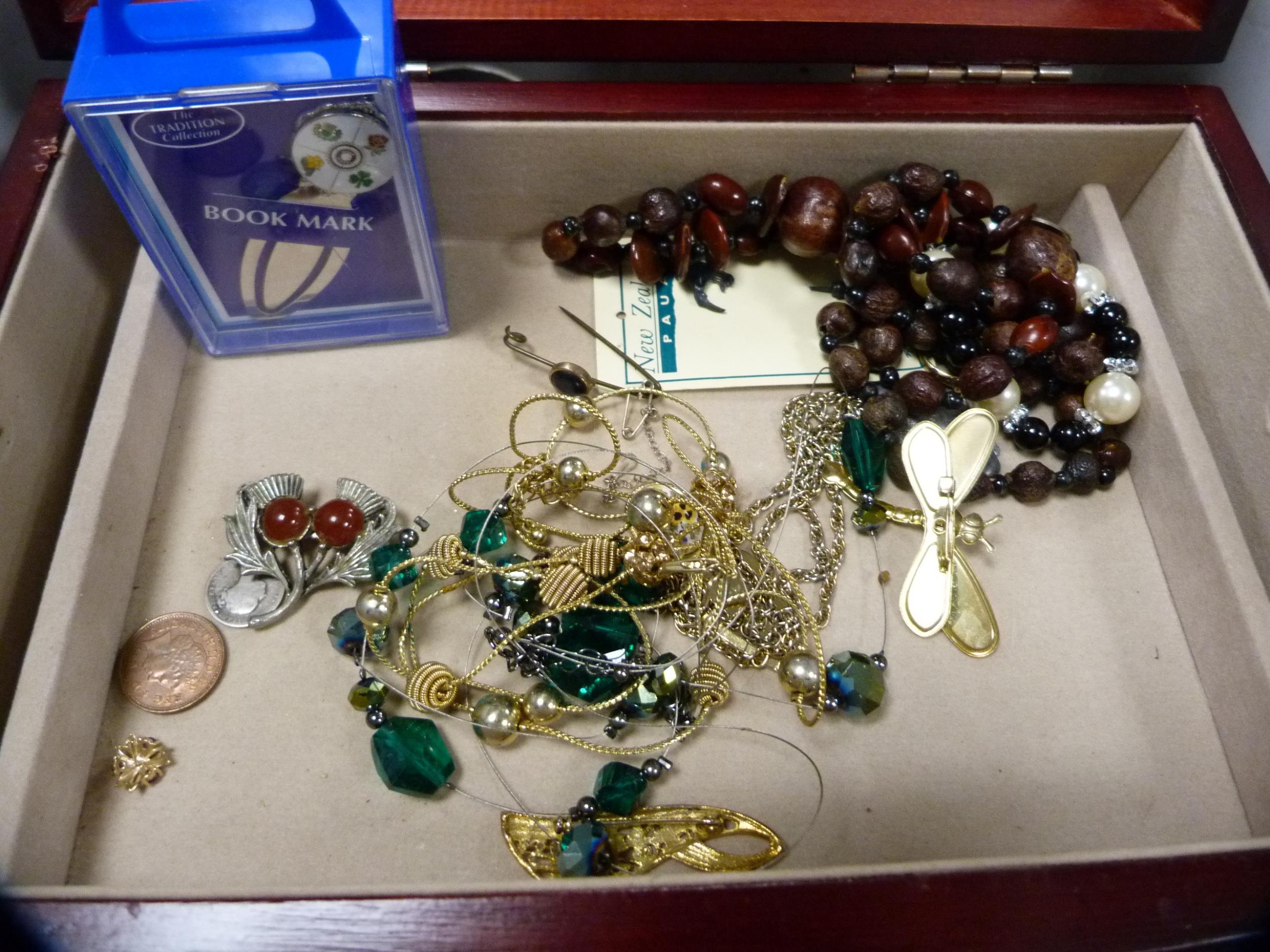 Jewellery box containing a small 9ct gold cross pendant, costume jewellery, Sekonda wristwatch, bead necklaces, brooches etc.