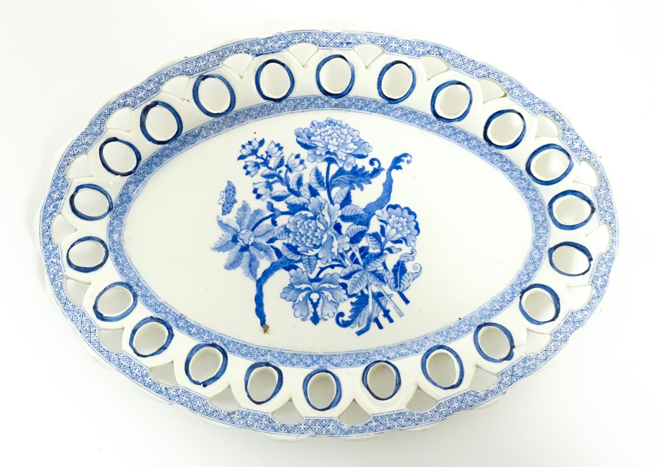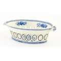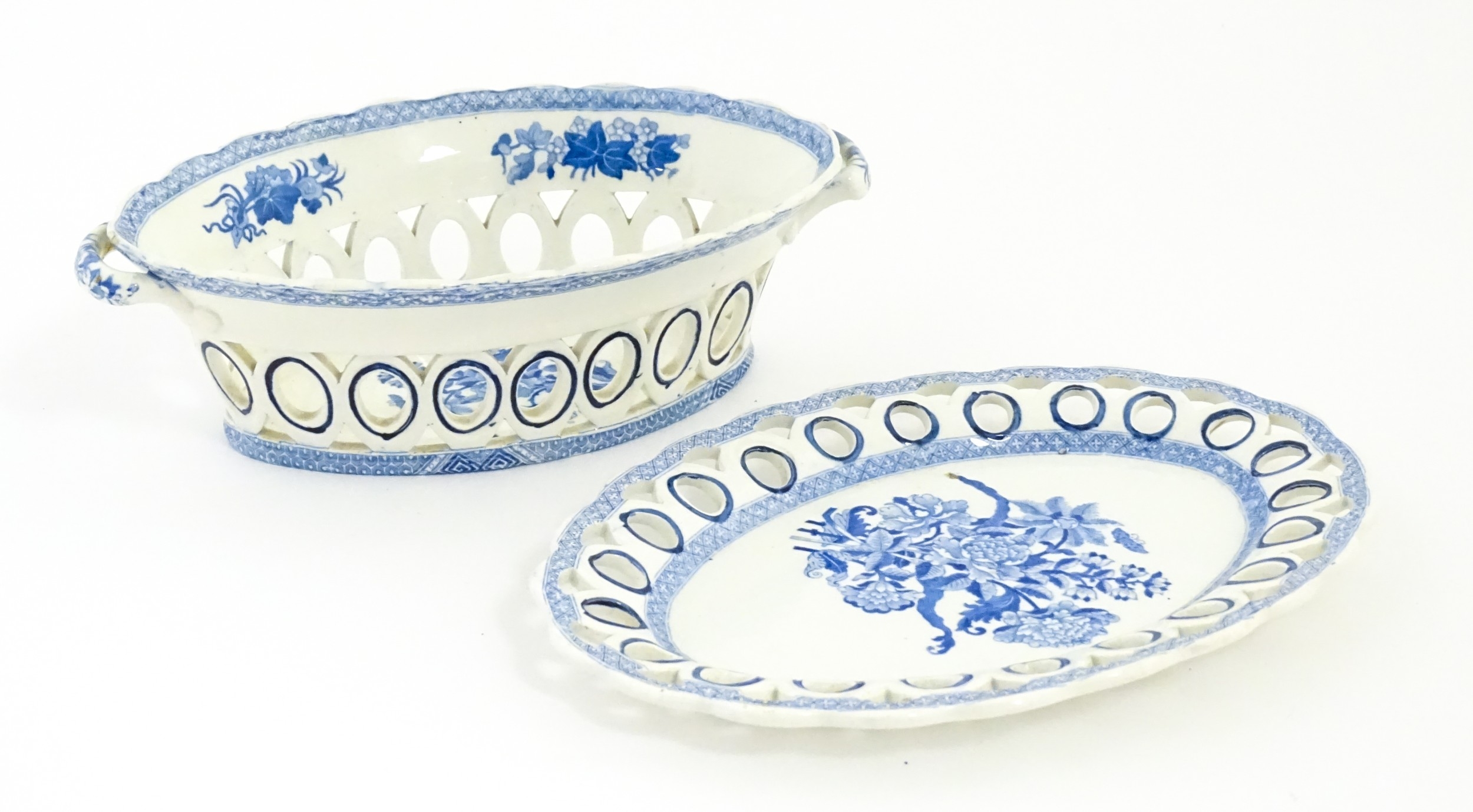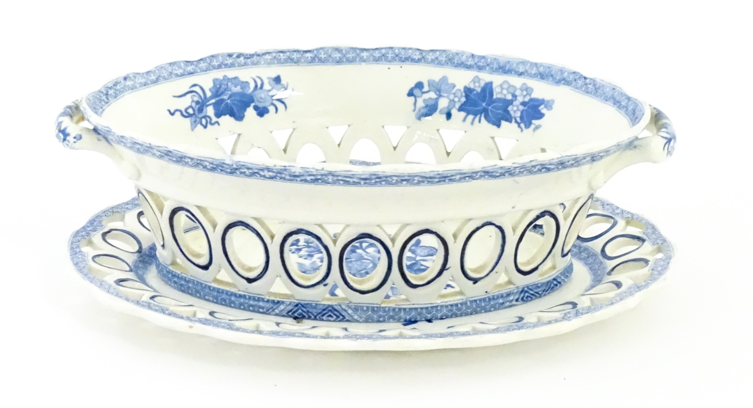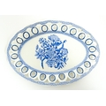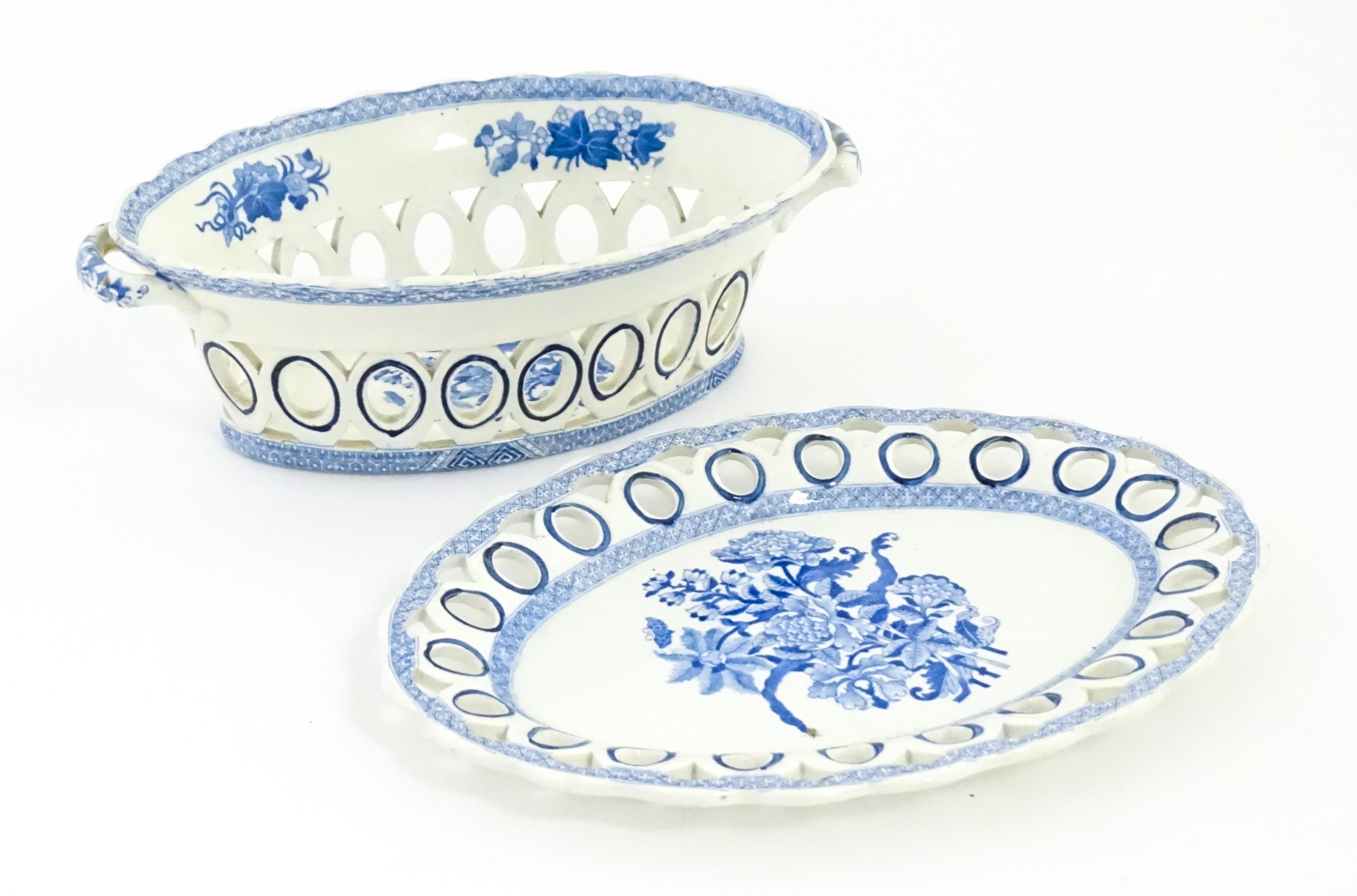 A blue and white chestnut basket and stand with pierced decoration and floral detail. Possibly Spode. Approx. 8 3/4" wide (2)