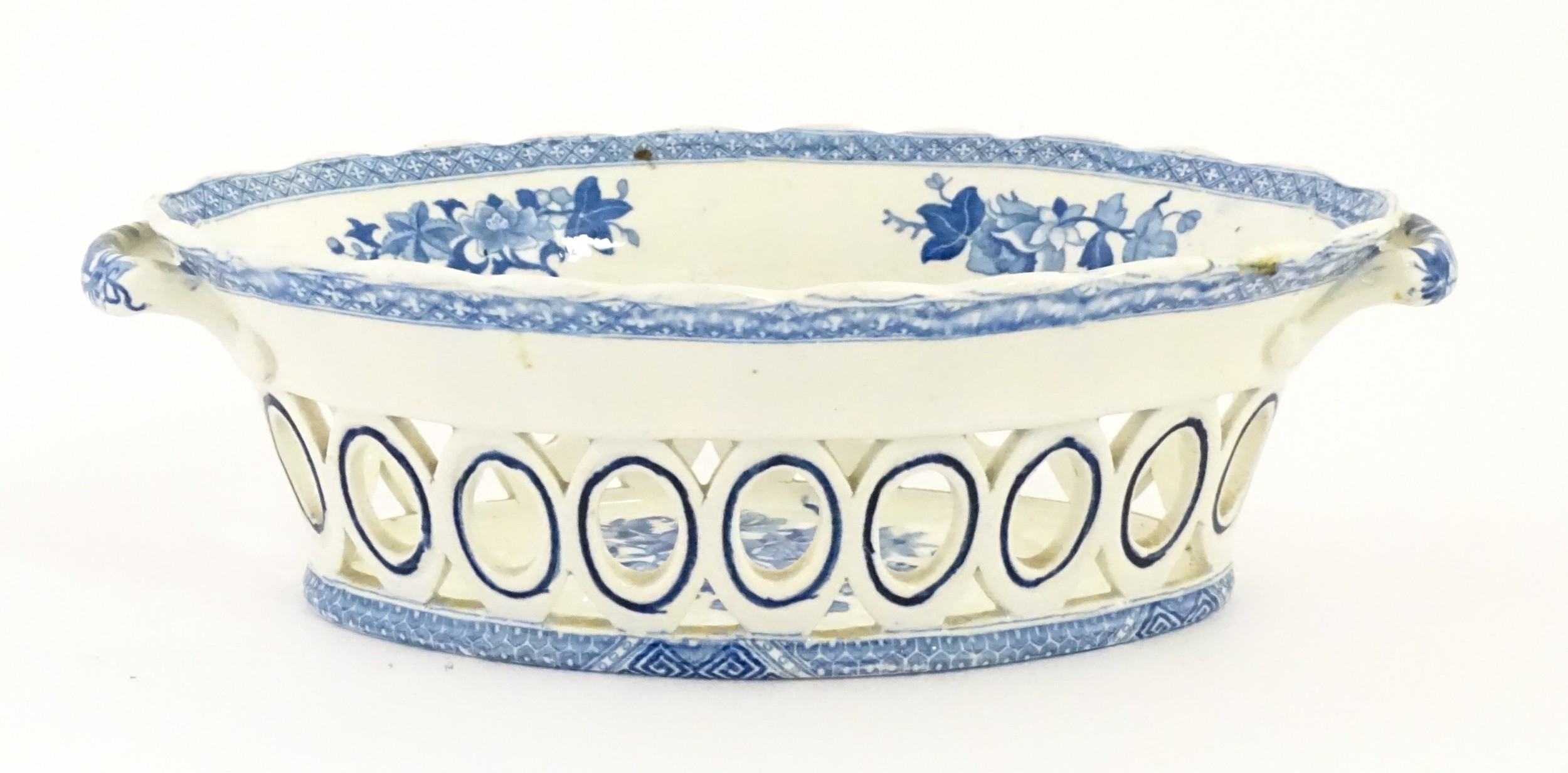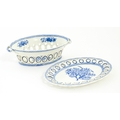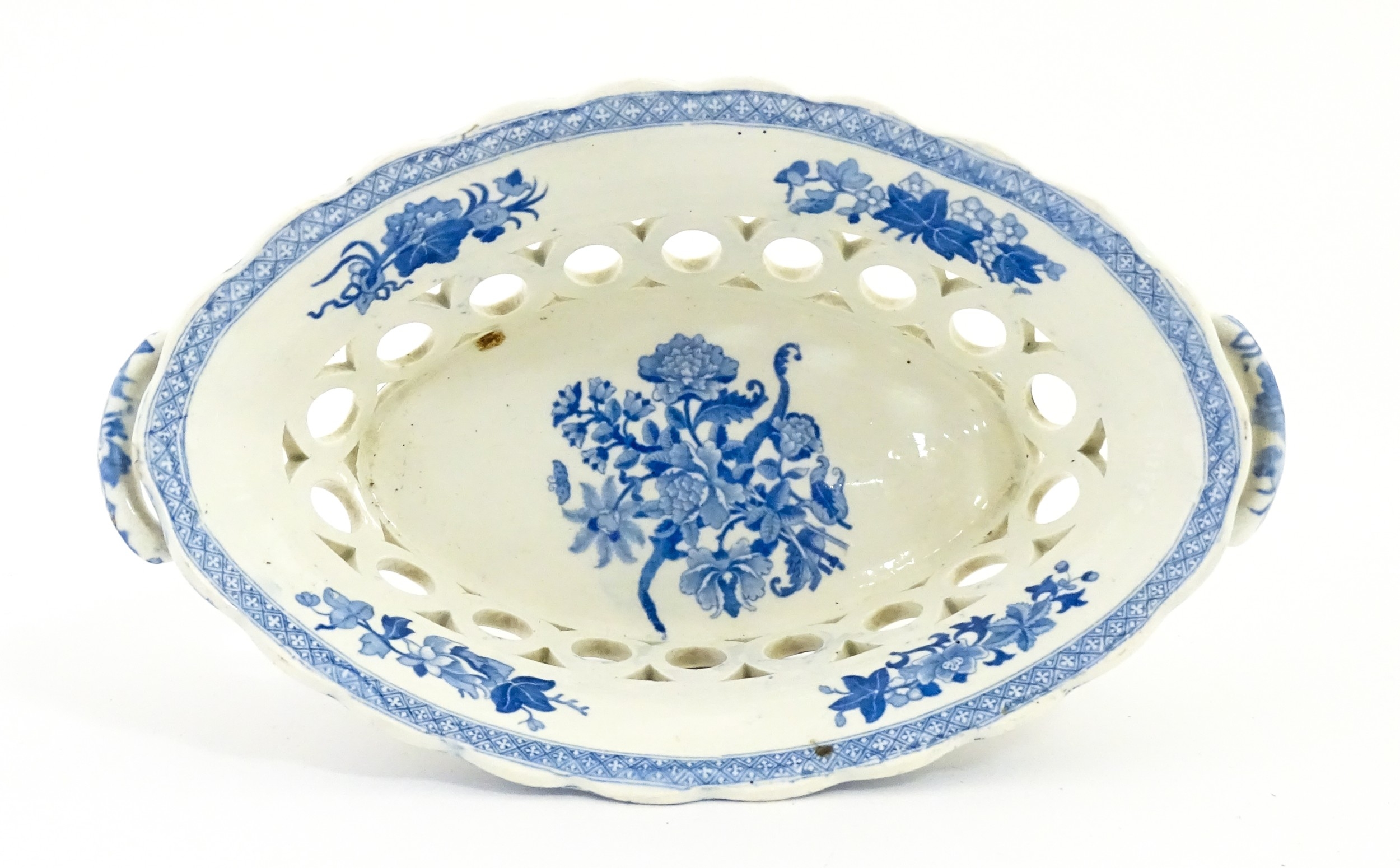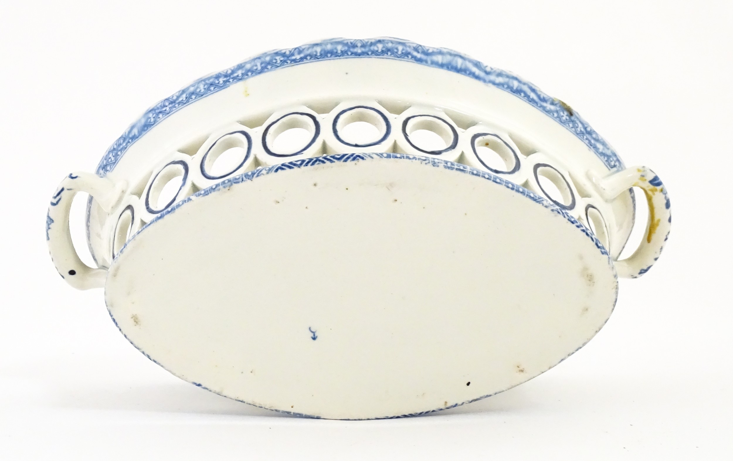 A blue and white chestnut basket and stand with pierced decoration and floral detail. Possibly Spode. Approx. 8 3/4" wide (2)