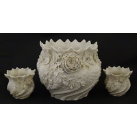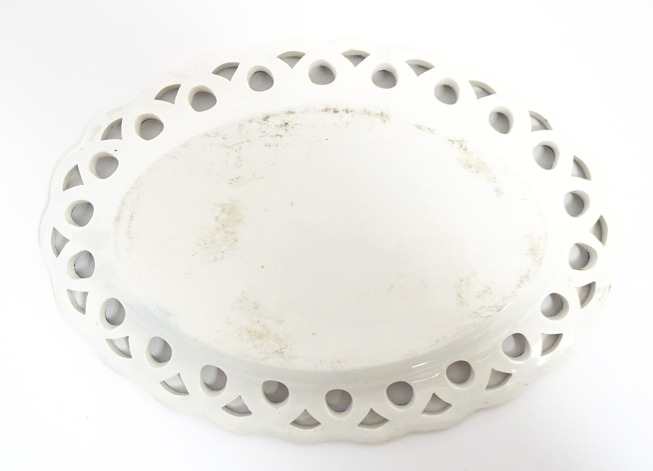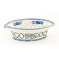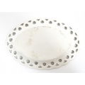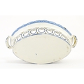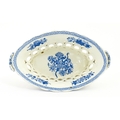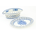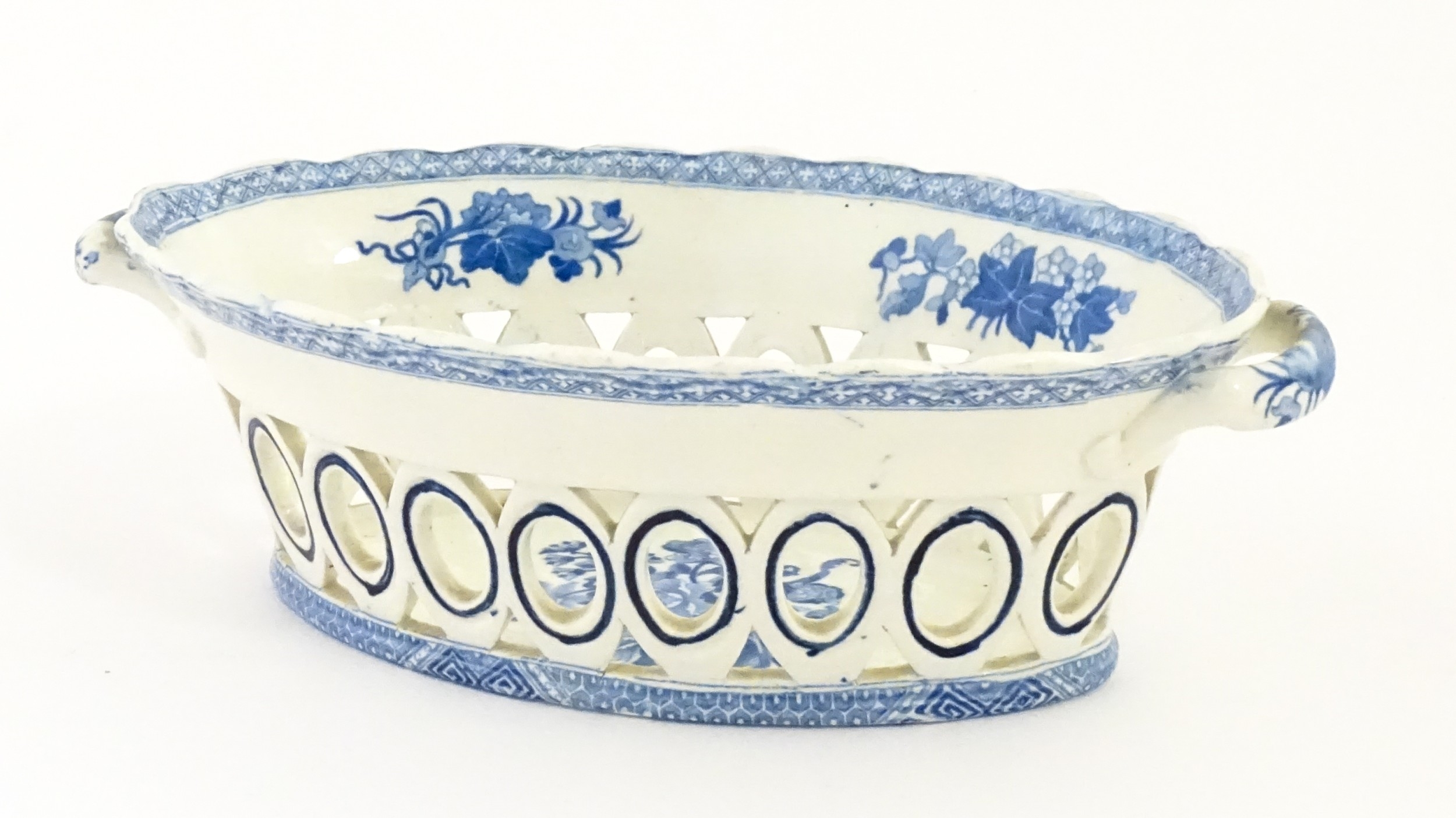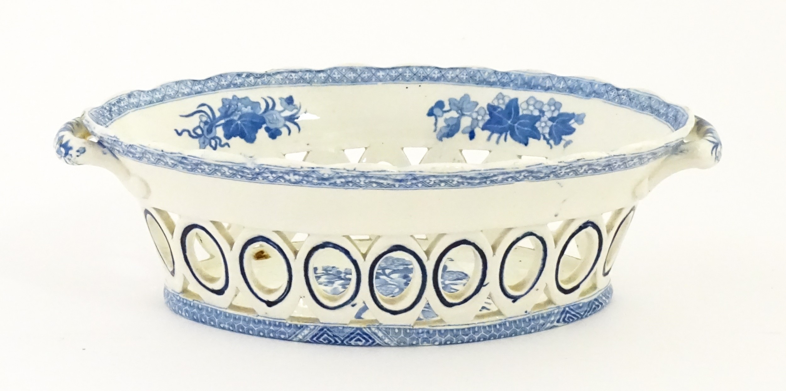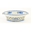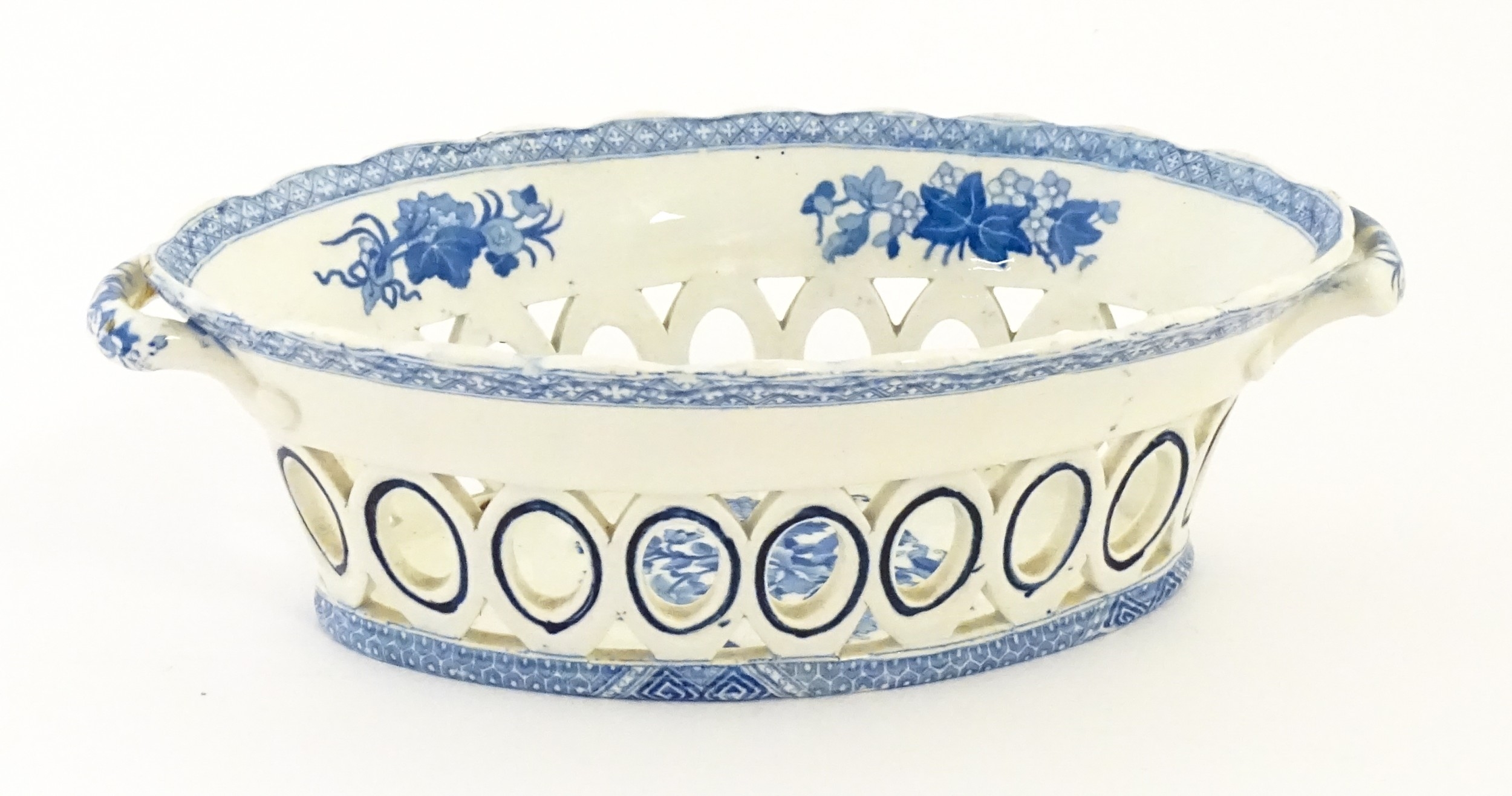 A blue and white chestnut basket and stand with pierced decoration and floral detail. Possibly Spode. Approx. 8 3/4" wide (2)