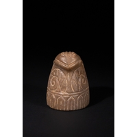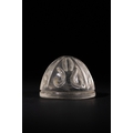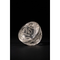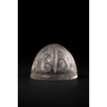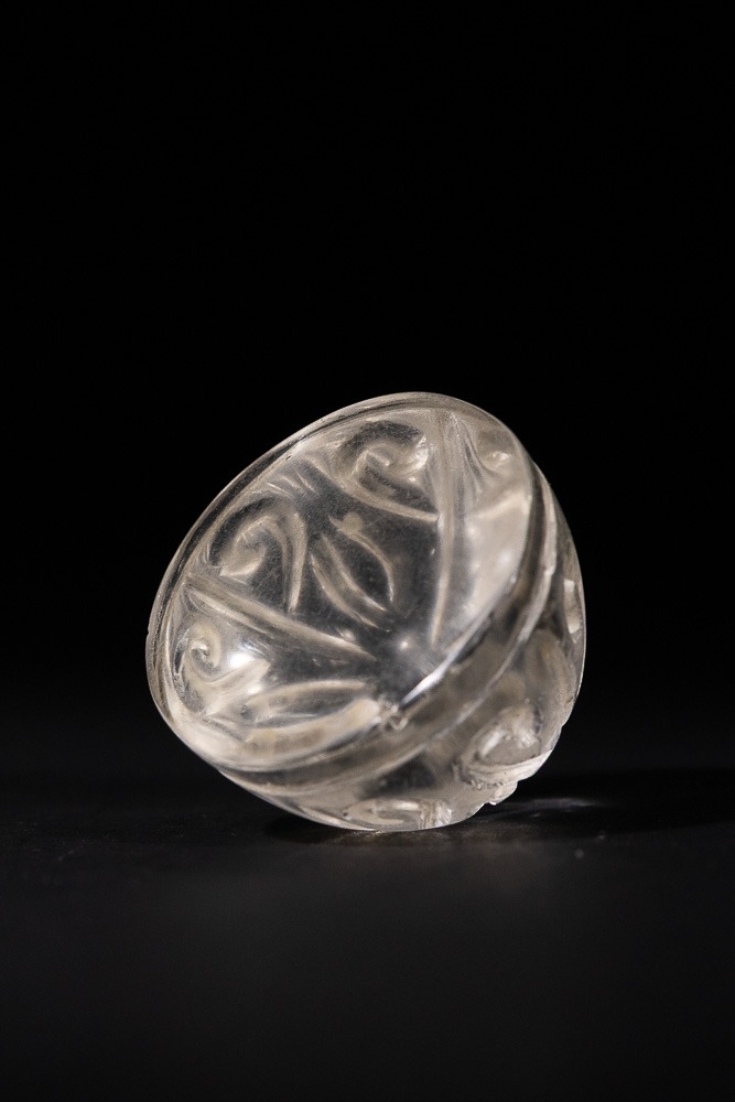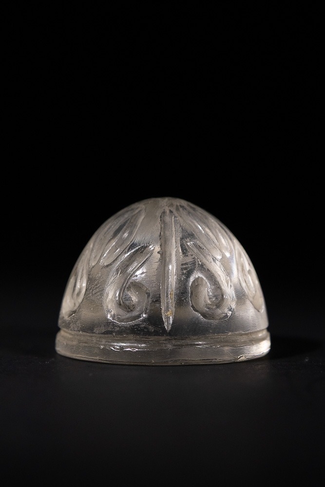 A Fatimid Carved Rock Crystal Chess Piece, Possibly 9th/10th Century - A Fatimid carved rock crystal chess piece, Possibly 9th/10th Century. This small, domed object, likely a finial or decorative element, is fashioned from clear, colorless rock crystal. Its convex surface is intricately carved with a radiating, symmetrical pattern of curvilinear motifs, reminiscent of foliate or scroll designs, extending to a plain, flat base.