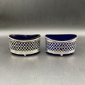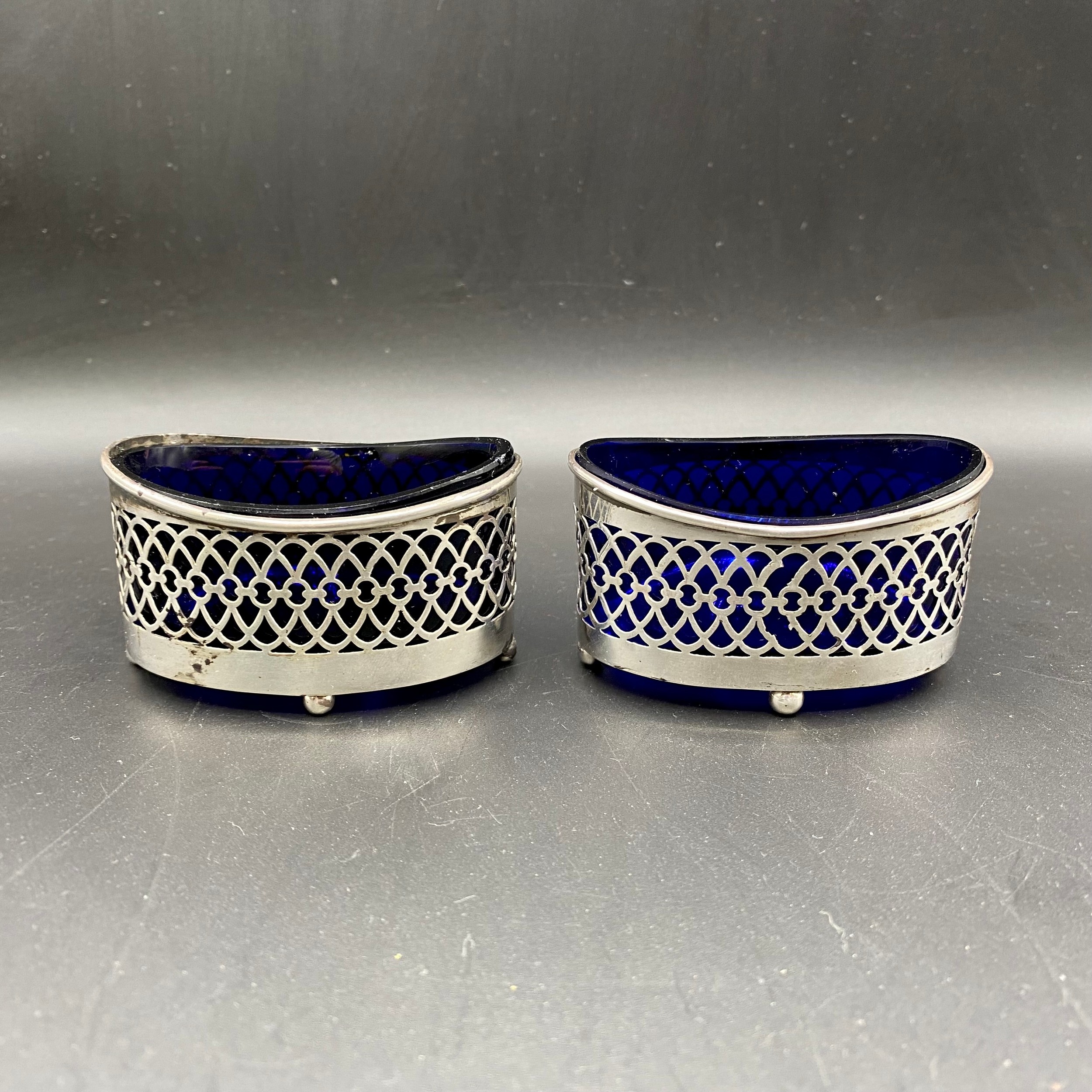 Two sterling silver salts/trinket pots with cobalt blue glass liners. Hallmarks for Birmingham 1902 by C E Williams.