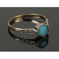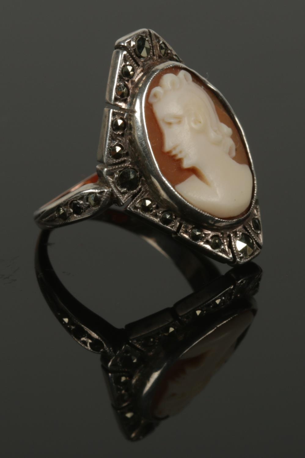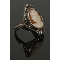 A 9ct gold and silver marcasite cameo ring. Size