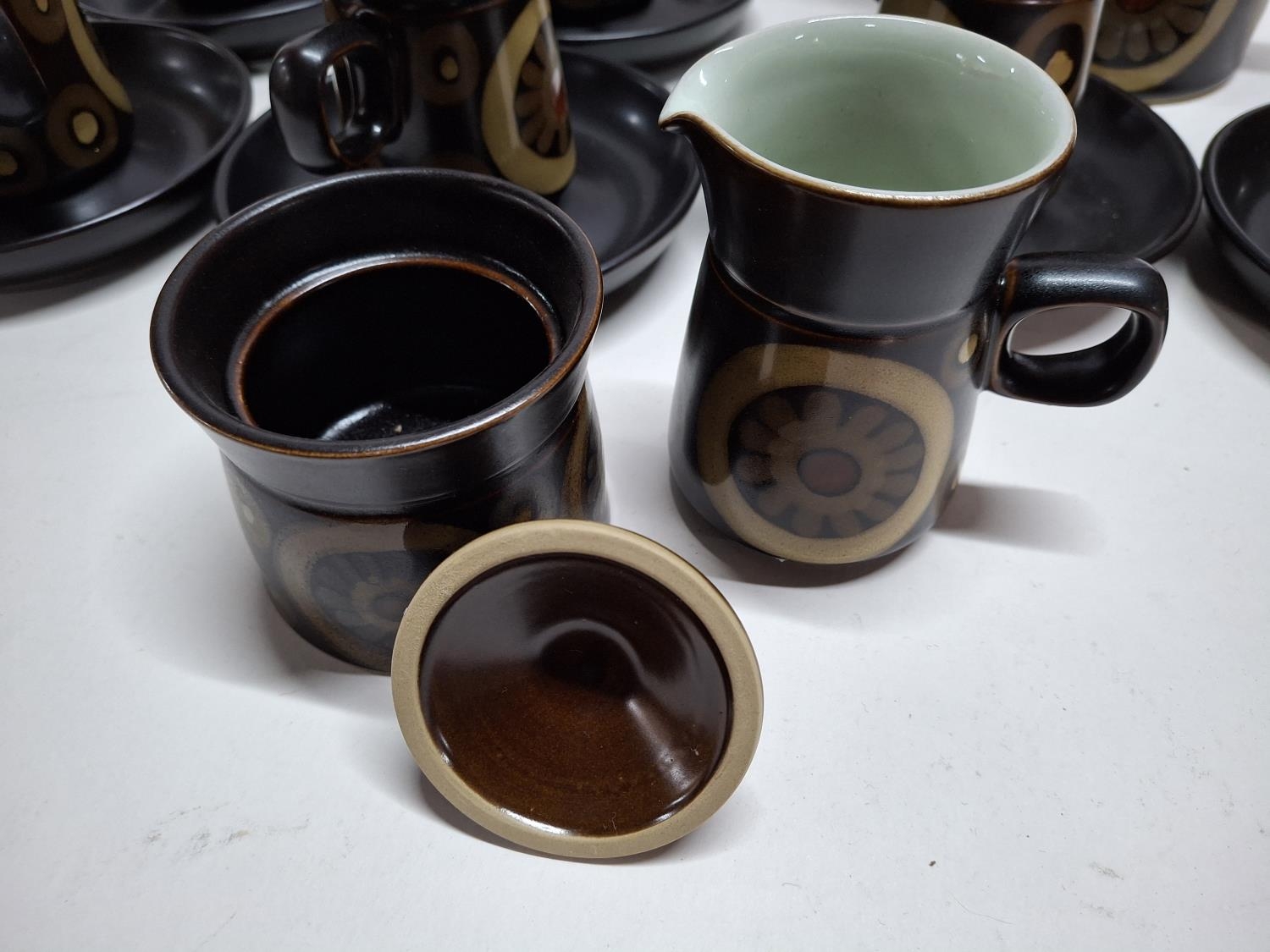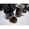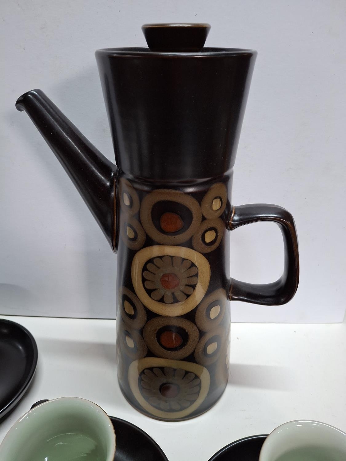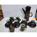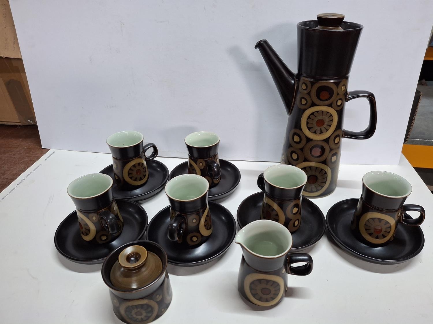 Retro Denby coffee set with tall coffee pot, lidded sugar bowl, cream jug and six cups and saucers