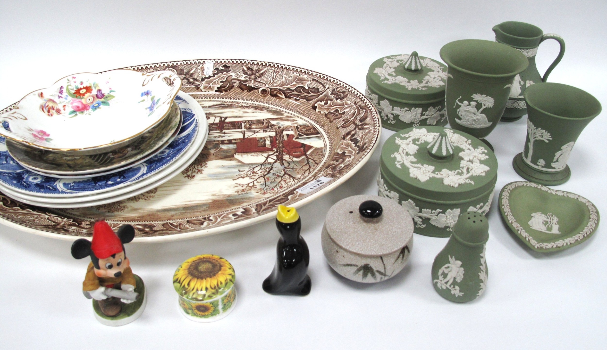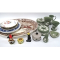 Johnson's Historic America Meat Plate (rim chip), Wedgwood green Jasper tinkets, pie funnel:- One Box.