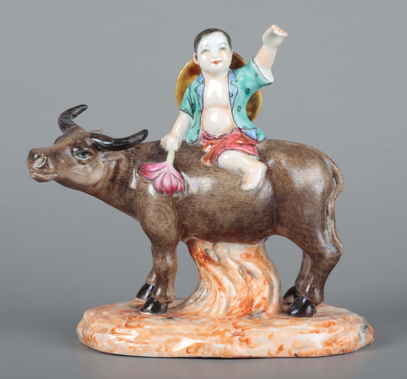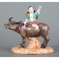 A CHINESE PORCELAIN FAMILLE ROSE GROUP OF A HERDBOY SEATED ON A BUFFALO