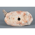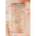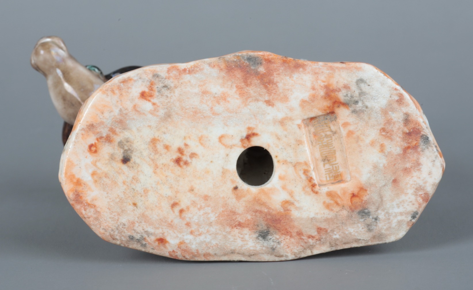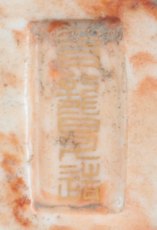 the base with a gilt seal mark in an impressed recess, the boy figured with left arm raised, on a naturalistic ground, 12.5cm high x 12.5cm wide
